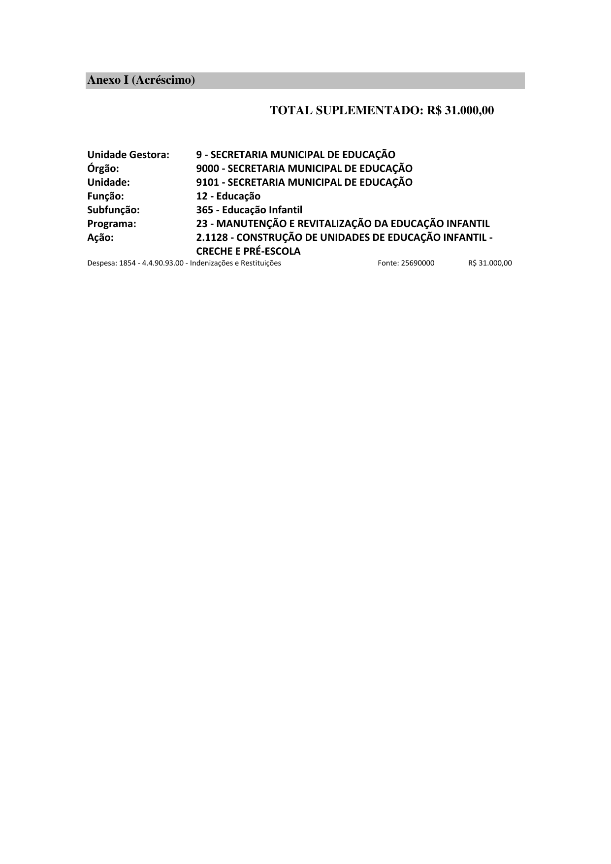 Art. 1º Fica aberto, no corrente exercício, Crédito Suplementar por Superávit Financeiro no valor de R$ 31.000,00 (trinta e um mil reais) às dotações especificadas no Anexo I deste Decreto.