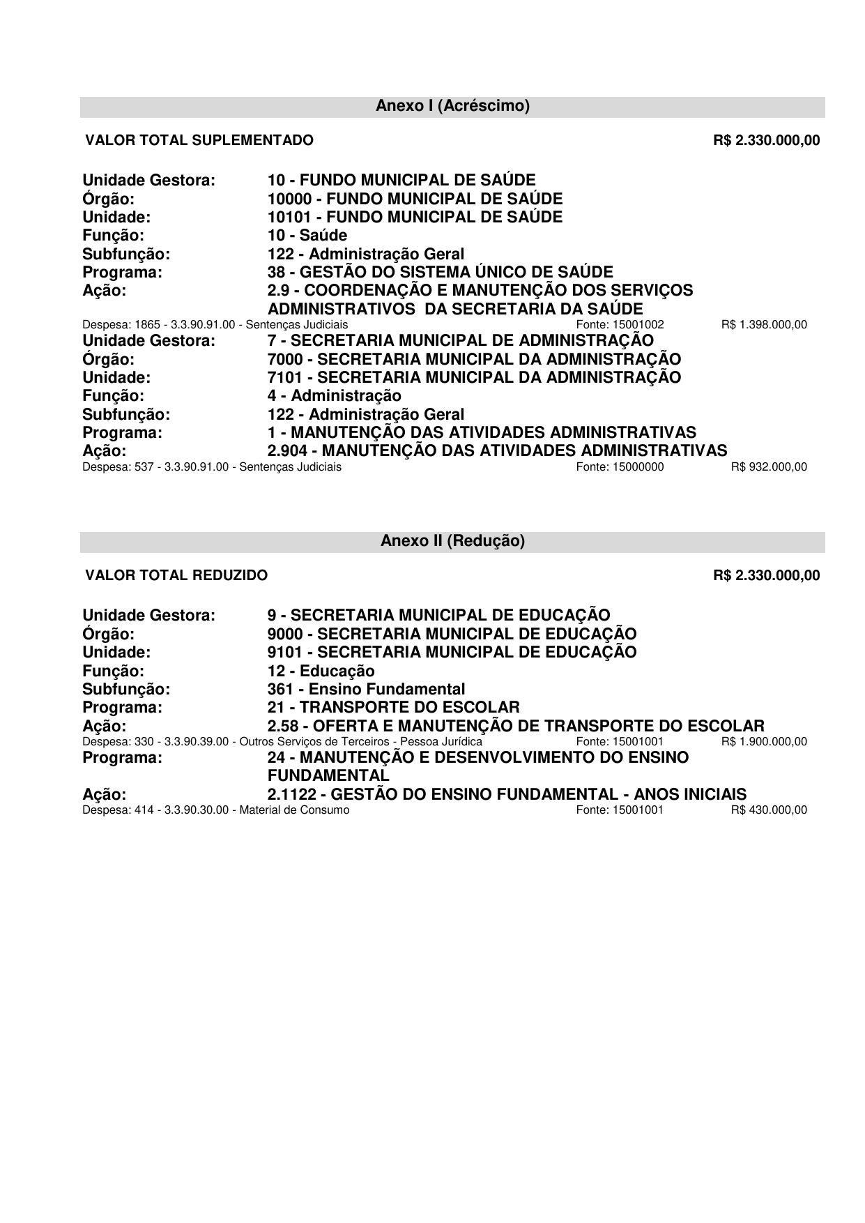 Art. 1º Fica aberto, no corrente exercício, Crédito Suplementar no valor de R$ 2.330.000,00 (dois milhões e trezentos e trinta mil reais) às dotações especificadas no Anexo I deste Decreto.