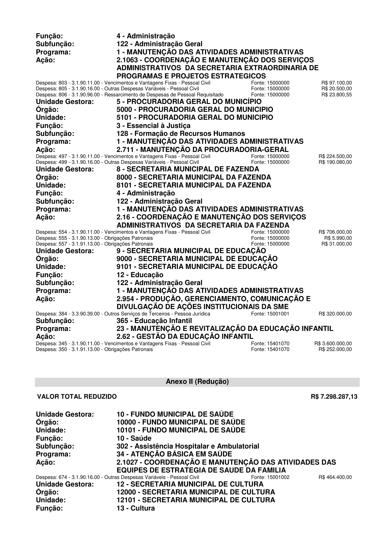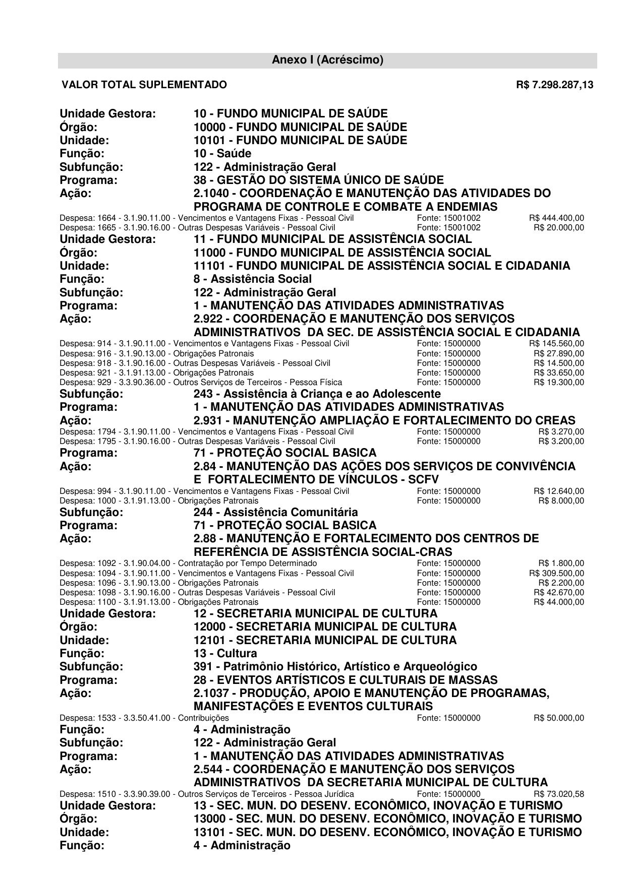 Art. 1º Fica aberto, no corrente exercício, Crédito Suplementar no valor de R$ 7.298.287,13 (sete milhões e duzentos e noventa e oito mil e duzentos e oitenta e sete reais e treze centavos) às dotações especificadas no Anexo I deste Decreto.