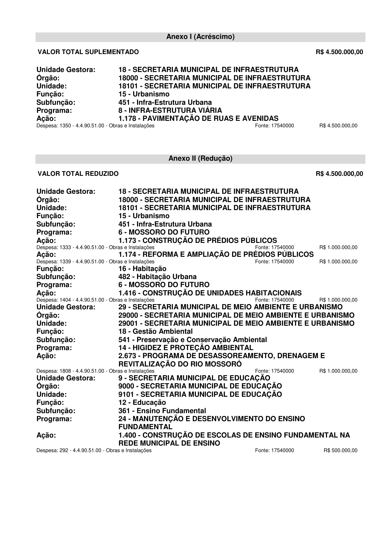 Art. 1º Fica aberto, no corrente exercício, Crédito Suplementar no valor de R$ 4.500.000,00 (quatro milhões e quinhentos mil reais) às dotações especificadas no Anexo I deste Decreto.