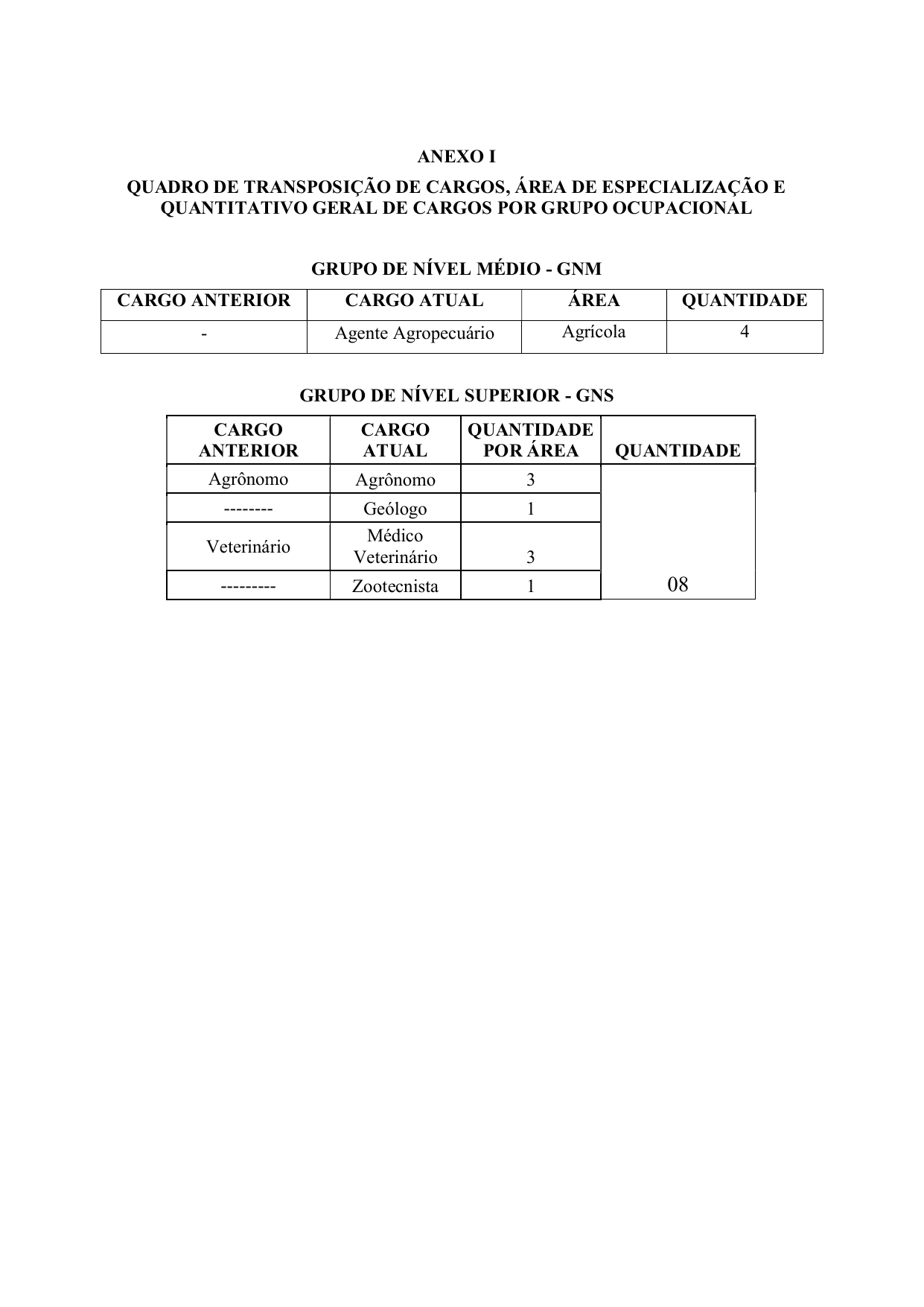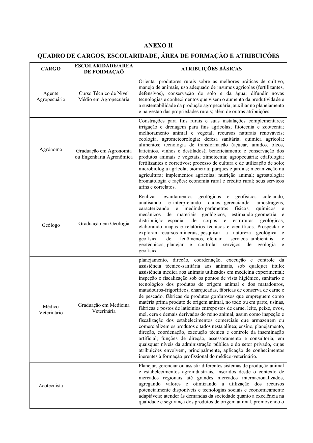 II - Grupo de Nível Superior - GNS: engloba cargos em que se exigem graduação em curso superior, comprovada com a apresentação de diploma expedido por instituição de ensino superior reconhecida pelo Ministério da Educação - MEC para o desempenho de funções administrativas e burocráticas ou de caráter técnico-científico, compreendendo os cargos de Agrônomo, Geólogo, Médico Veterinário e Zootenista, nos quantitativos apontados no Anexo I desta Lei Complementar.