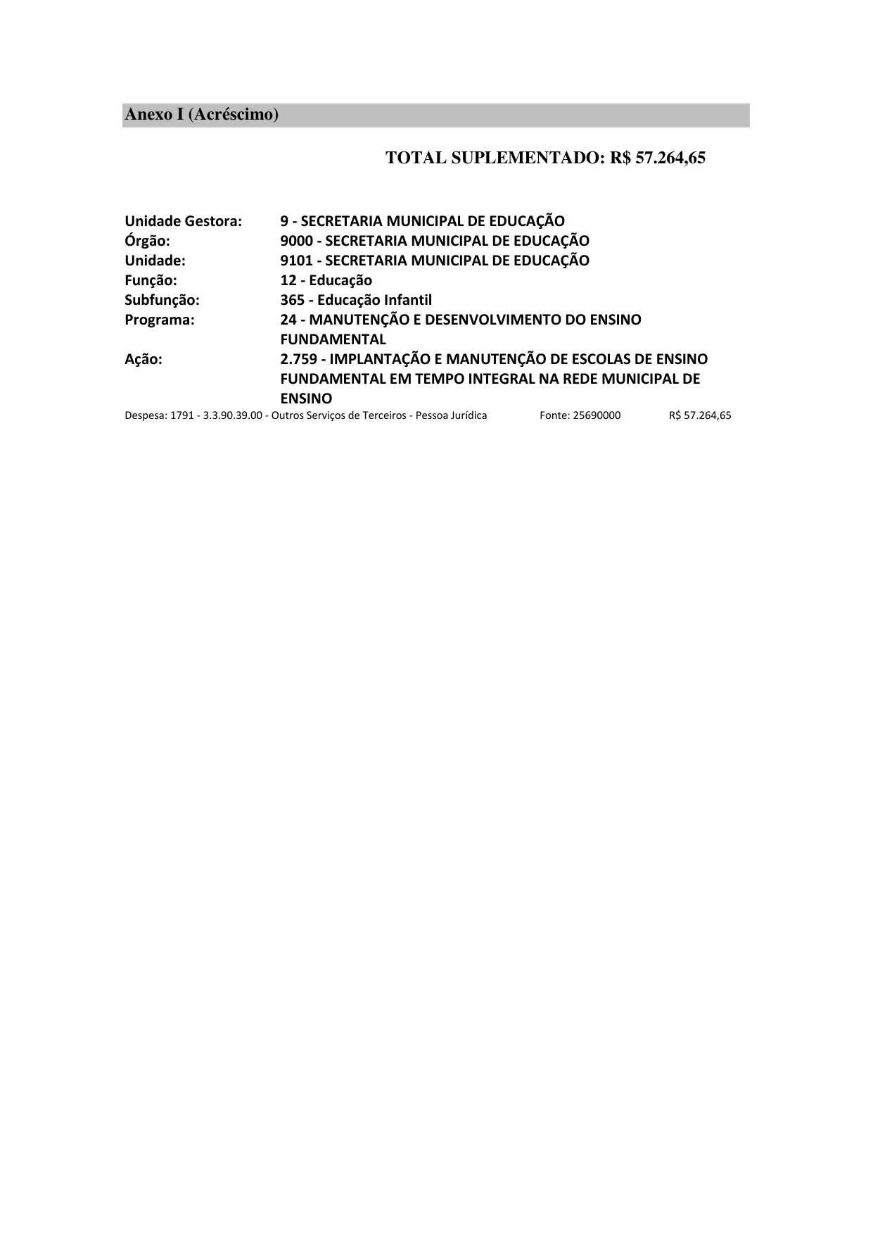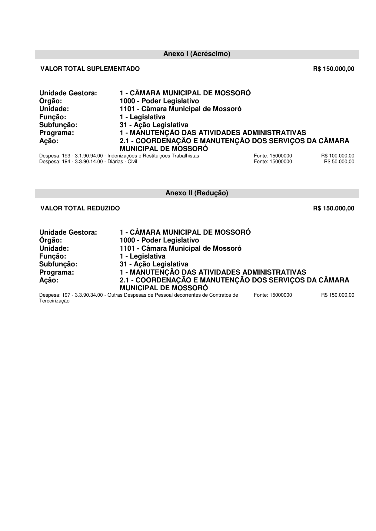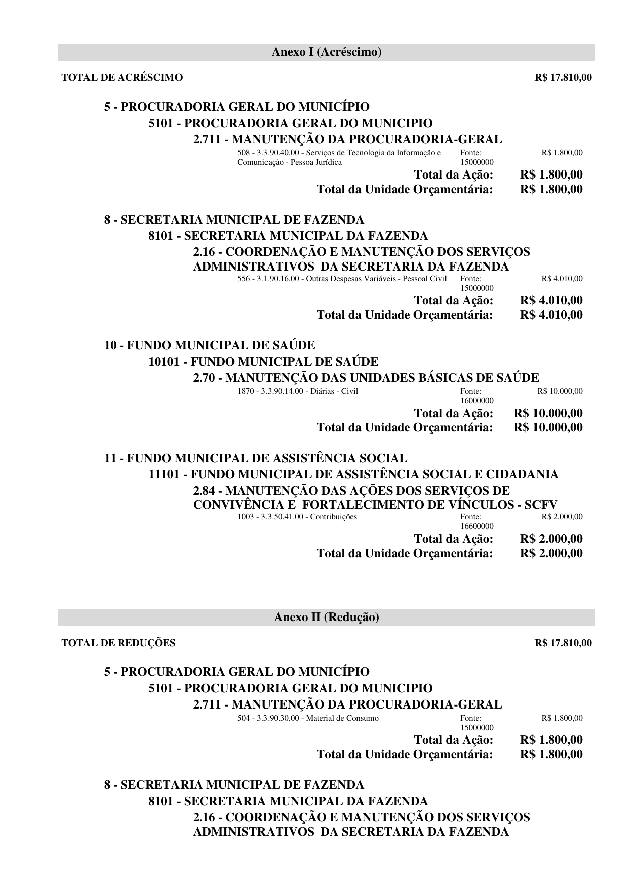 Art. 2º Os recursos necessários à modificação orçamentária de que trata o artigo anterior são oriundos da anulação, de iguais importâncias, da dotação discriminada no Anexo II deste Ato.