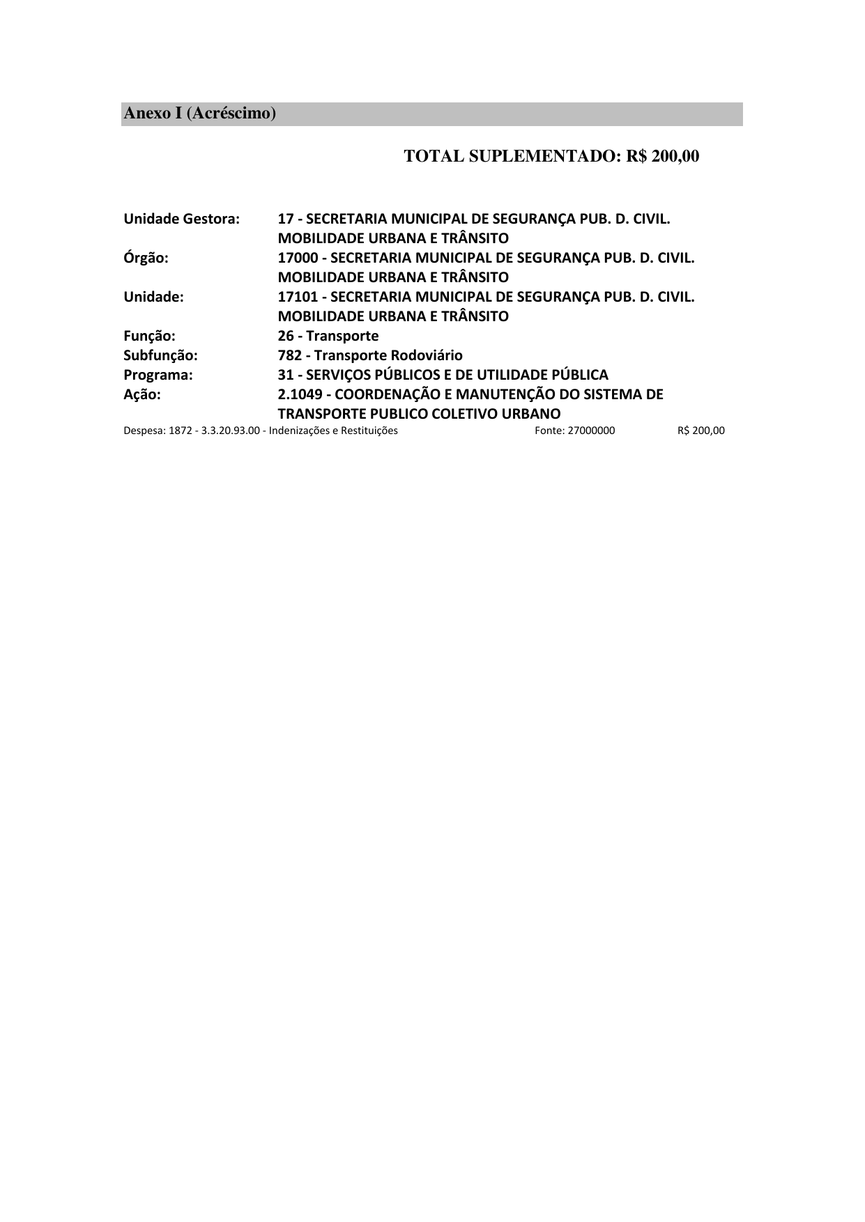 Art. 1º Fica aberto, no corrente exercício, Crédito Suplementar por Superávit Financeiro no valor de R$ 200,00 (duzentos reais) às dotações especificadas no Anexo I deste Decreto.