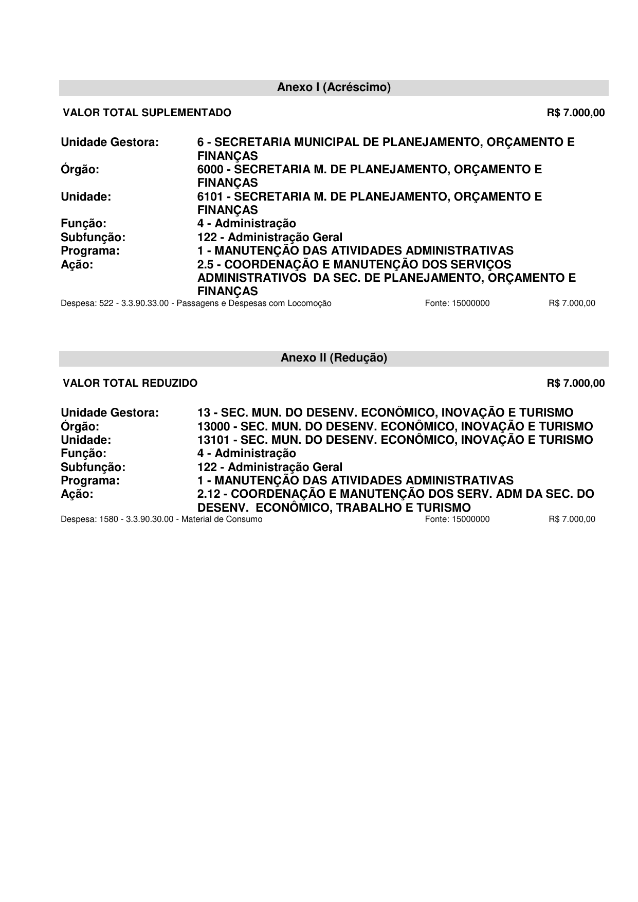 Art. 1º Fica aberto, no corrente exercício, Crédito Suplementar no valor de R$ 7.000,00 (sete mil reais) às dotações especificadas no Anexo I deste Decreto.