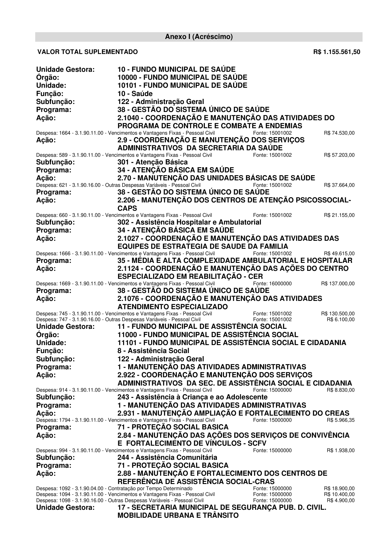 Art. 1º Fica aberto, no corrente exercício, Crédito Suplementar no valor de R$ 1.155.561,50 (um milhão e cento e cinquenta e cinco mil e quinhentos e sessenta e um reais e cinquenta centavos) às dotações especificadas no Anexo I deste Decreto.