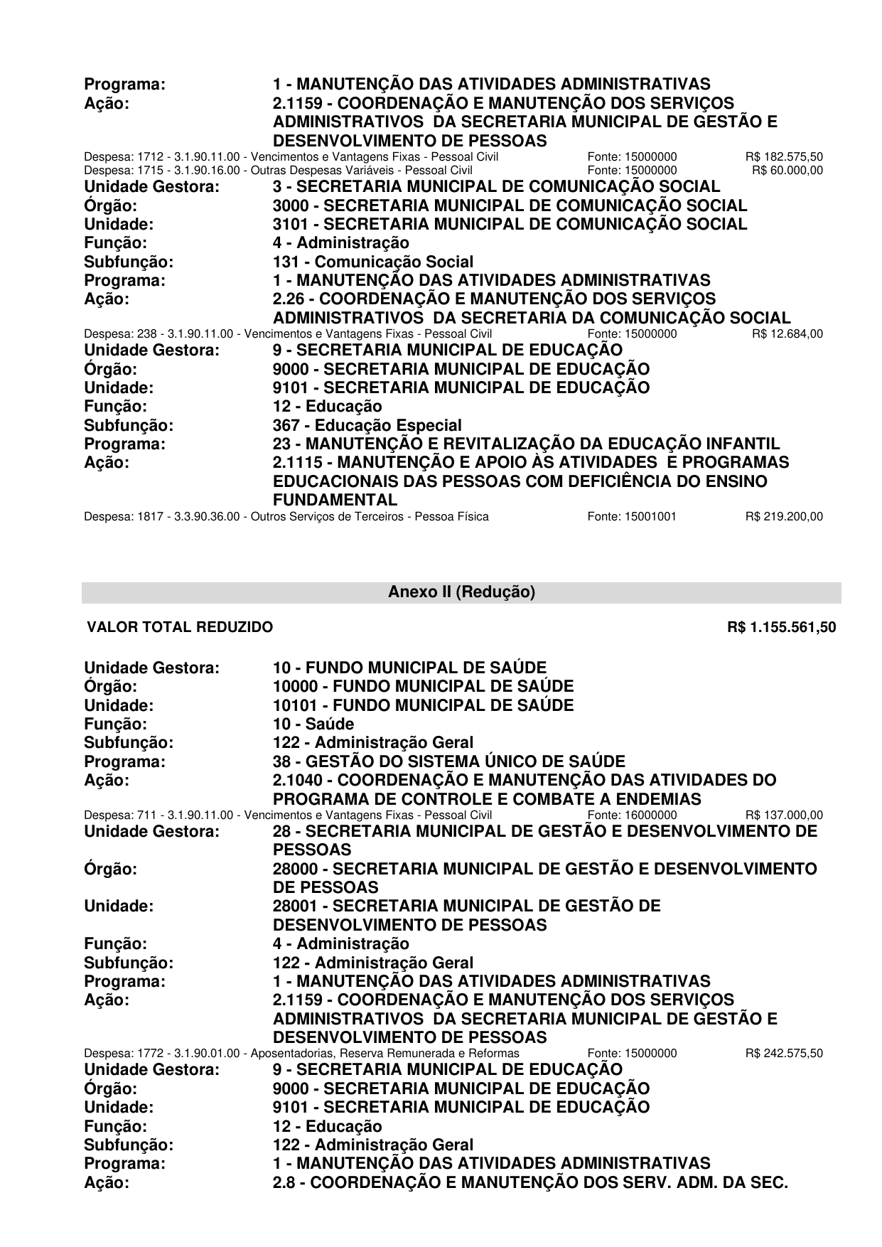 Art. 2º Constitui fonte de recursos para fazer face ao crédito de que trata o artigo anterior, a anulação, em igual valor, das dotações orçamentárias discriminadas no Anexo II deste Decreto.