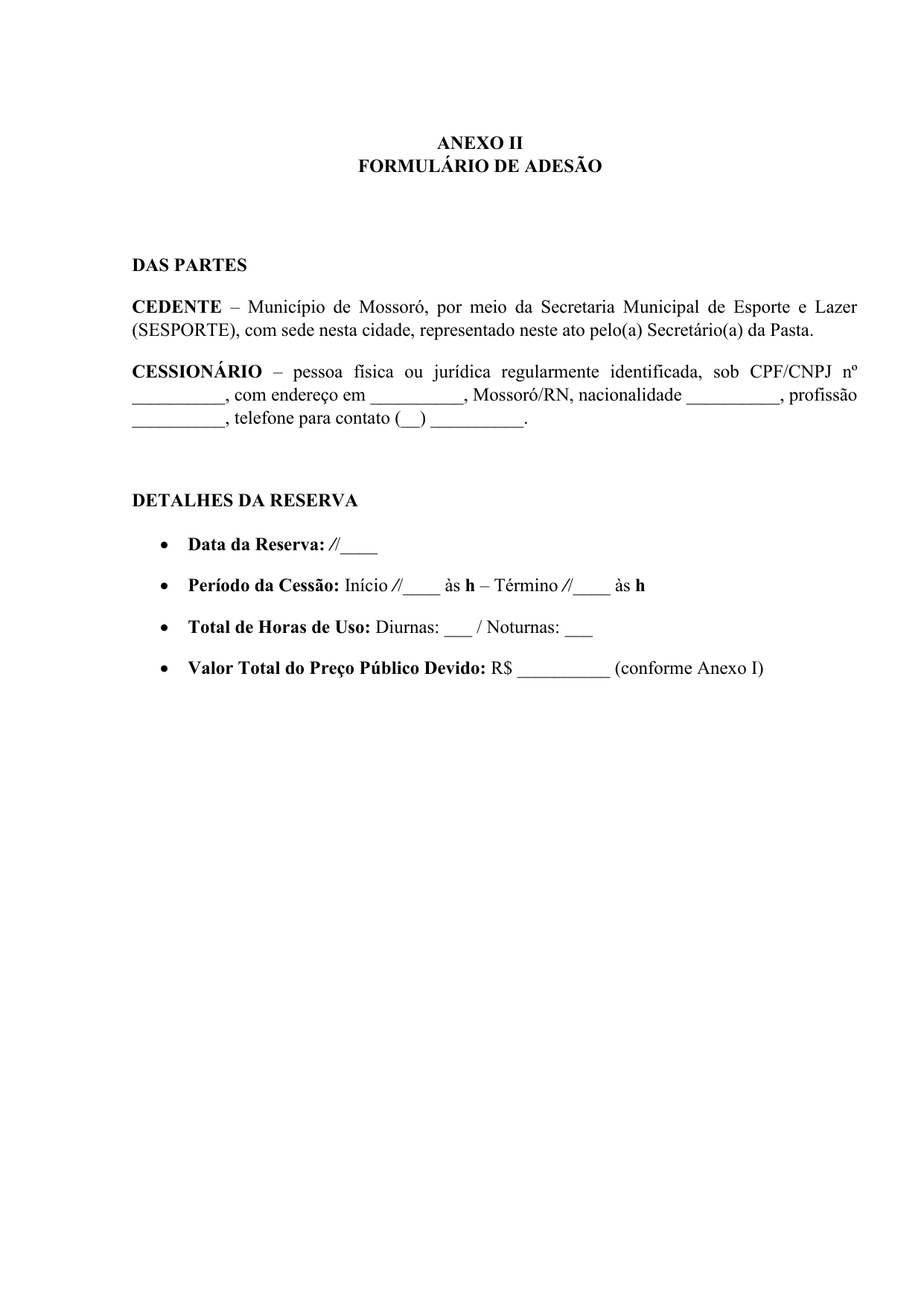 Art. 6° Fica o Cessionário obrigado a assinar, no ato da solicitação da reserva, o Formulário de Adesão, conforme modelo constante do Anexo II, e o Termo de Ciência e Responsabilidade, conforme modelo constante do Anexo III, como condição indispensável à formalização da cessão de uso.