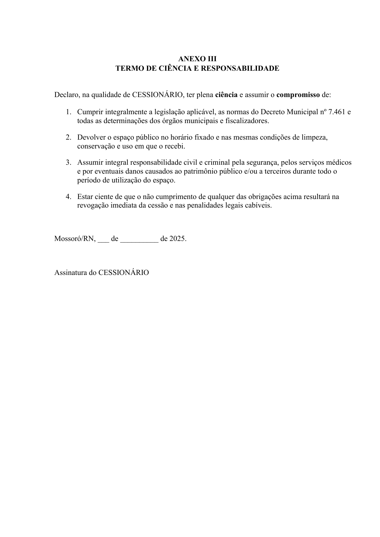 Art. 8º O cessionário deverá declarar ciência e compromisso de cumprir a legislação aplicável, assim como as normas e recomendações expedidas pelos órgãos municipais competentes e demais órgãos fiscalizadores.