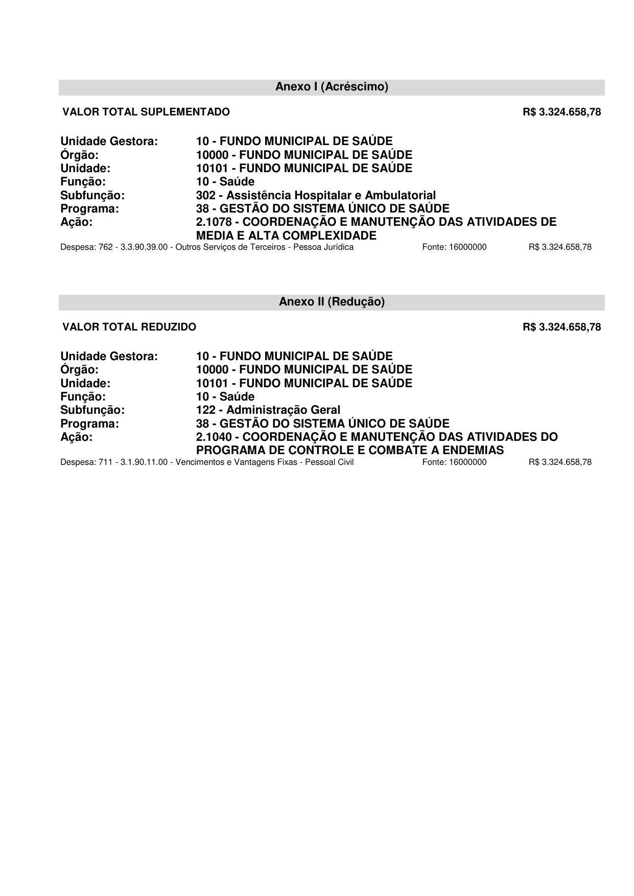 Art. 1º Fica aberto, no corrente exercício, Crédito Suplementar no valor de R$ 3.324.658,78 (três milhões e trezentos e vinte e quatro mil e seiscentos e cinquenta e oito reais e setenta e oito centavos) às dotações especificadas no Anexo I deste Decreto.