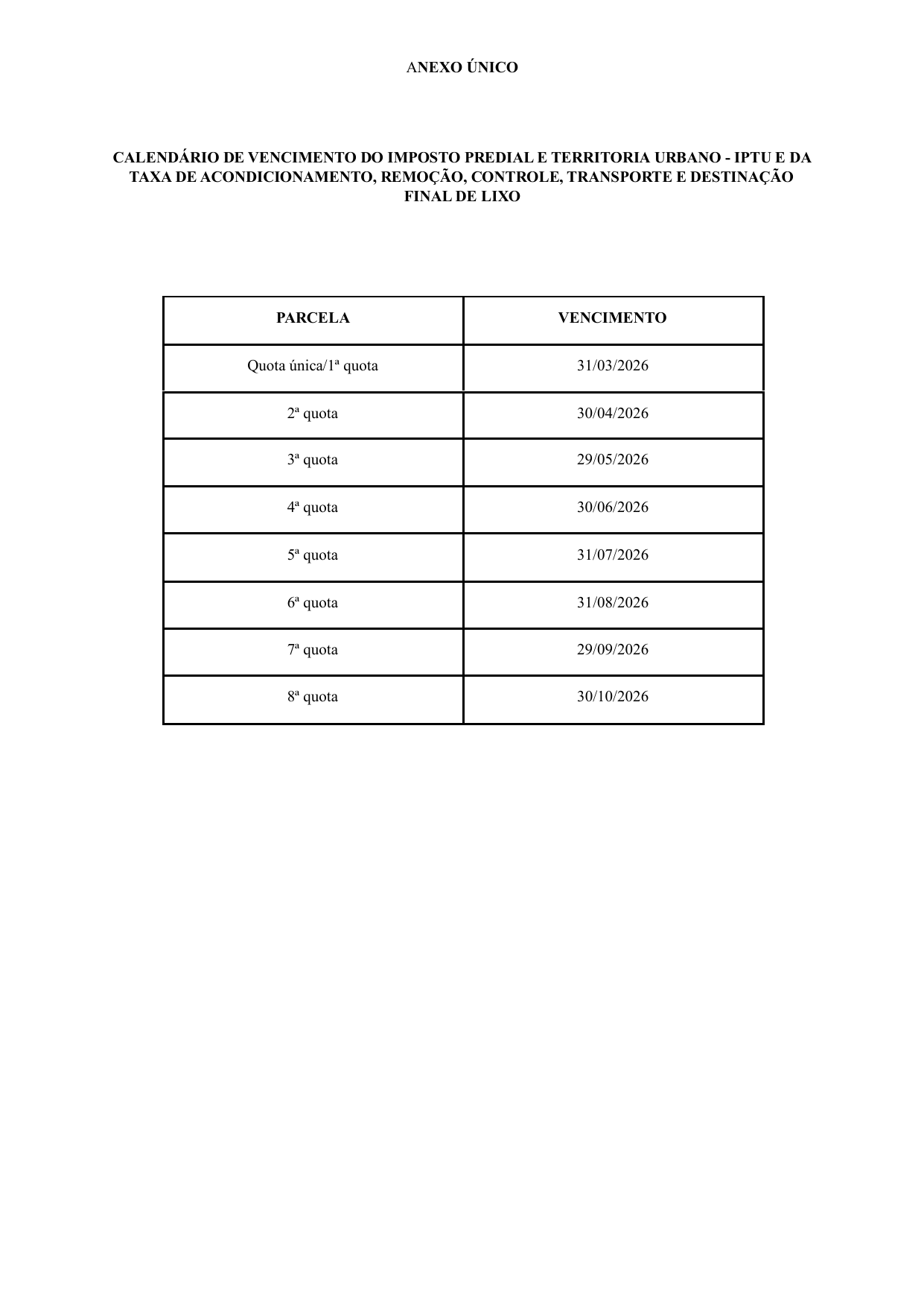 Art. 1º O Calendário de Vencimento do Imposto Predial e Territorial Urbano – IPTU e da Taxa de Acondicionamento, Remoção, Controle, Transporte e Destinação Final de Lixo, lançados de ofício e conjuntamente, nos termos dispostos nos arts. 25 e 180, da Lei Complementar nº 096, de 12 de dezembro de 2013 - Código Tributário do Município de Mossoró, correspondente ao exercício de 2026, fica estabelecido nos termos do Anexo Único deste Decreto.
