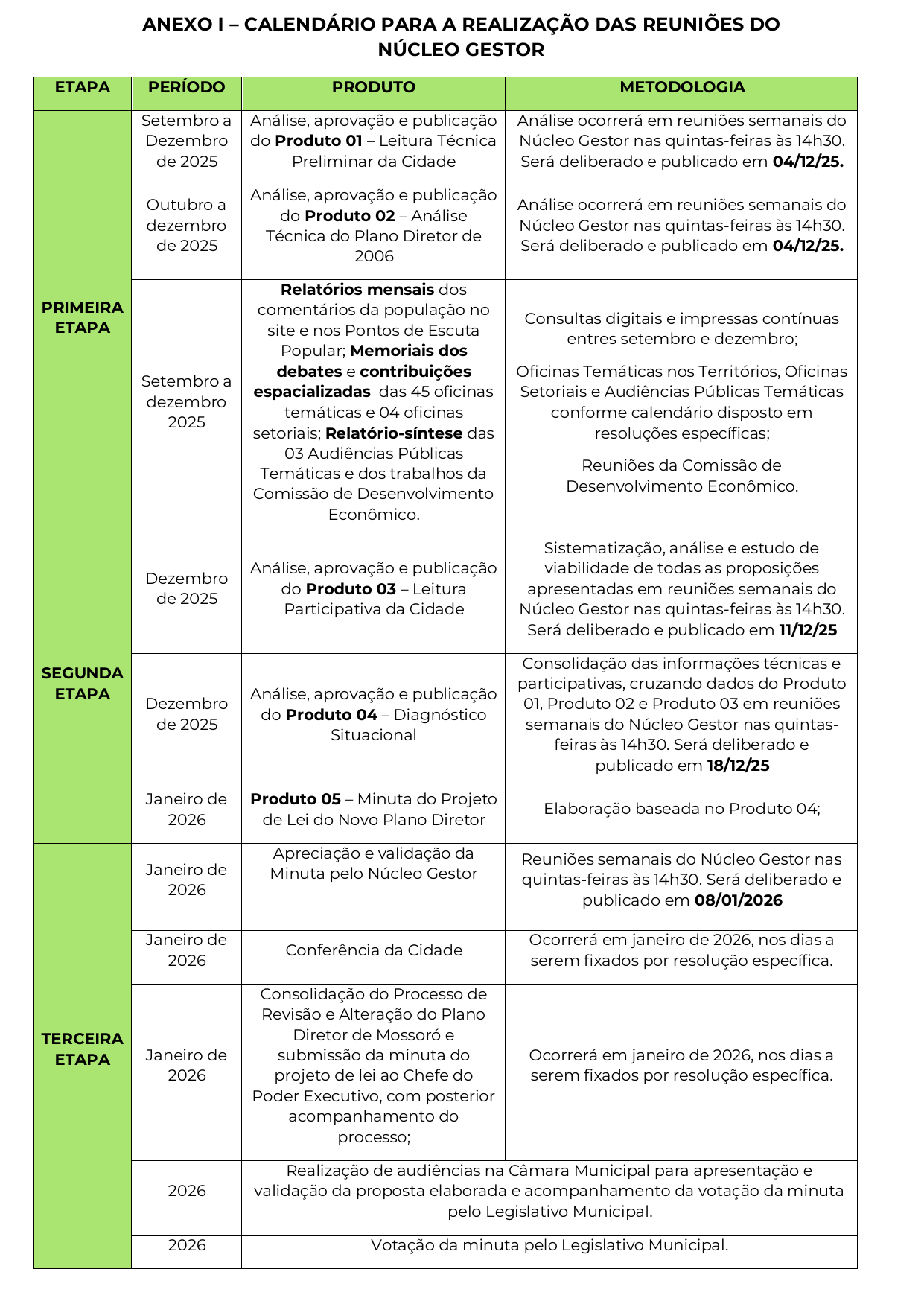 CONSIDERANDO que o Núcleo Gestor aprovou o Plano de Trabalho para o Processo de Revisão e Alteração do Plano Diretor de Mossoró na 7ª reunião, realizada em 28/08/2025, conforme disponibilizado na Plataforma Virtual do Novo Plano Diretor de Mossoró (https://planodiretor.mossoro.rn.gov.br/);