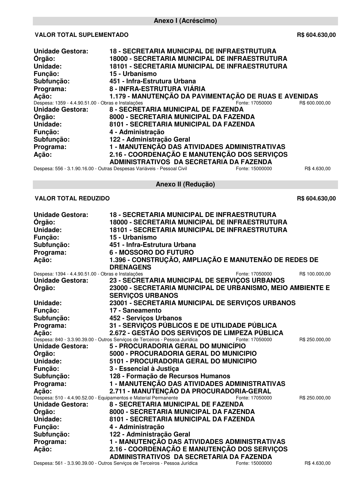 Art. 1º Fica aberto, no corrente exercício, Crédito Suplementar no valor de R$ 604.630,00 (seiscentos e quatro mil e seiscentos e trinta reais) às dotações especificadas no Anexo I deste Decreto.
