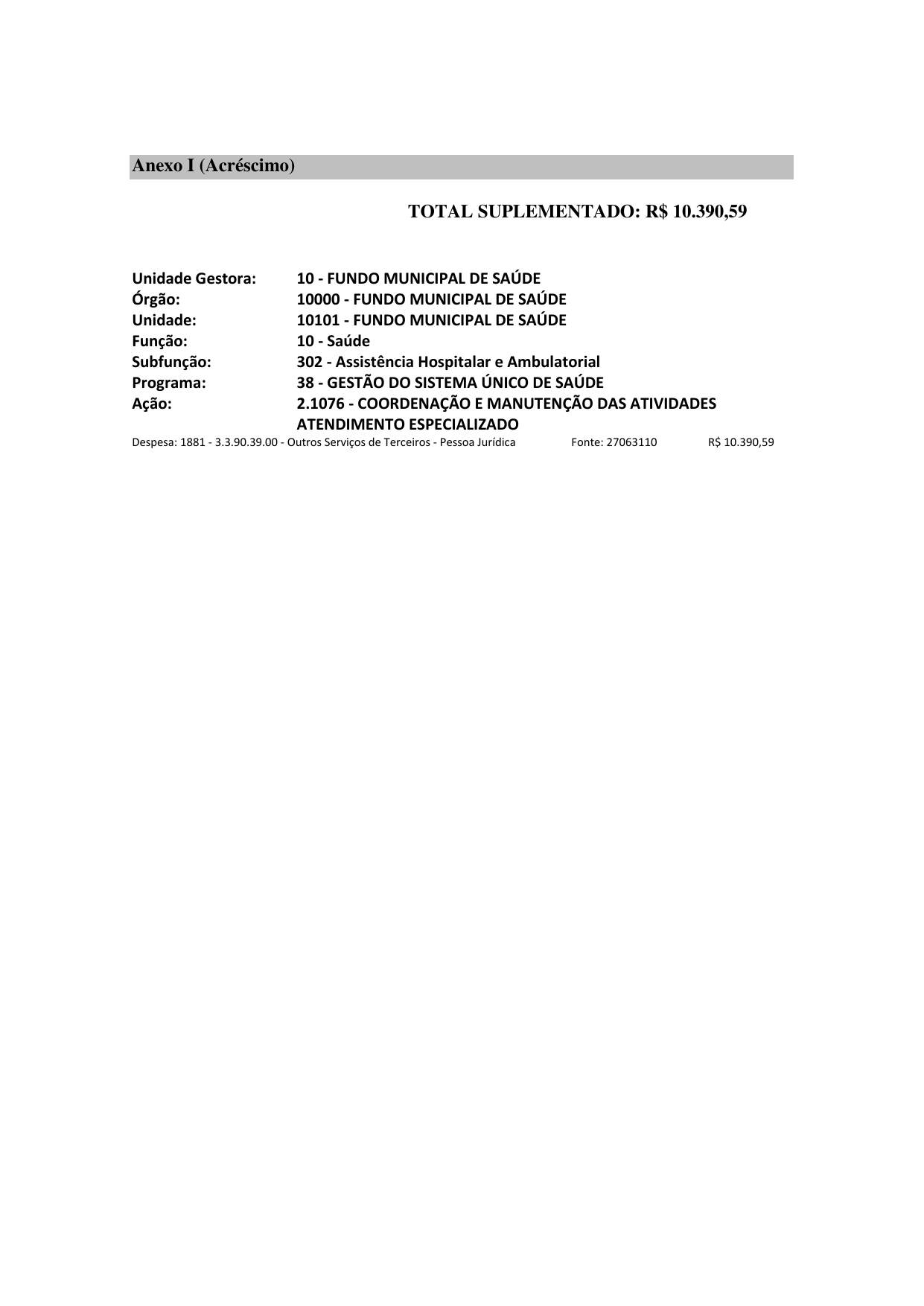 Art. 1º Fica aberto, no corrente exercício, Crédito Suplementar por Superávit Financeiro no valor de R$ 10.390,59 (dez mil e trezentos e noventa reais e cinquenta e nove centavos) às dotações especificadas no Anexo I deste Decreto.