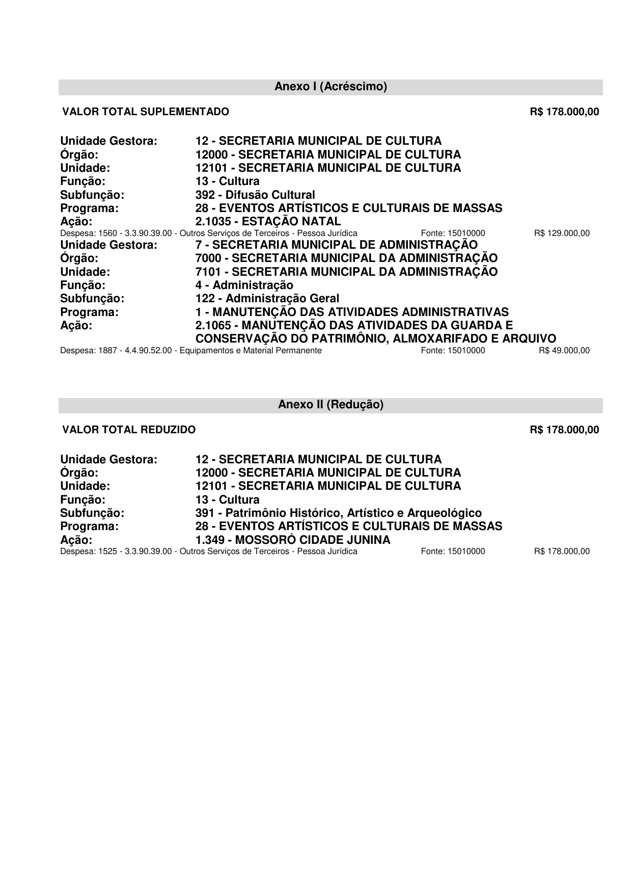 Art. 1º Fica aberto, no corrente exercício, Crédito Suplementar no valor de R$ 178.000,00 (cento e setenta e oito mil reais) às dotações especificadas no Anexo I deste Decreto.