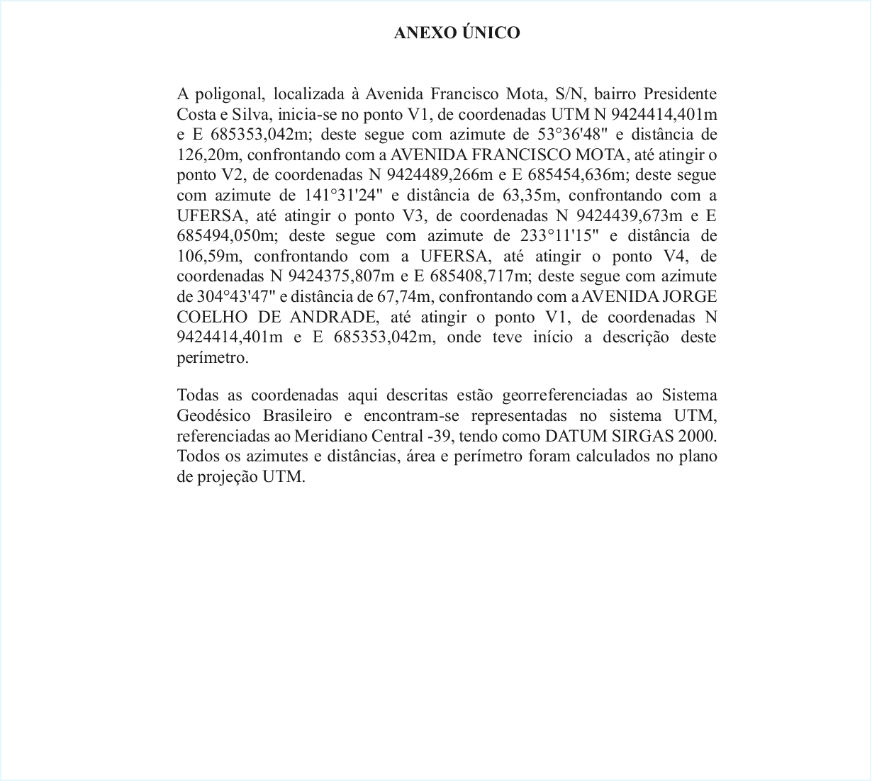 Parágrafo único. A poligonal do imóvel de que trata o caput deste artigo fica descrita nos termos do Anexo Único desta Lei.