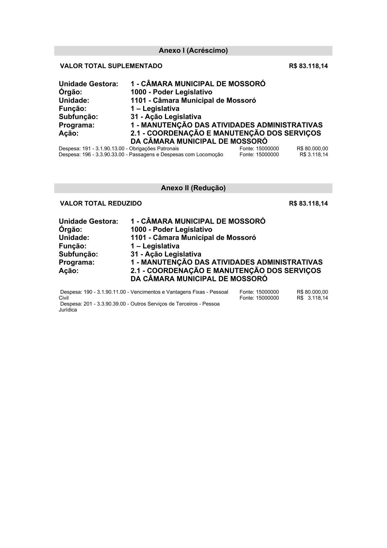 Art. 1º - Ficam autorizadas as modificações orçamentárias no montante total de R$ 83.118,14 (oitenta e três mil, cento e dezoito reais e quatorze centavos), constante do Quadro de Detalhamento de Despesa desta Câmara Municipal, aprovado pela Lei Orçamentária Anual, Lei 4.175/2024, para suplementar a dotação especificada no Anexos I deste Ato.