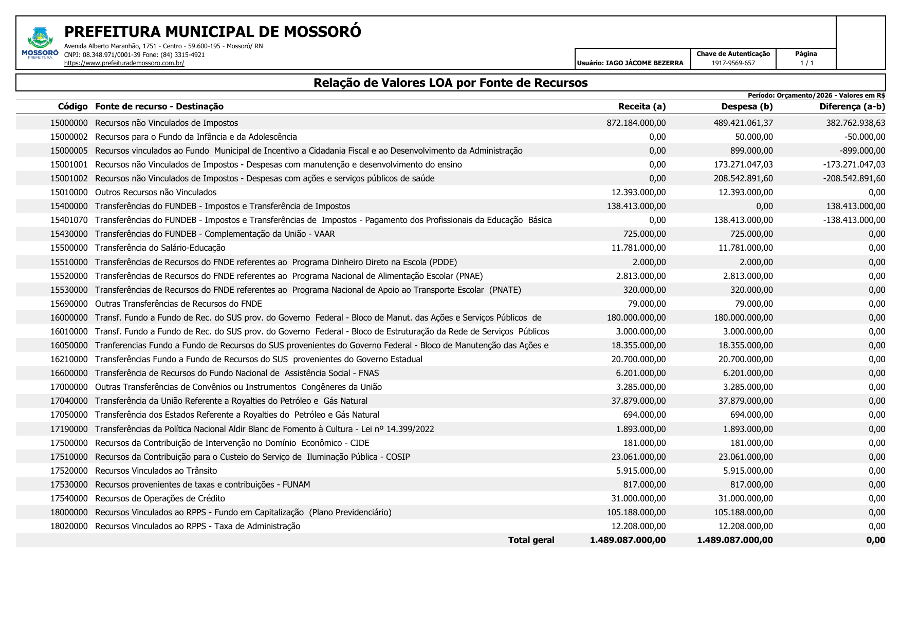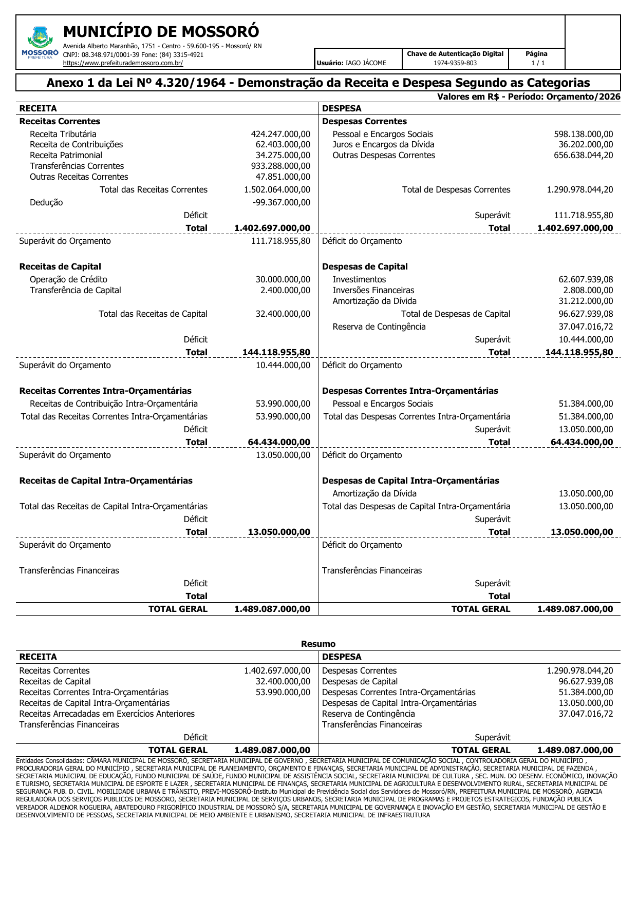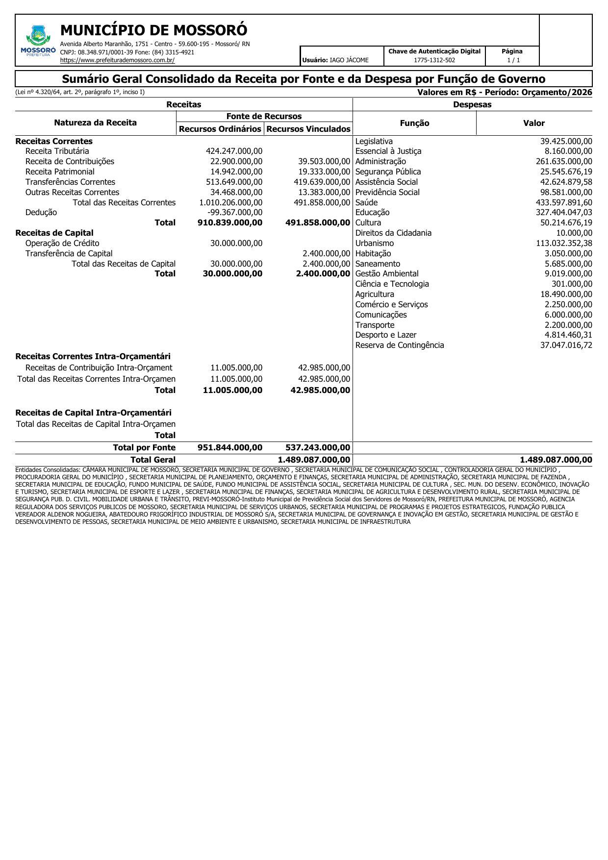 Art. 1° Esta Lei estima a receita do Município de Mossoró para o exercício financeiro de 2026 no montante de R$ 1.489.087.000,00 (um bilhão, quatrocentos e oitenta e nove milhões, oitenta e sete mil reais) e fixa a despesa em igual valor, nos termos do § 5° do art. 165 da Constituição da República Federativa do Brasil, do inciso XII do art. 78 e do art. 148, da Lei Orgânica Municipal, e da Lei n° 4.203, de 15 de julho de 2025, que define as Diretrizes Orçamentárias do Município de Mossoró, compreendendo: