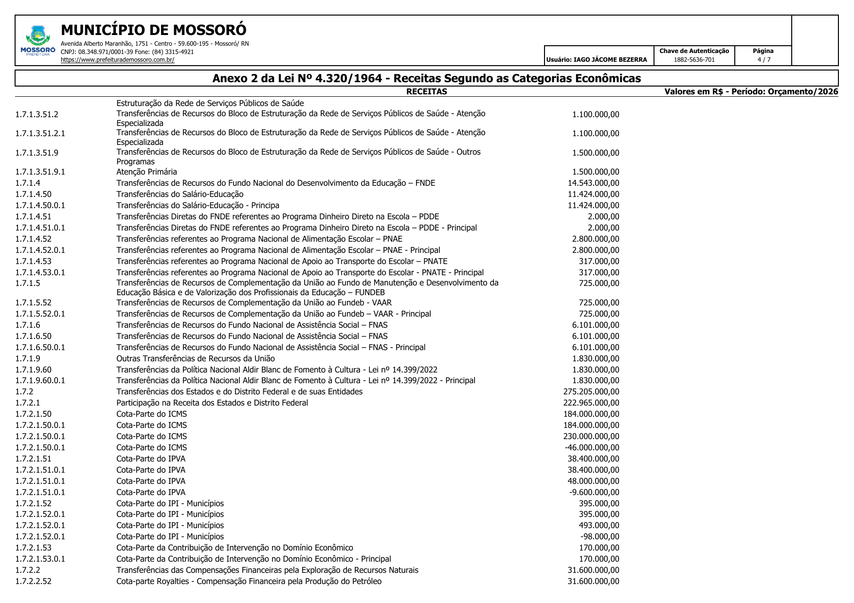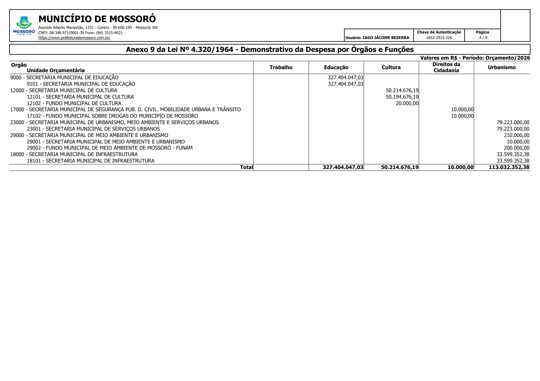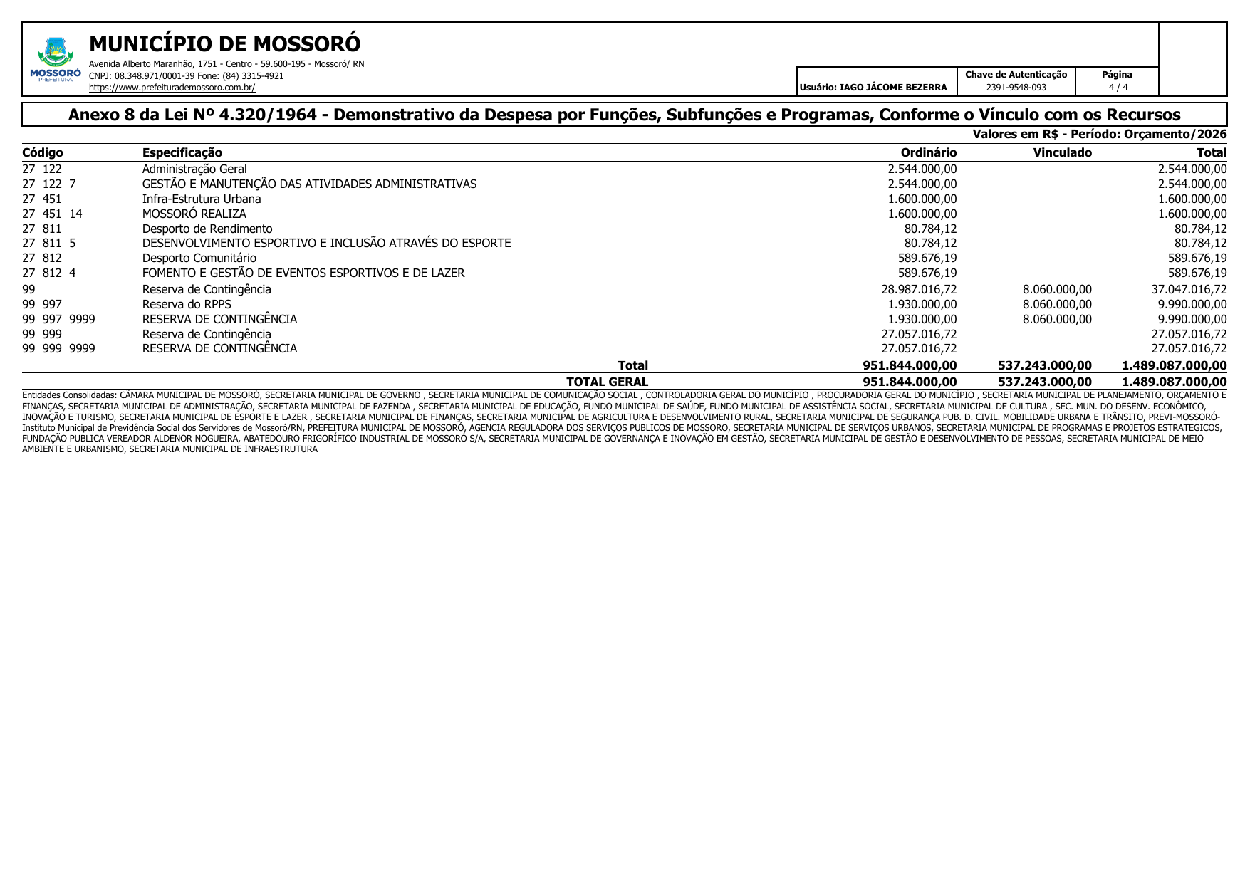 Art. 1° Esta Lei estima a receita do Município de Mossoró para o exercício financeiro de 2026 no montante de R$ 1.489.087.000,00 (um bilhão, quatrocentos e oitenta e nove milhões, oitenta e sete mil reais) e fixa a despesa em igual valor, nos termos do § 5° do art. 165 da Constituição da República Federativa do Brasil, do inciso XII do art. 78 e do art. 148, da Lei Orgânica Municipal, e da Lei n° 4.203, de 15 de julho de 2025, que define as Diretrizes Orçamentárias do Município de Mossoró, compreendendo: