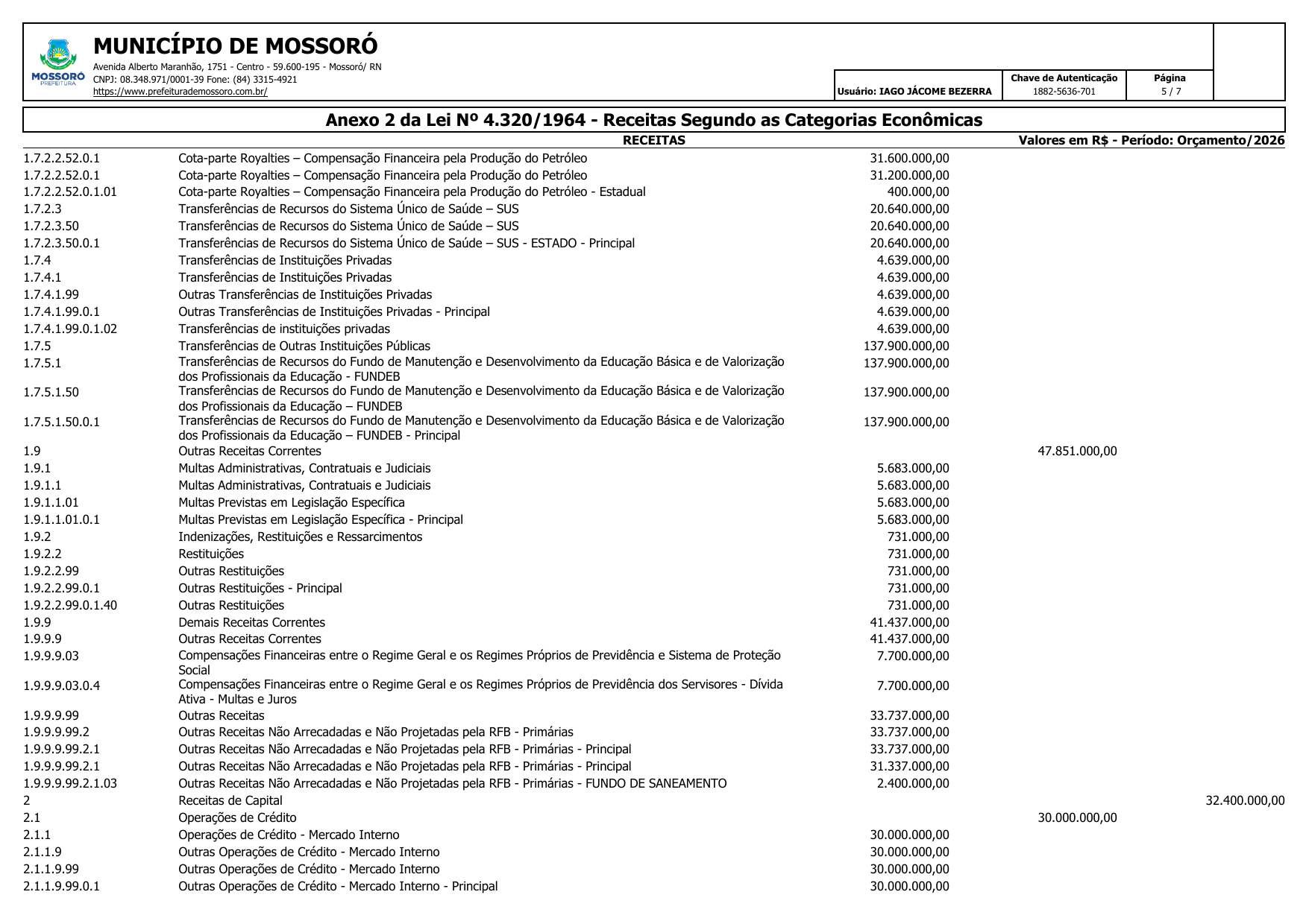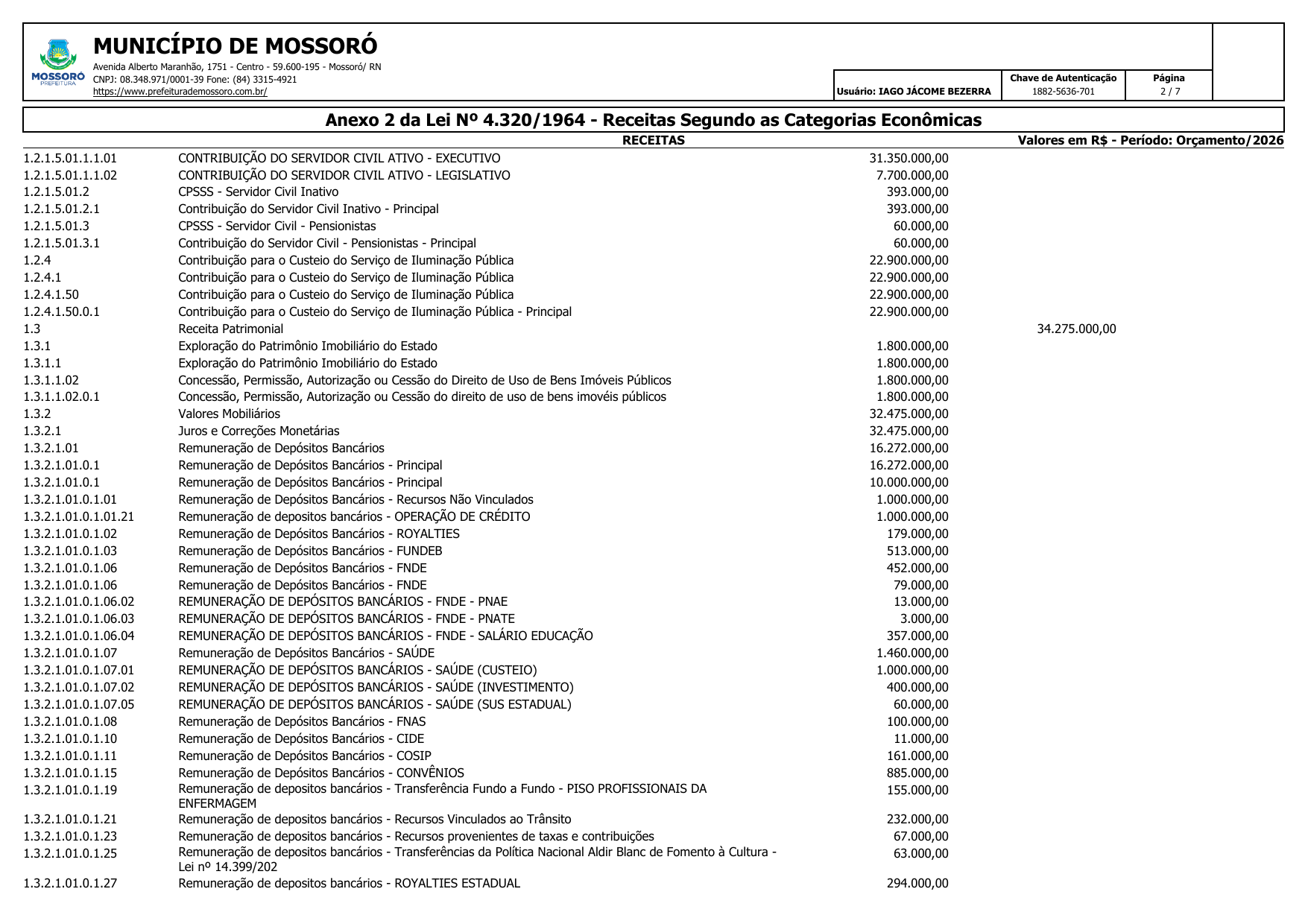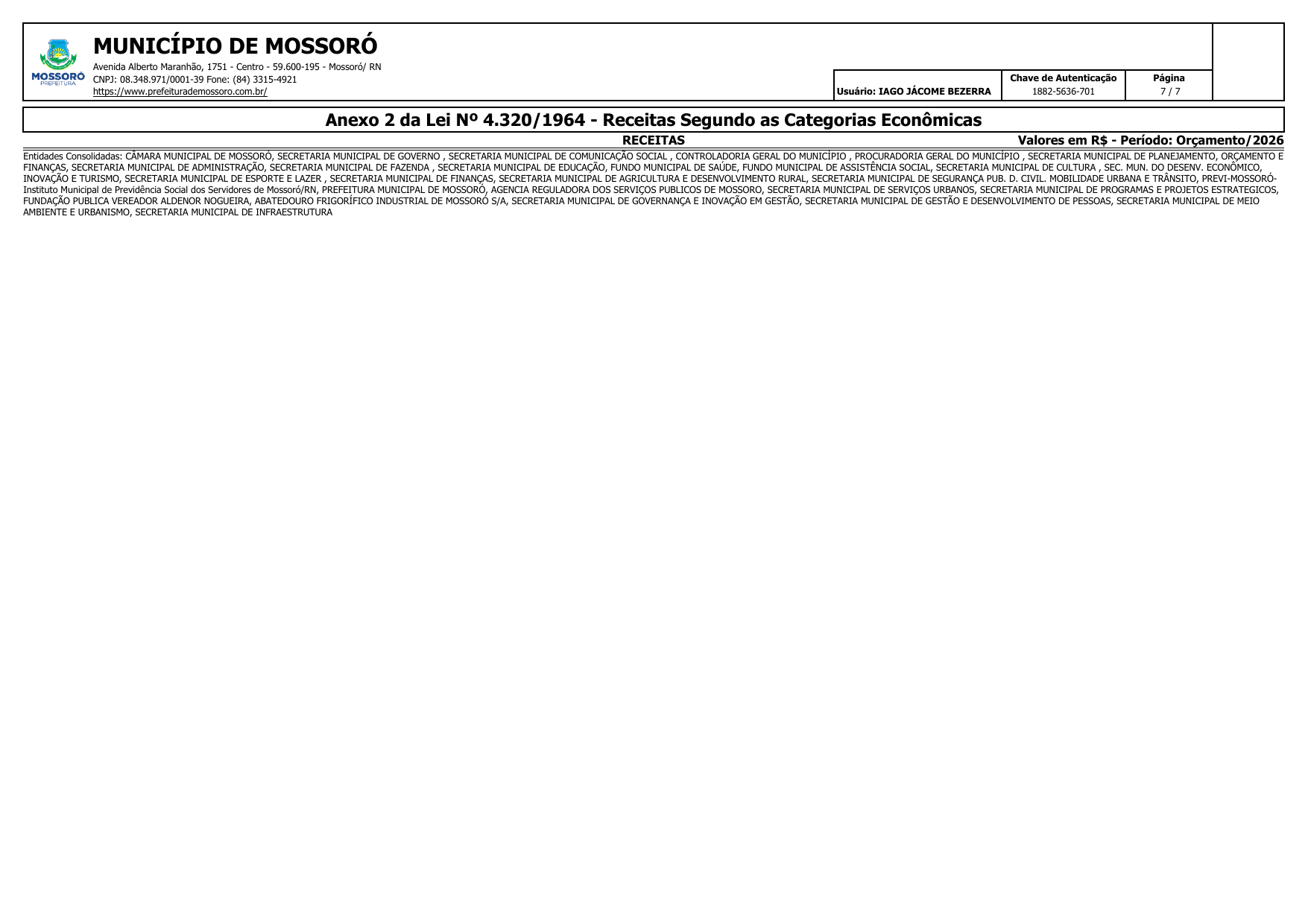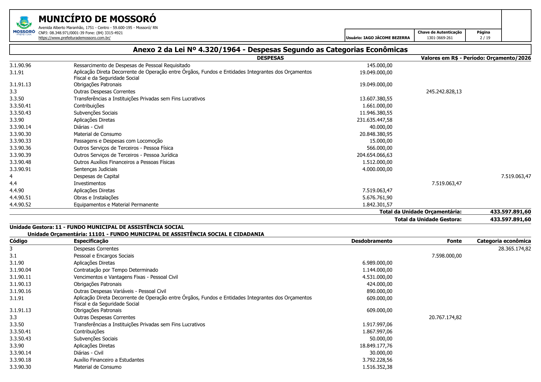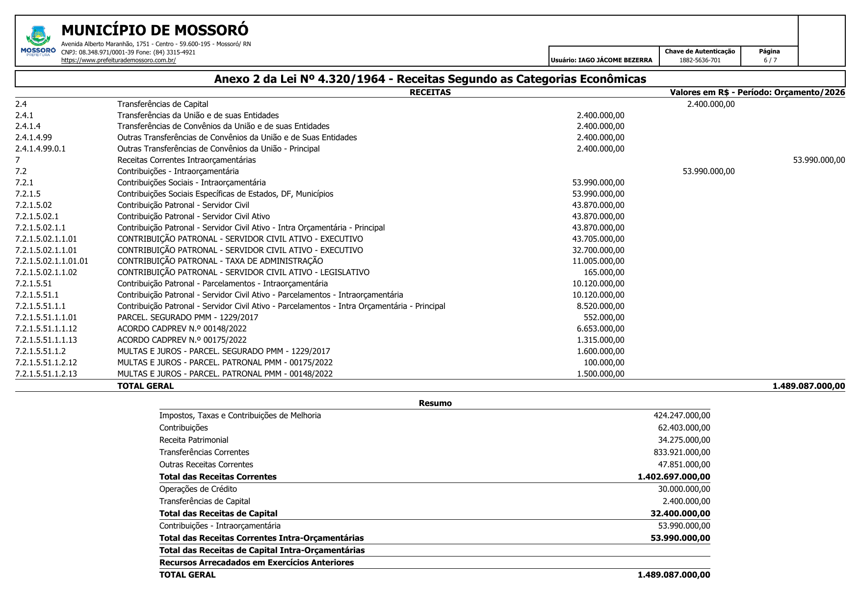 Art. 2° A receita total estimada nos Orçamentos Fiscal e da Seguridade Social, para o exercício de 2026 é de R$ 1.489.087.000,00 (um bilhão, quatrocentos e oitenta e nove milhões, oitenta e sete mil reais), em observância ao disposto no art. 5° da Lei Complementar Federal n° 101, de 4 de maio de 2000 - Lei de Responsabilidade Fiscal, distribuída conforme a Demonstração da Receita e Despesa Segundo as Categorias Econômicas desta Lei.