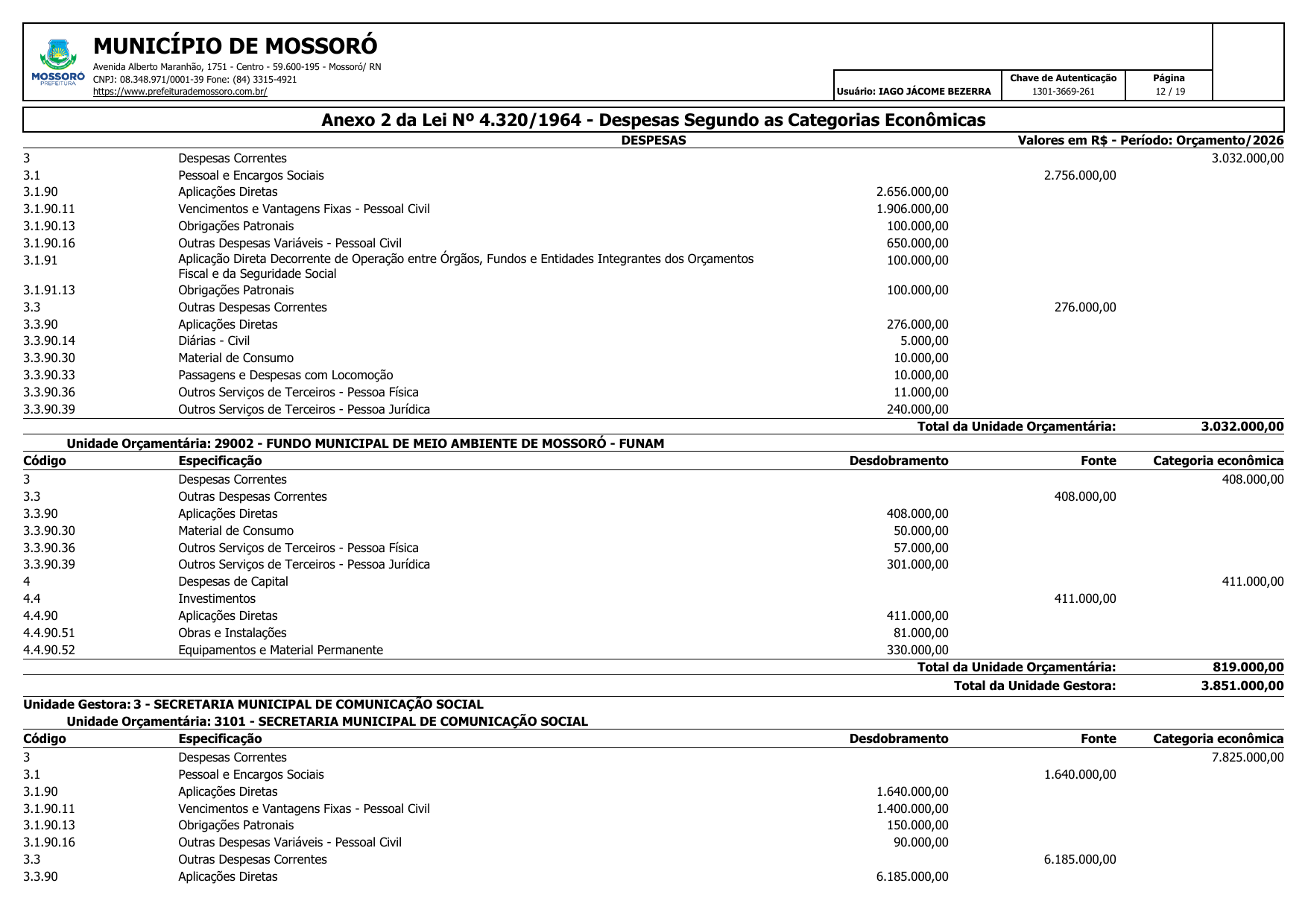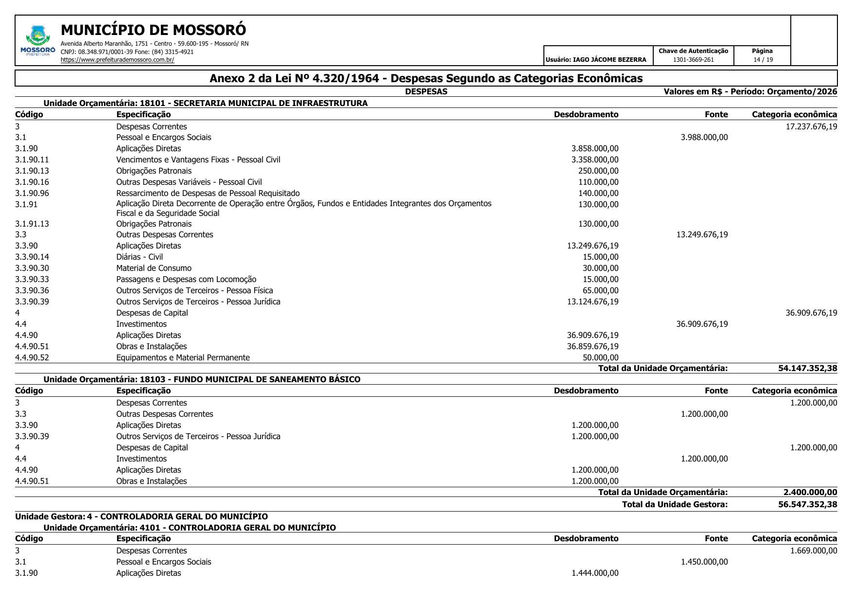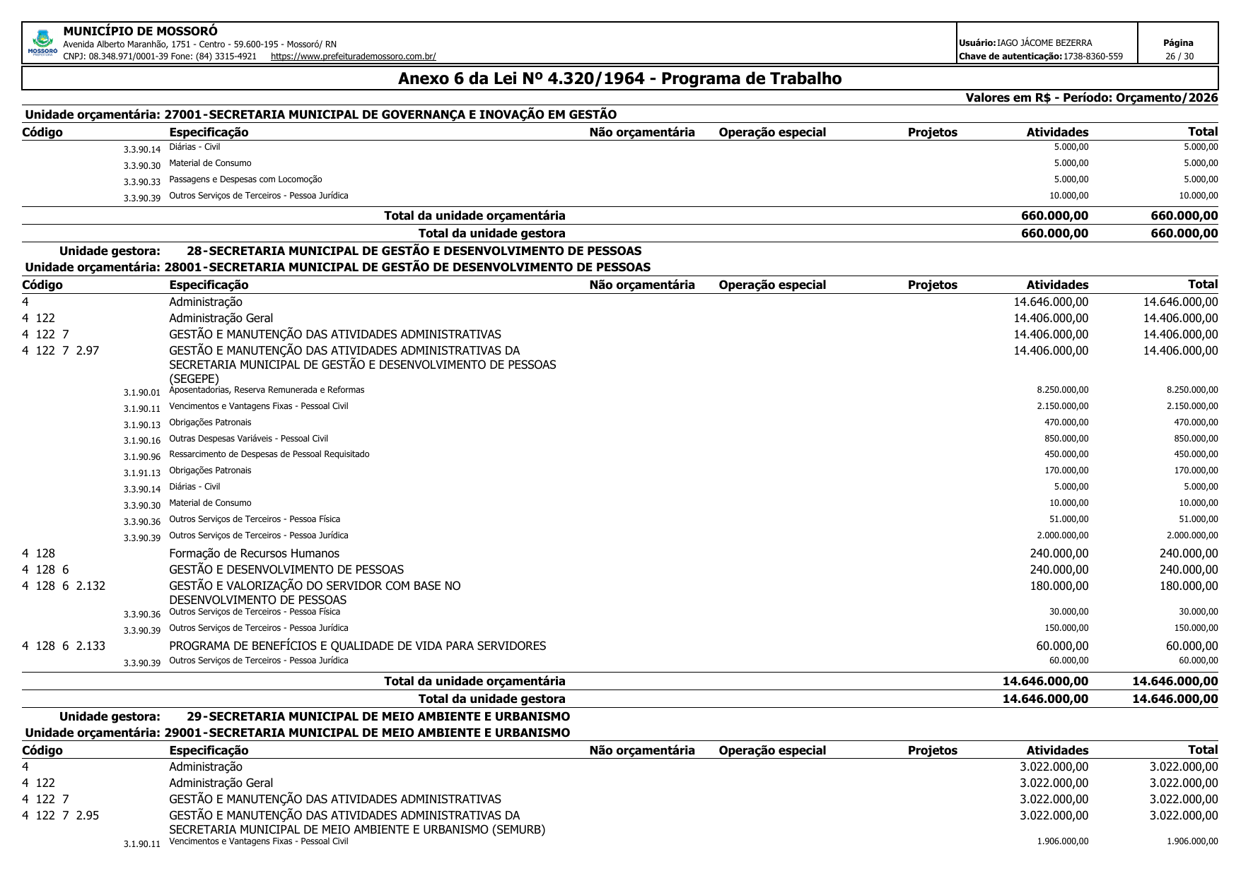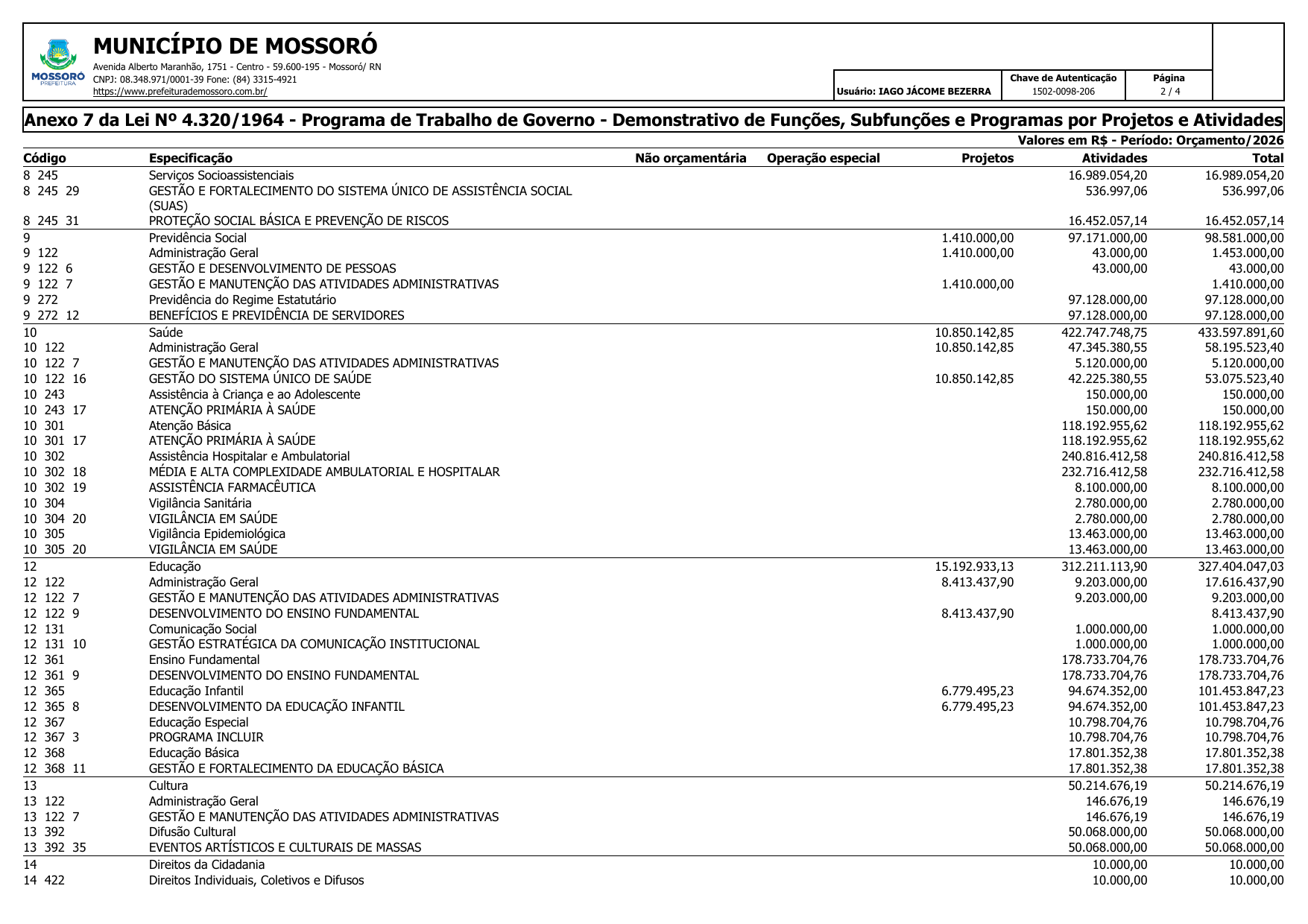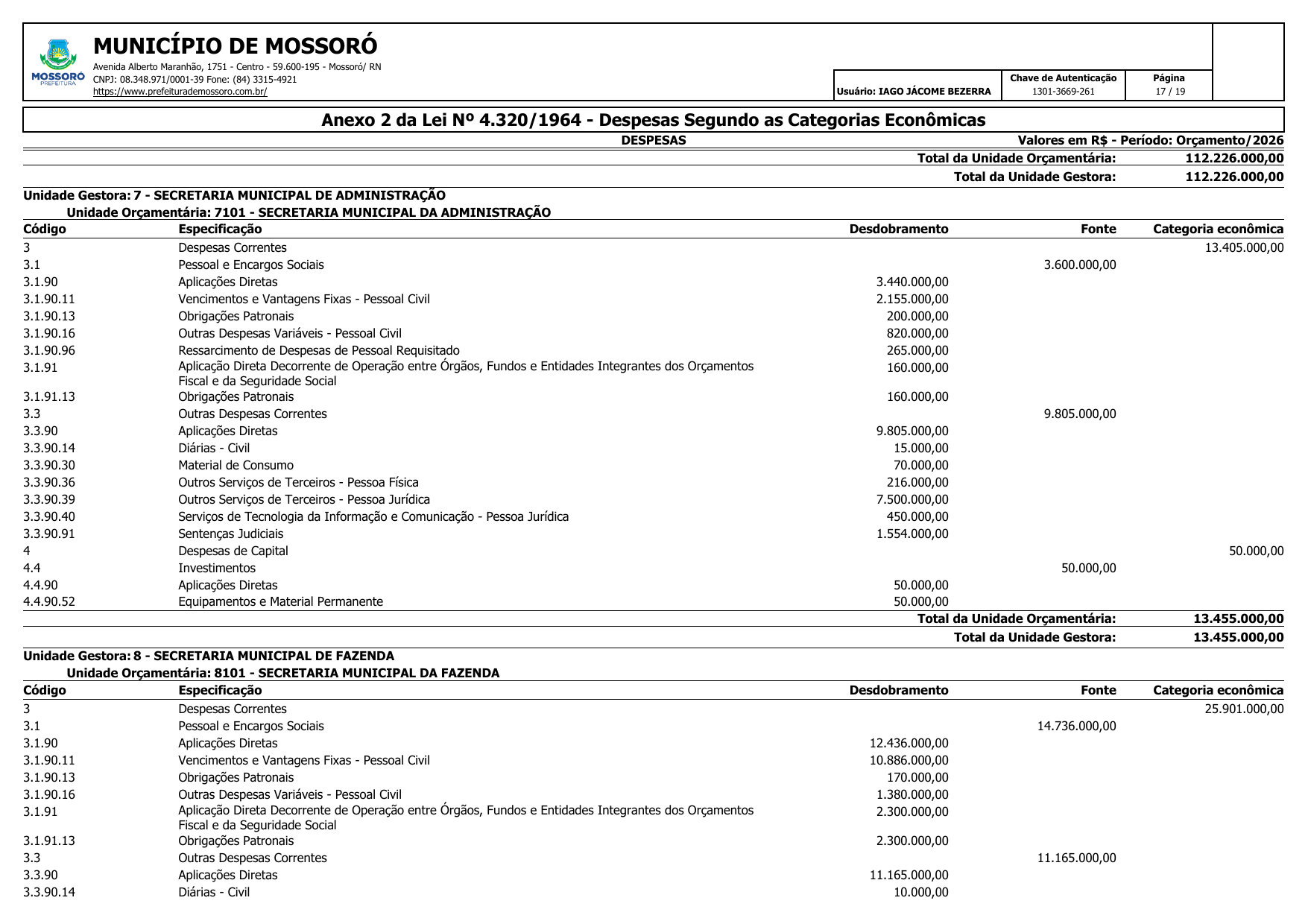 Estima as receitas e fixa as despesas do Município de Mossoró para o exercício financeiro de 2026 e dá outras providências