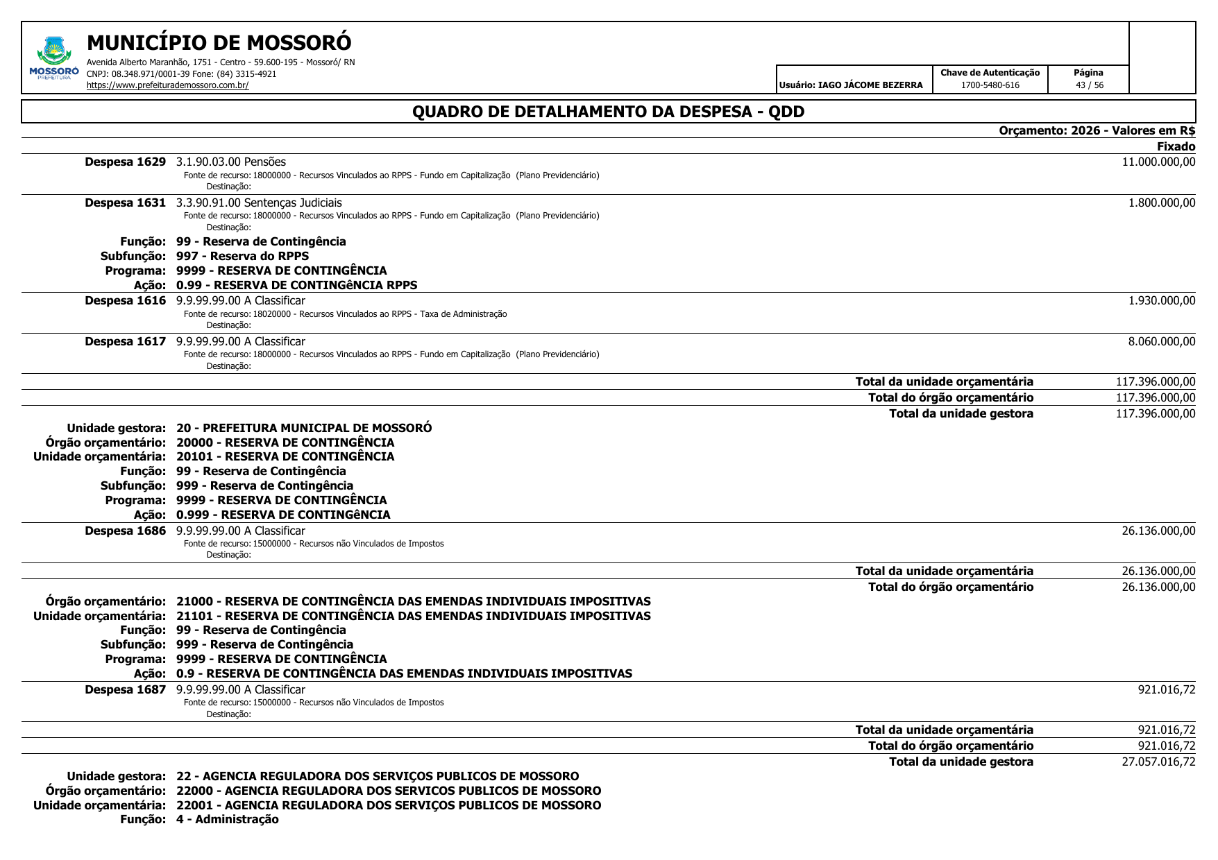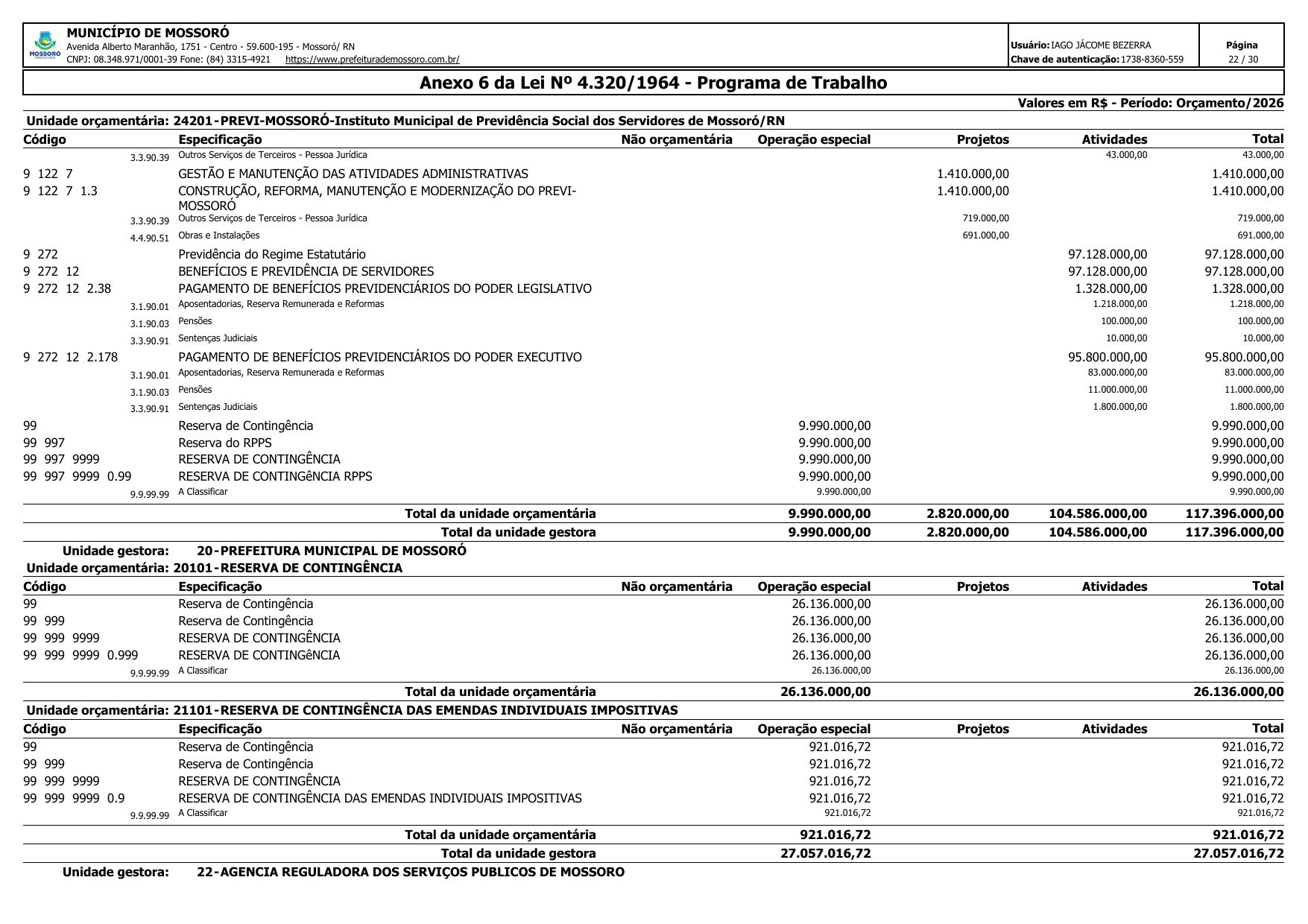 Parágrafo único. A Reserva de Contingência das Emendas Individuais Impositivas, de que trata o inciso I deste artigo, é definida com base na Receita Corrente Líquida - RCL, prevista para o exercício de 2026, no montante de R$ 15.682.000,00 (quinze milhões seiscentos e oitenta e dois mil reais) em observância ao disposto no art. 30 da Lei n° 4.203, de 2025, que define as Diretrizes Orçamentárias do Município de Mossoró para o exercício de 2026.