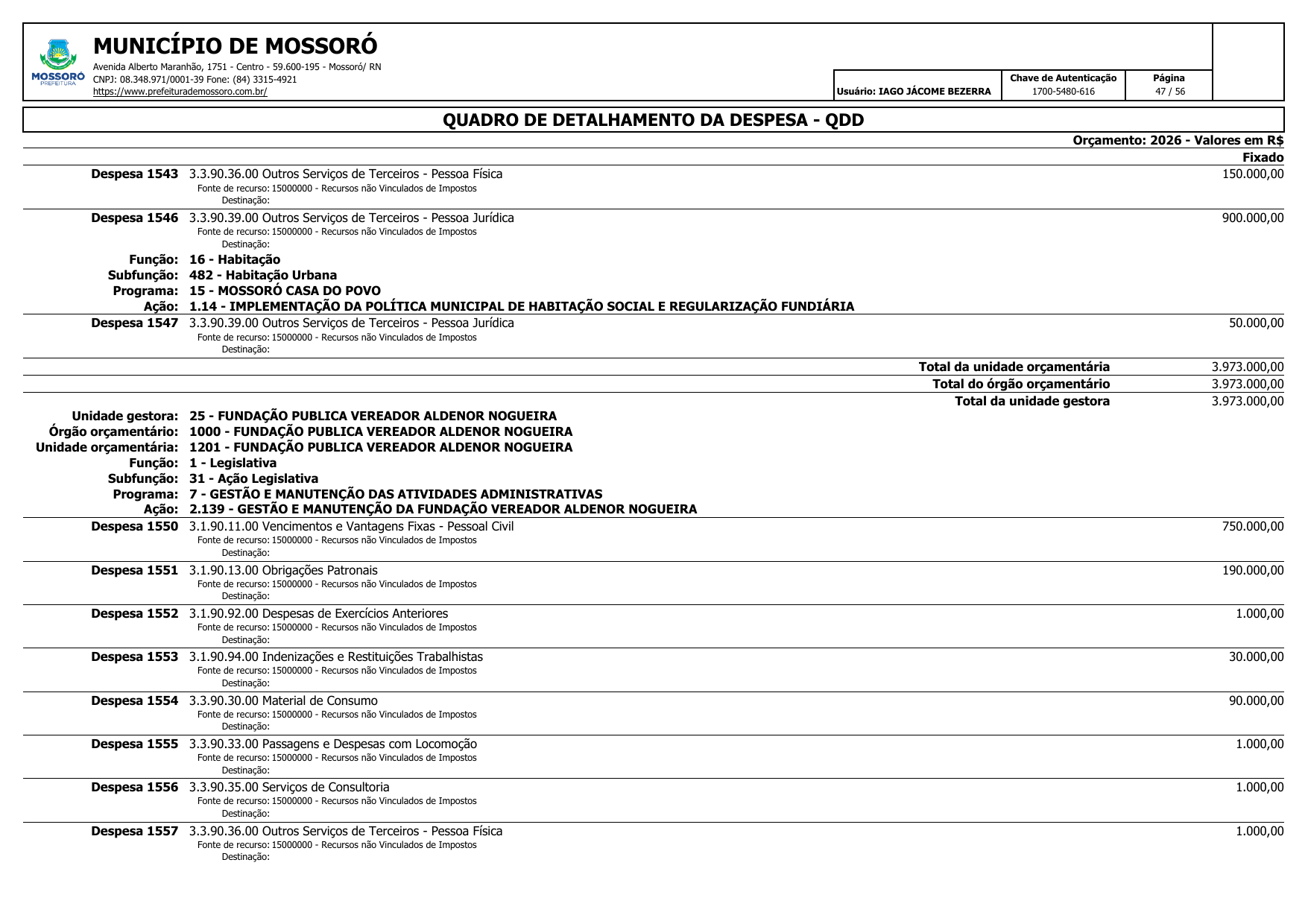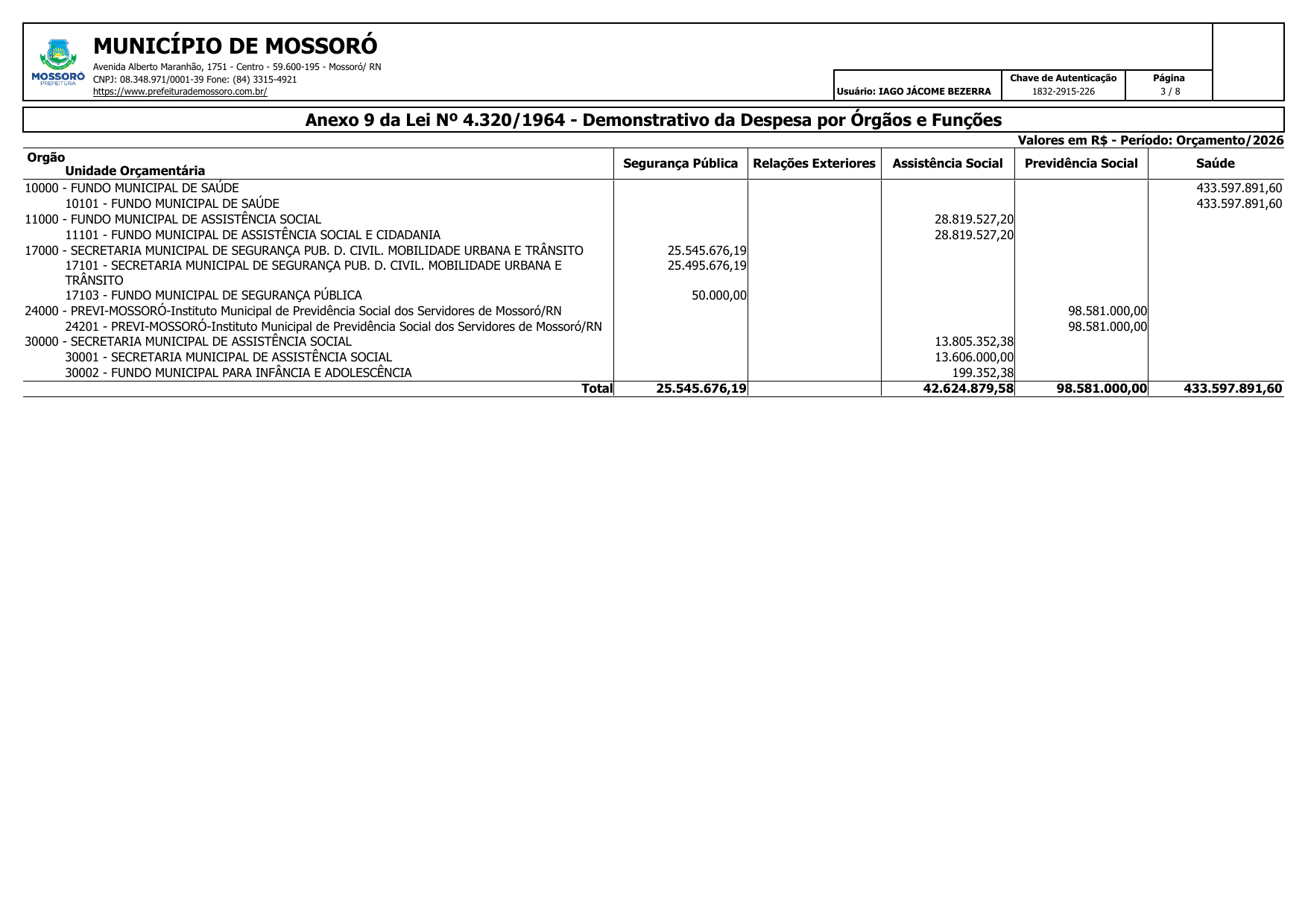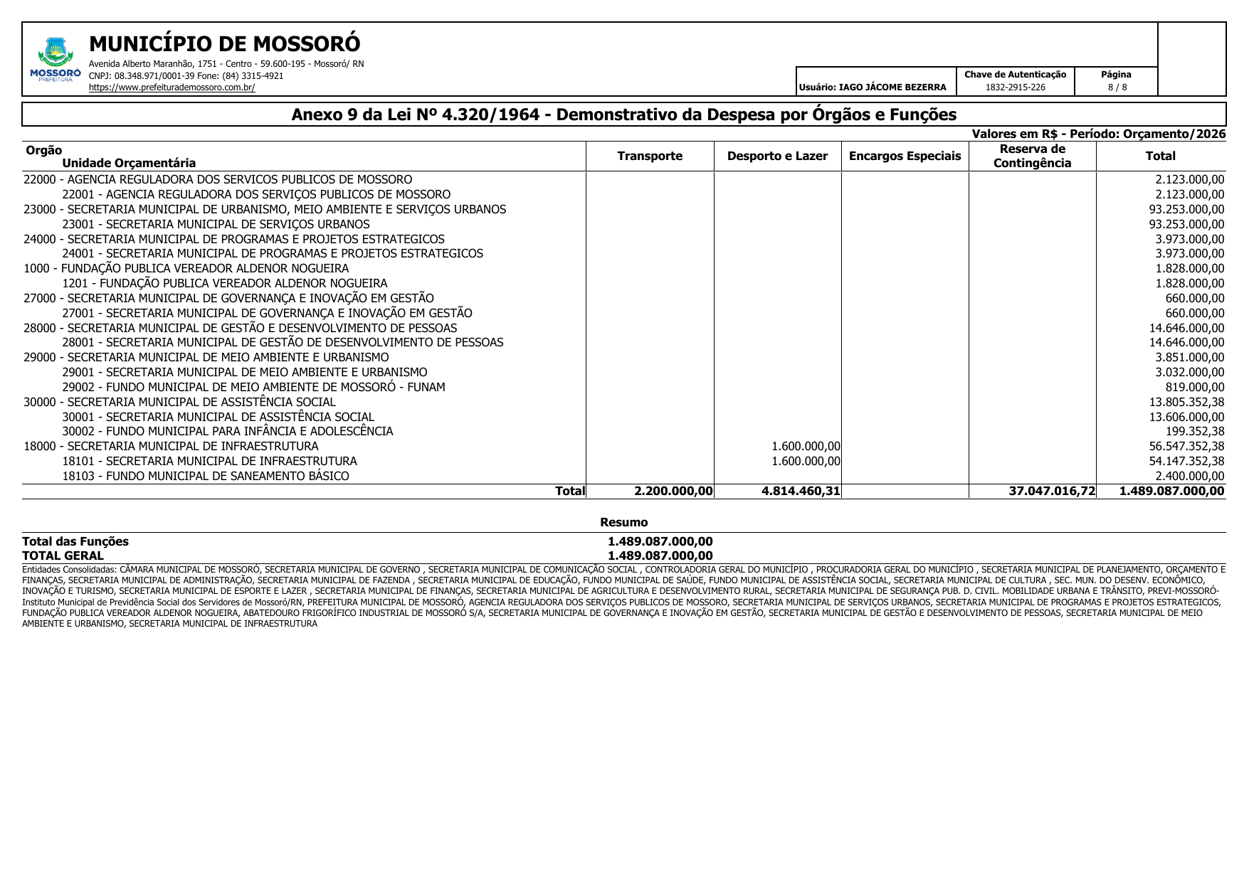 Art. 3° A despesa total fixada nos Orçamentos Fiscal e da Seguridade Social é de R$ 1.489.087.000,00 (um bilhão, quatrocentos e oitenta e nove milhões, oitenta e sete mil reais), em observância ao disposto no art. 5° da Lei Complementar Federal n° 101, de 2000 e nos arts. 7° e 8° da Lei n° 4.203 de 2025 com o seguinte desdobramento: