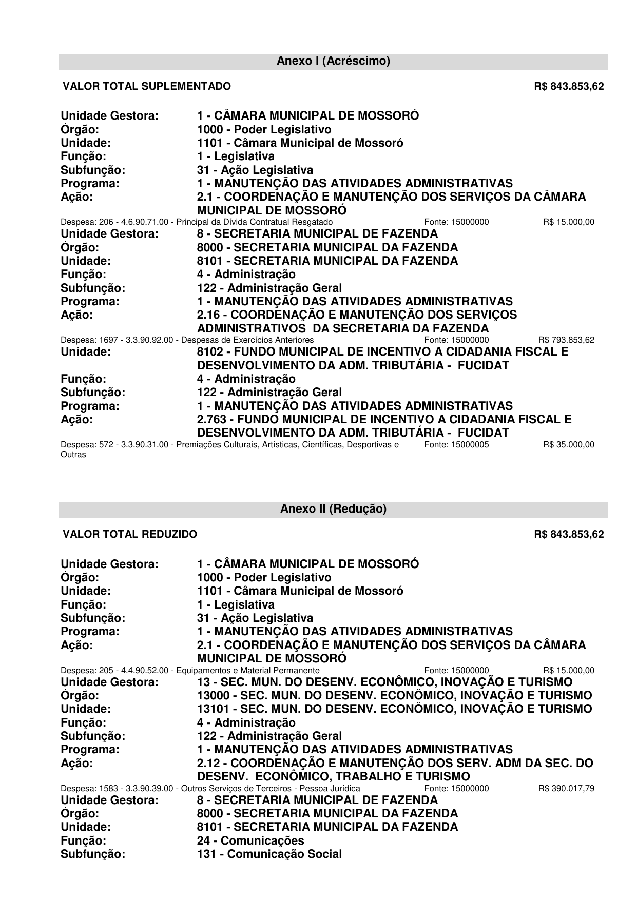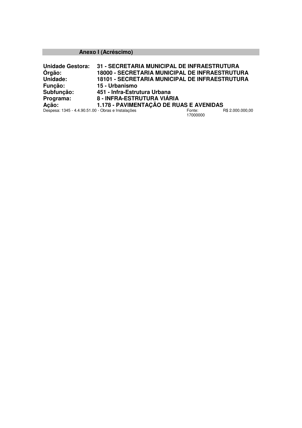 Art. 2º Os recursos necessários à modificação orçamentária de que trata o artigo anterior são oriundos da anulação, de iguais importâncias, da dotação discriminada no Anexo II deste Ato.