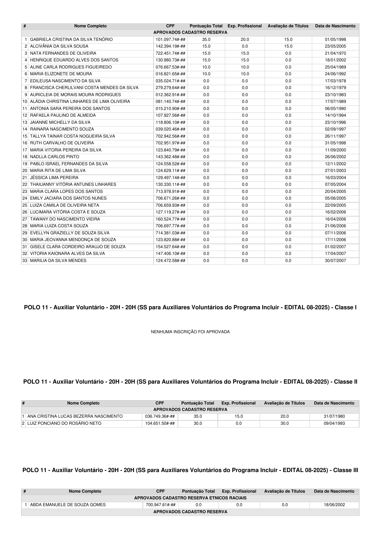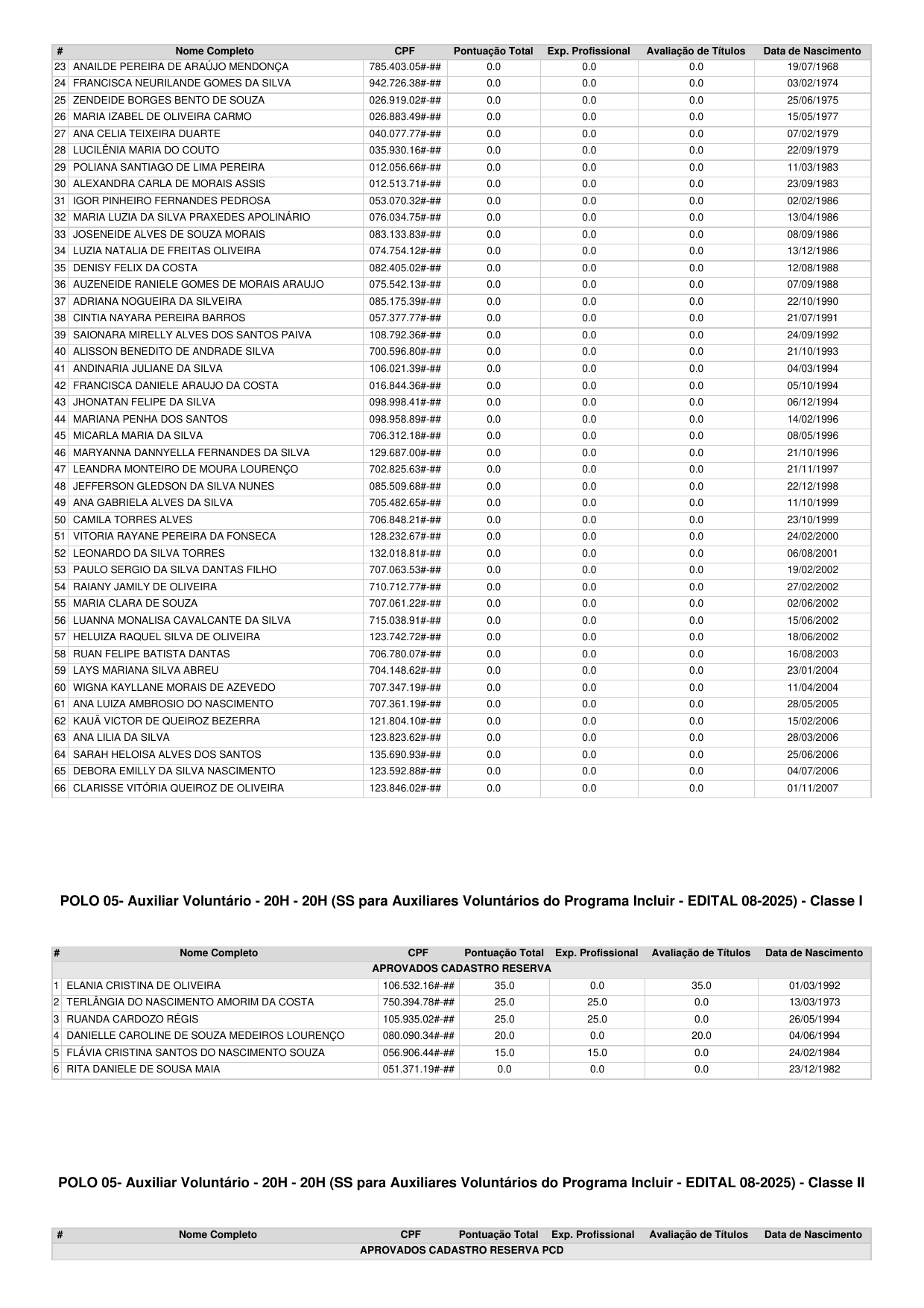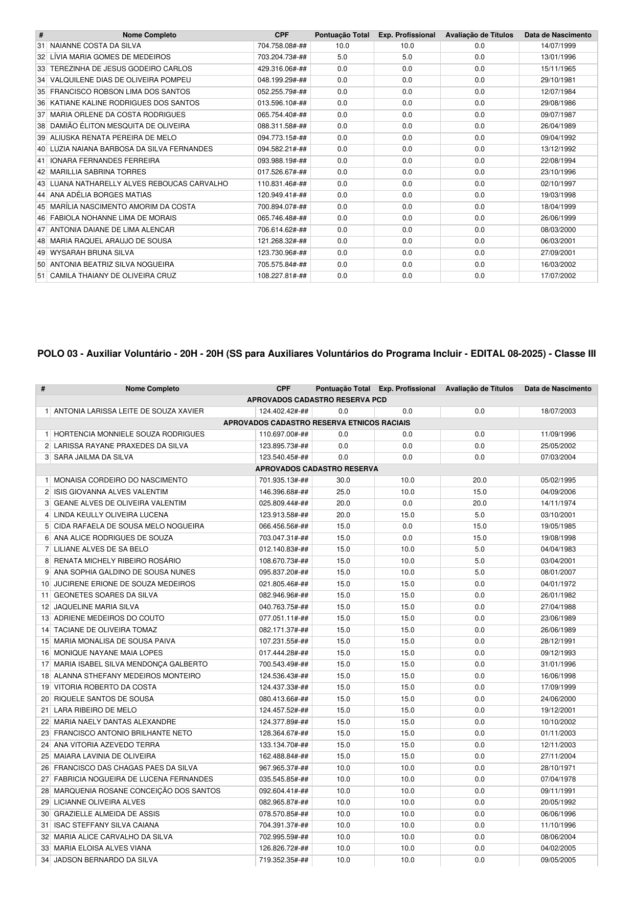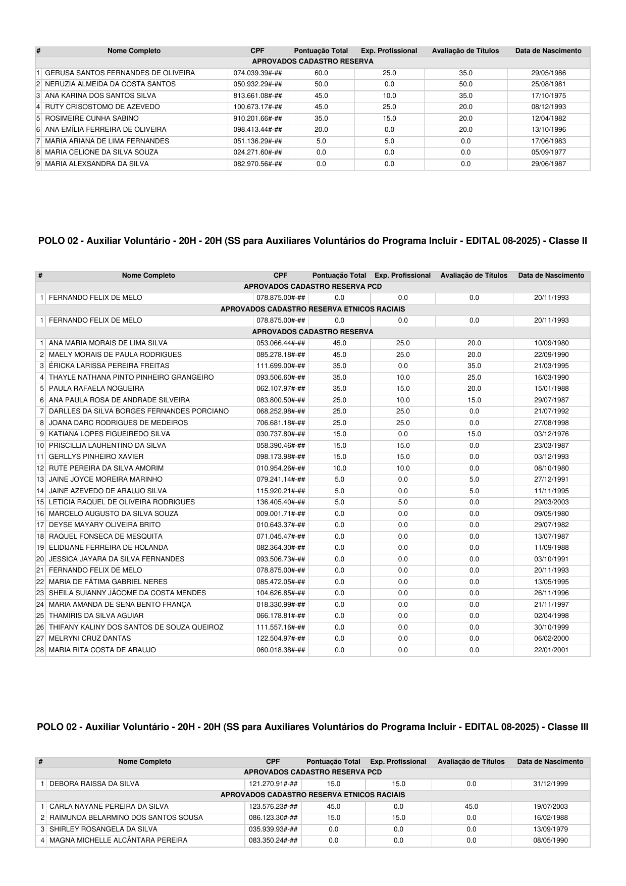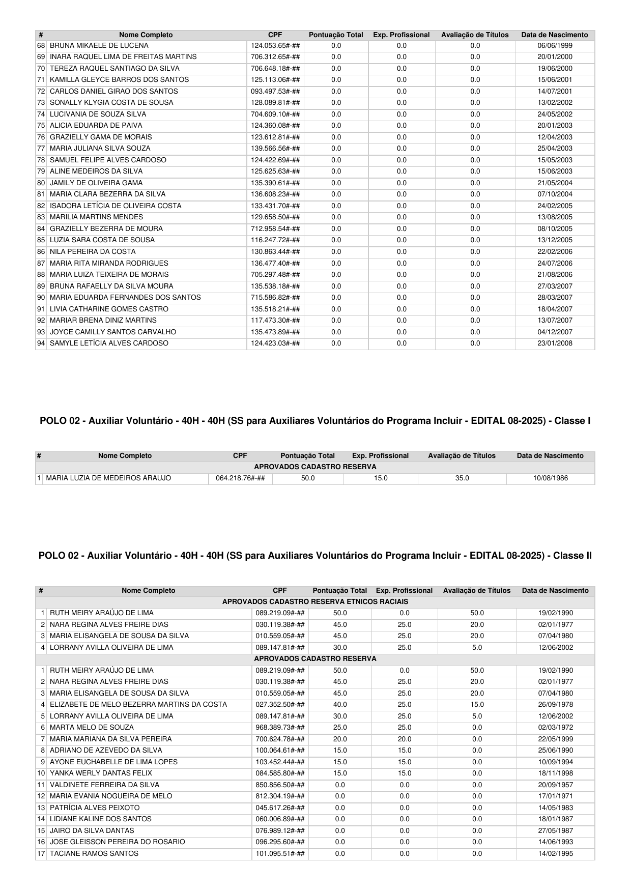 A Comissão da Seleção Simplificada – CSS, instituída pela Portaria nº 234-SME, publicada no Diário Oficial de Mossoró – DOM, edição de nº 731 do dia 29 de dezembro de 2025, torna público o resultado final homologado das inscrições para a Seleção Simplificada – SS, destinada à formação de cadastro de reserva para contratação de Auxiliares Voluntários, no âmbito do PROGRAMA INCLUIR da Secretaria Municipal de Educação.