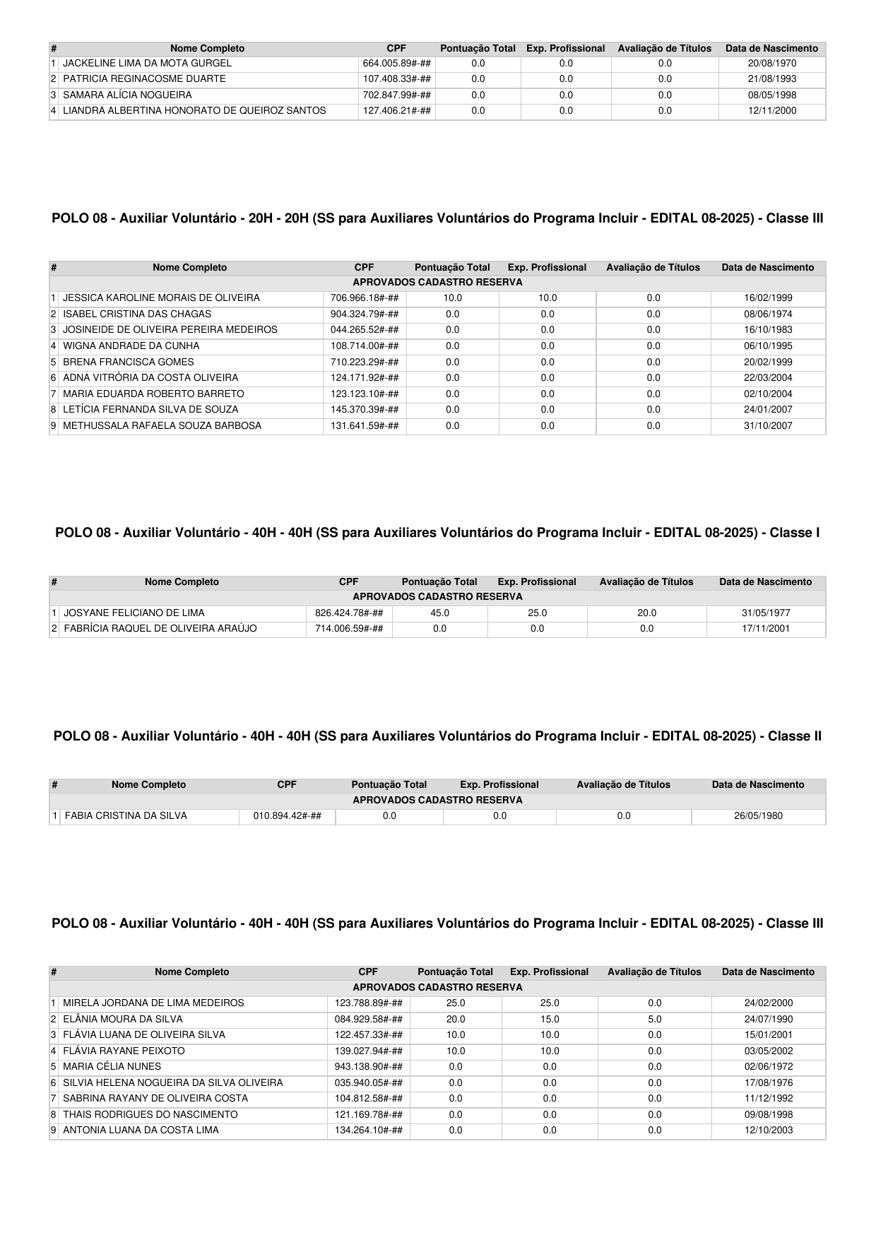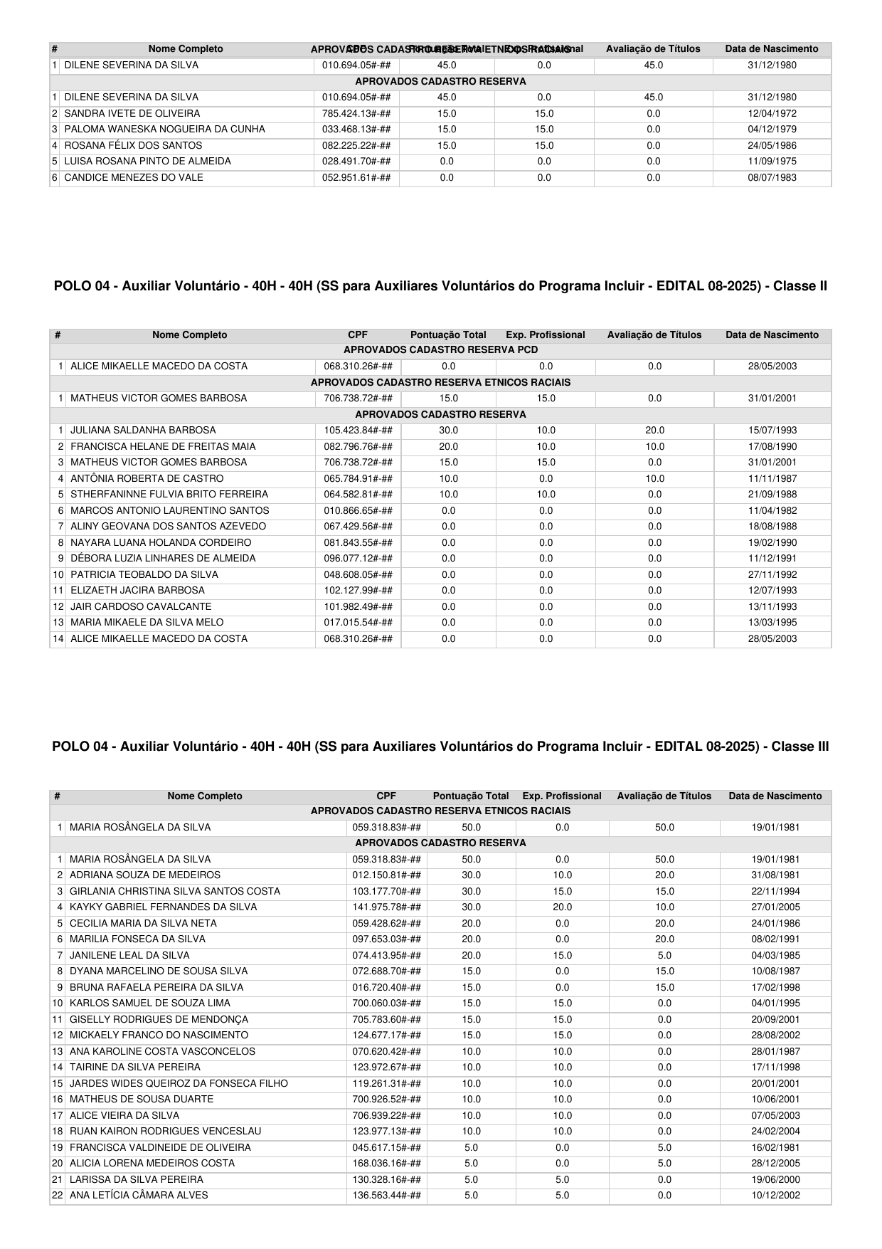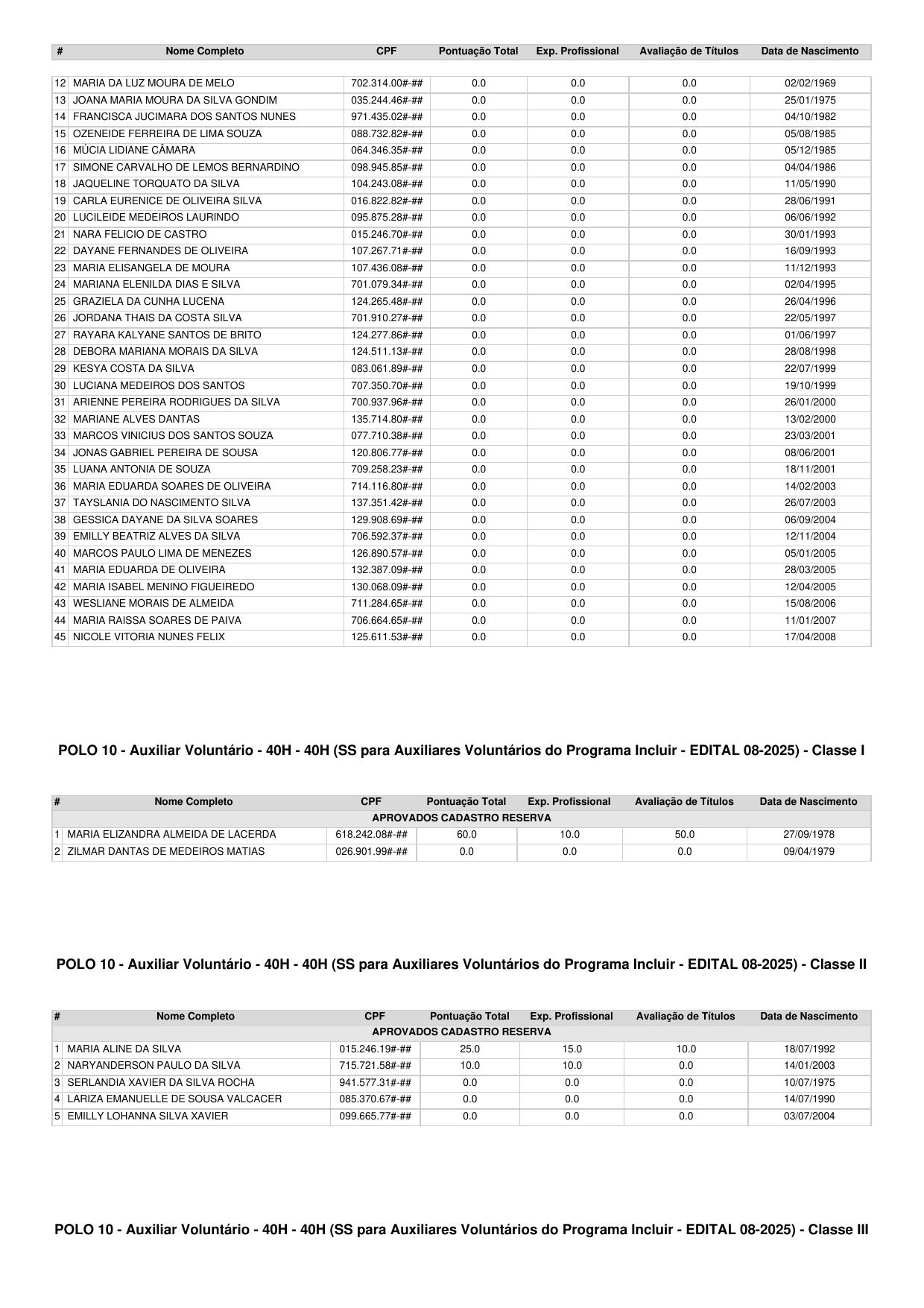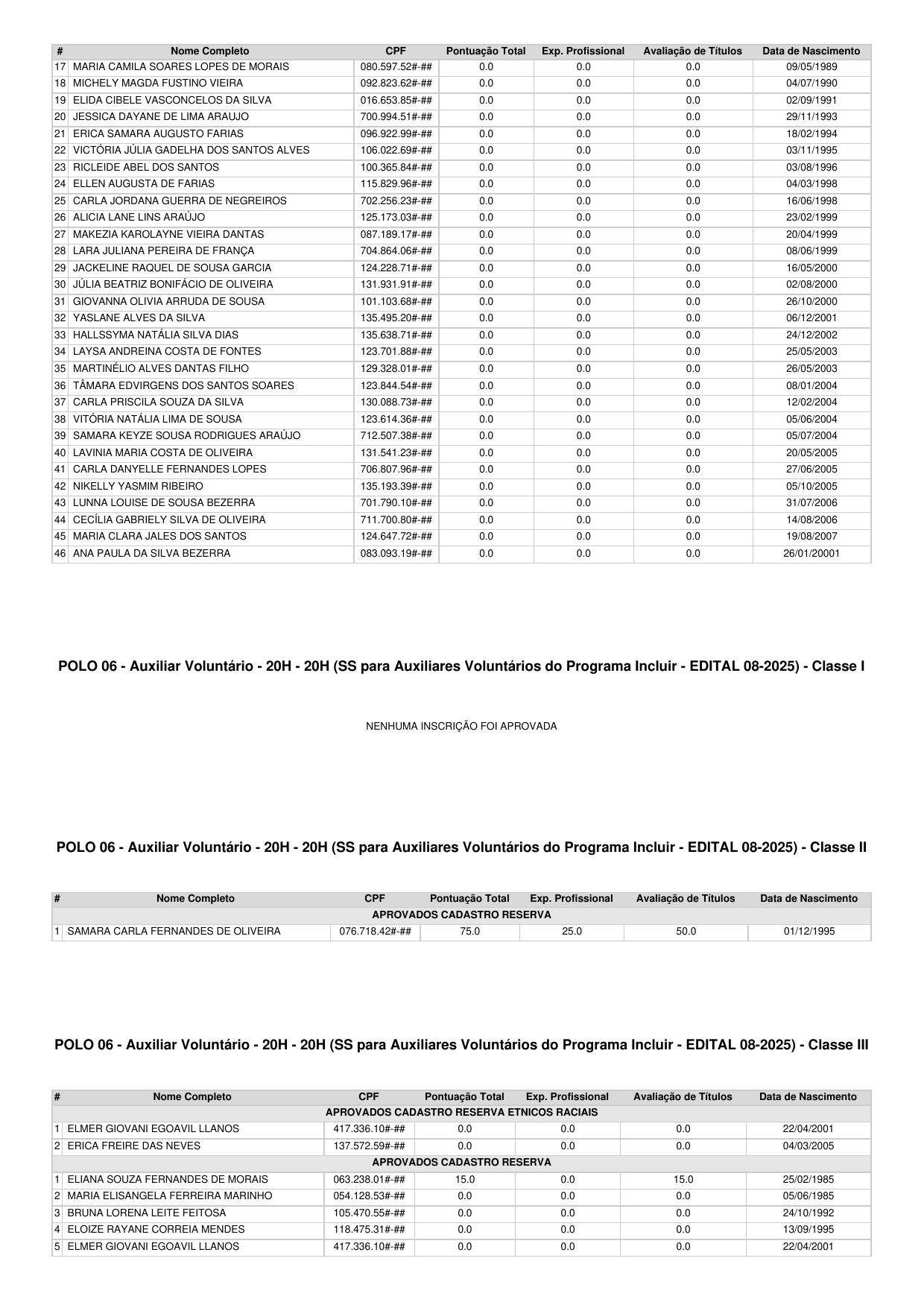 A Comissão da Seleção Simplificada – CSS, instituída pela Portaria nº 234-SME, publicada no Diário Oficial de Mossoró – DOM, edição de nº 731 do dia 29 de dezembro de 2025, torna público o resultado final homologado das inscrições para a Seleção Simplificada – SS, destinada à formação de cadastro de reserva para contratação de Auxiliares Voluntários, no âmbito do PROGRAMA INCLUIR da Secretaria Municipal de Educação.