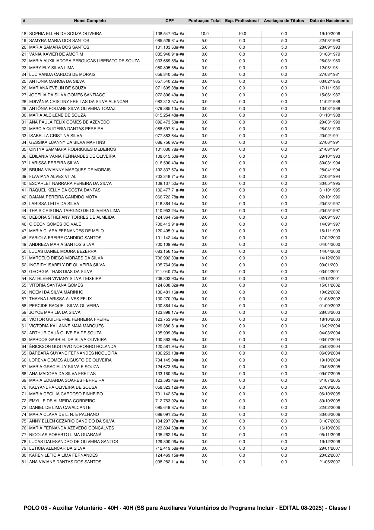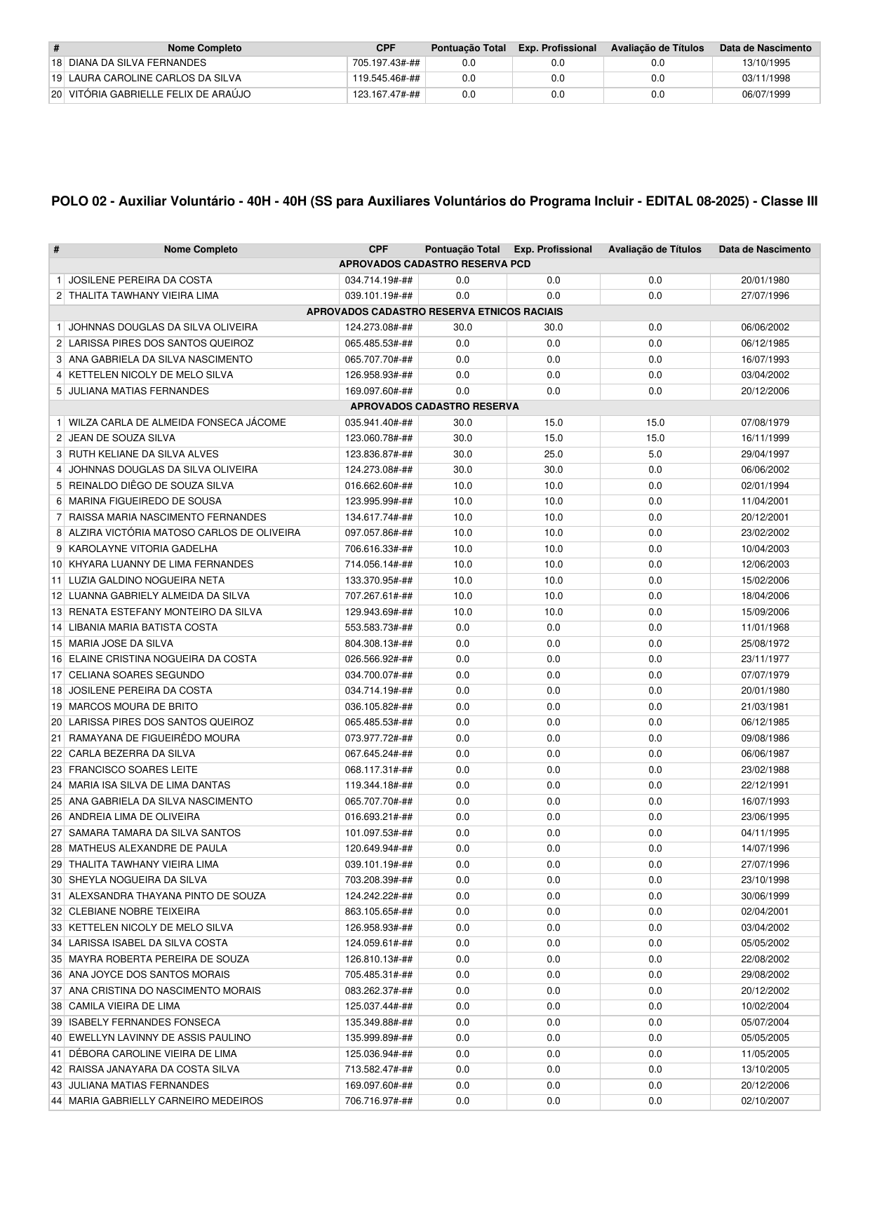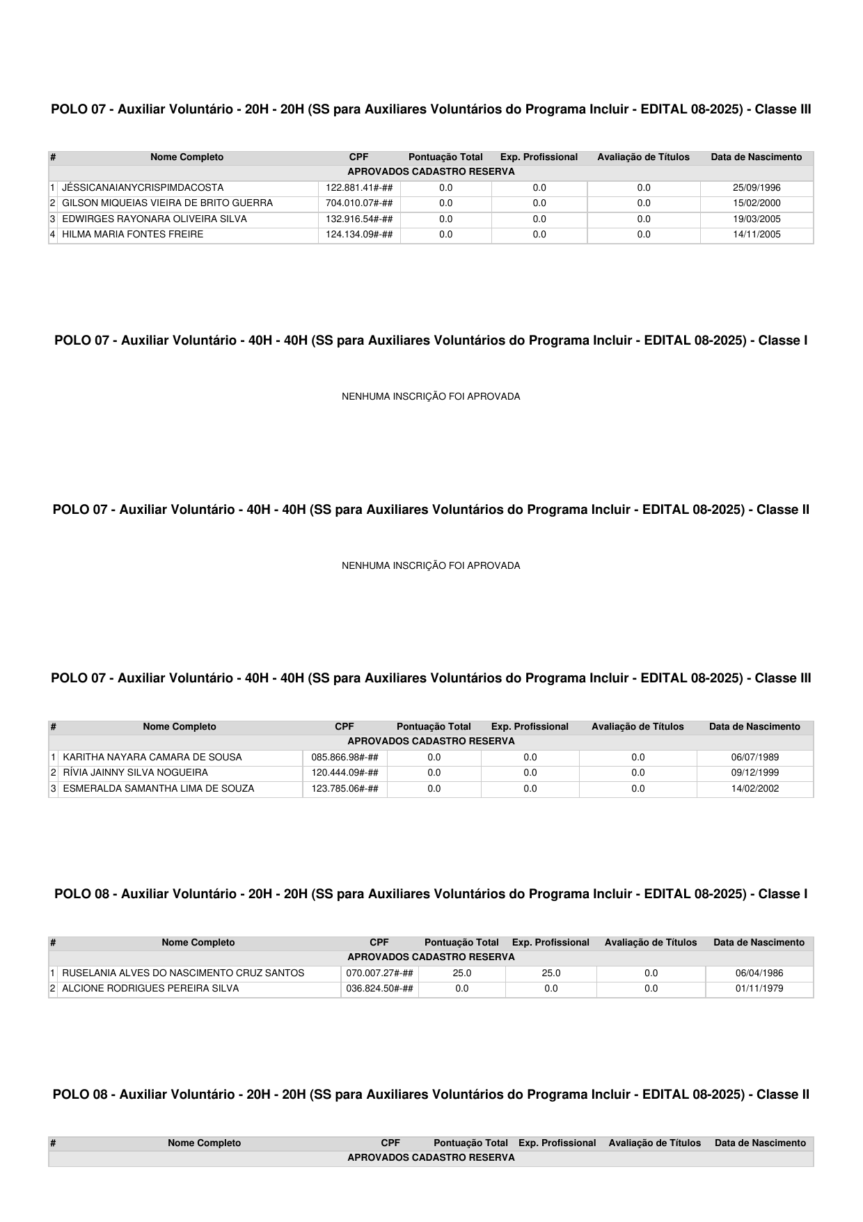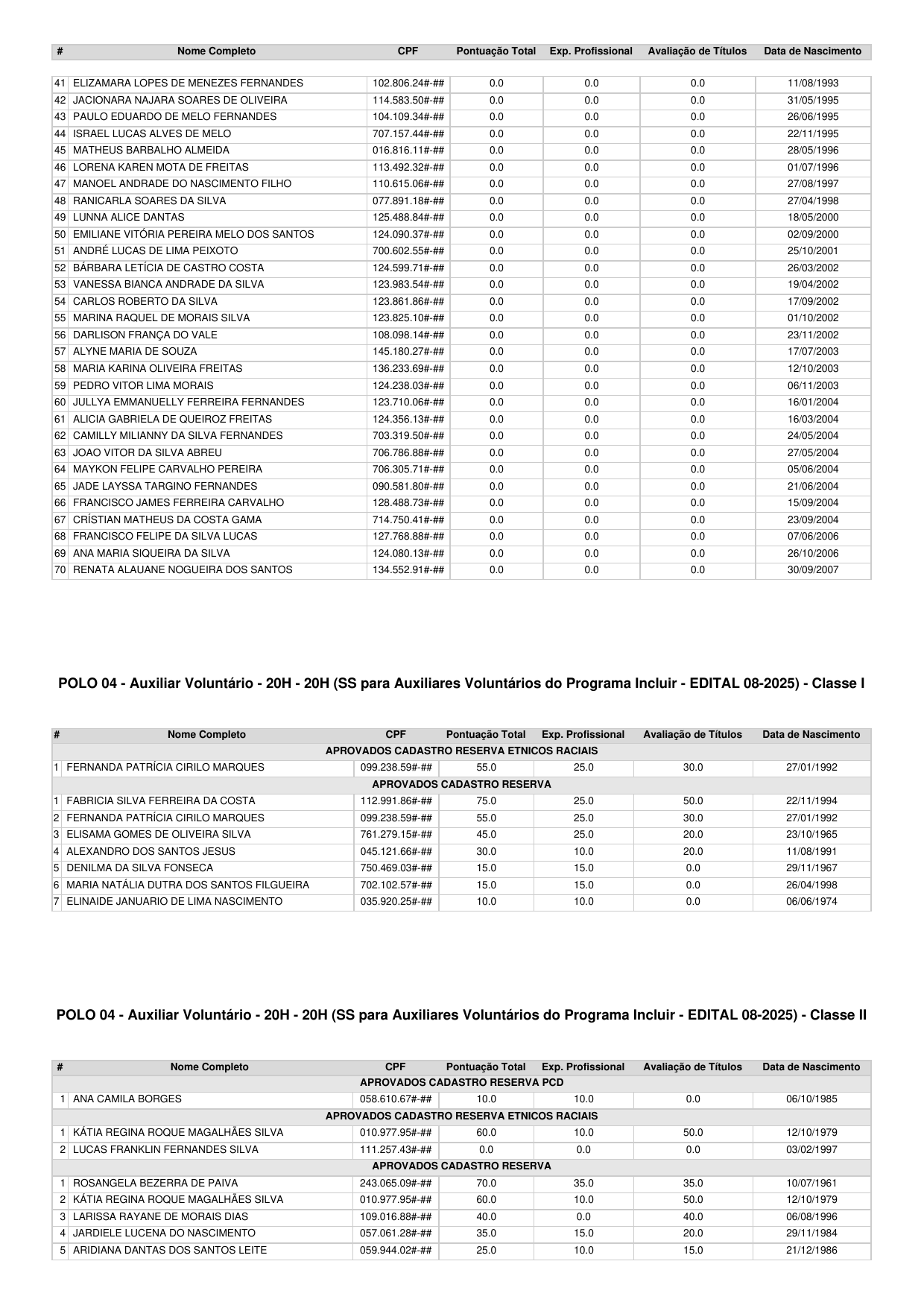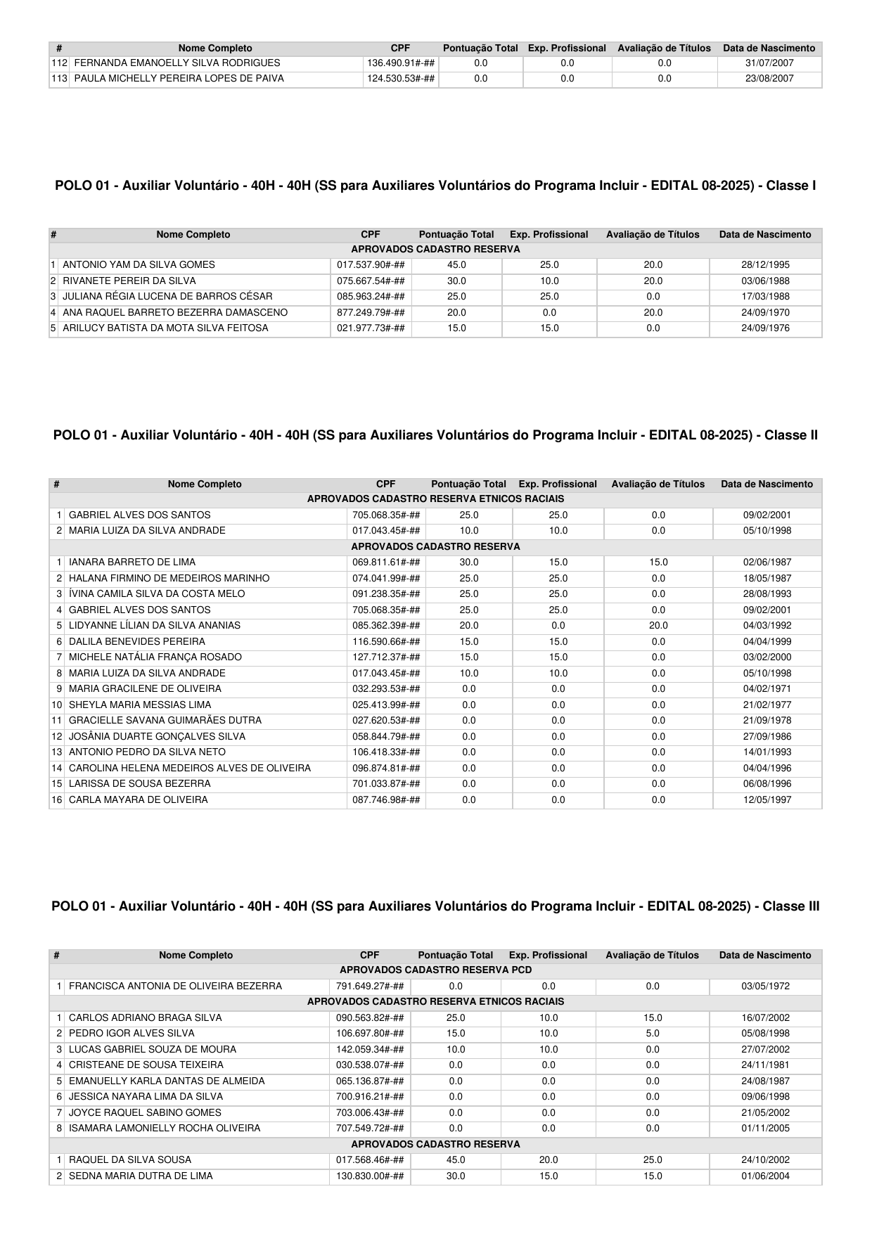 A Comissão da Seleção Simplificada – CSS, instituída pela Portaria nº 234-SME, publicada no Diário Oficial de Mossoró – DOM, edição de nº 731 do dia 29 de dezembro de 2025, torna público o resultado final homologado das inscrições para a Seleção Simplificada – SS, destinada à formação de cadastro de reserva para contratação de Auxiliares Voluntários, no âmbito do PROGRAMA INCLUIR da Secretaria Municipal de Educação.