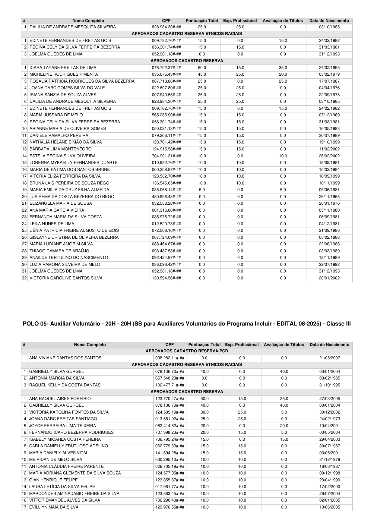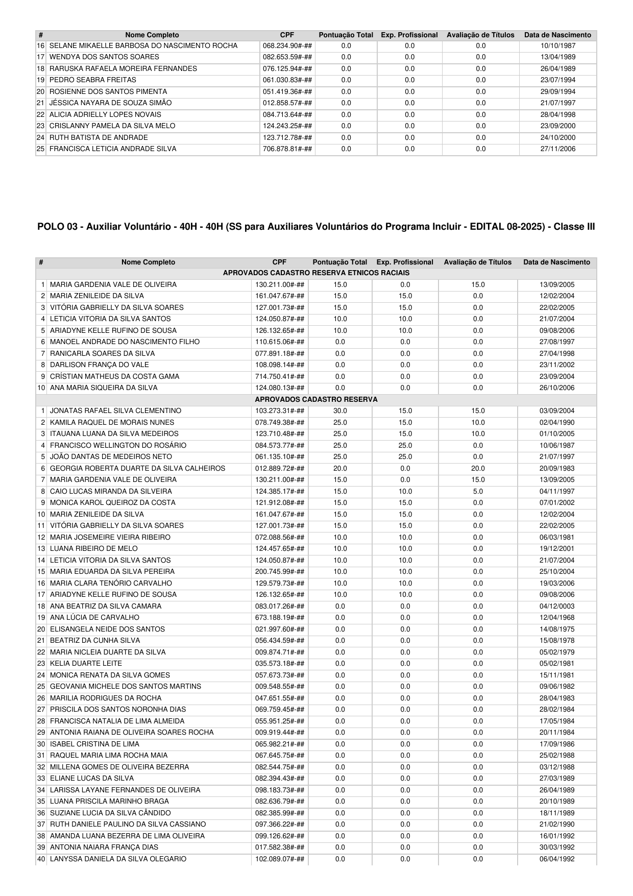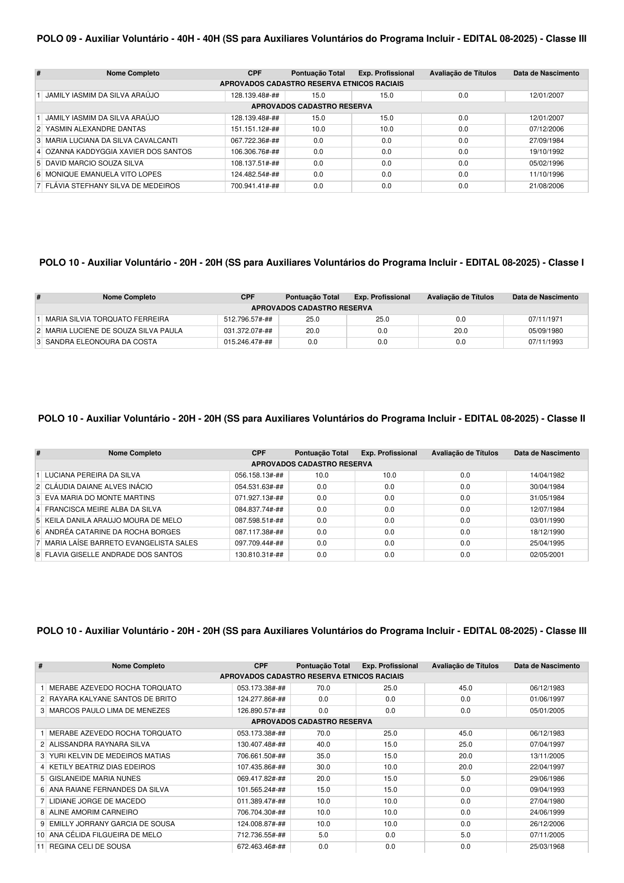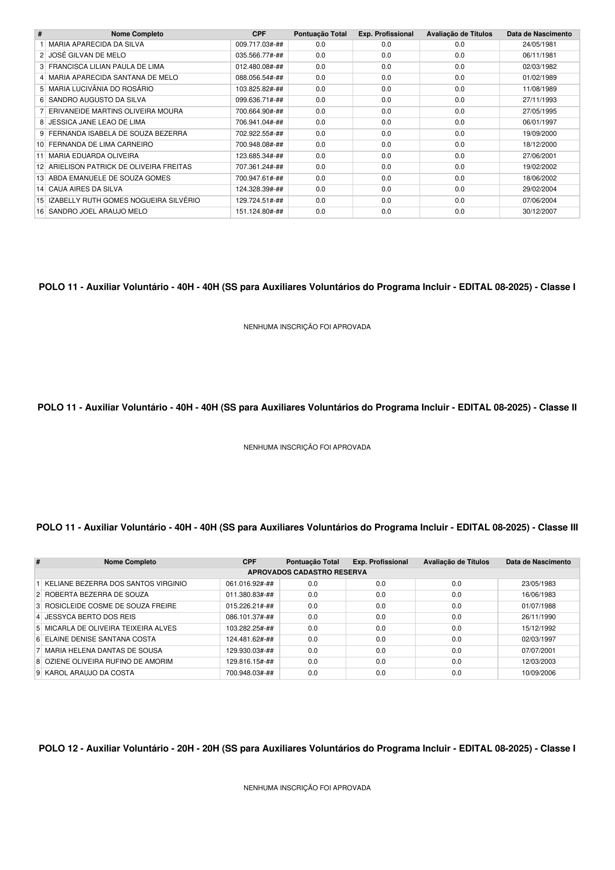 A Comissão da Seleção Simplificada – CSS, instituída pela Portaria nº 234-SME, publicada no Diário Oficial de Mossoró – DOM, edição de nº 731 do dia 29 de dezembro de 2025, torna público o resultado final homologado das inscrições para a Seleção Simplificada – SS, destinada à formação de cadastro de reserva para contratação de Auxiliares Voluntários, no âmbito do PROGRAMA INCLUIR da Secretaria Municipal de Educação.