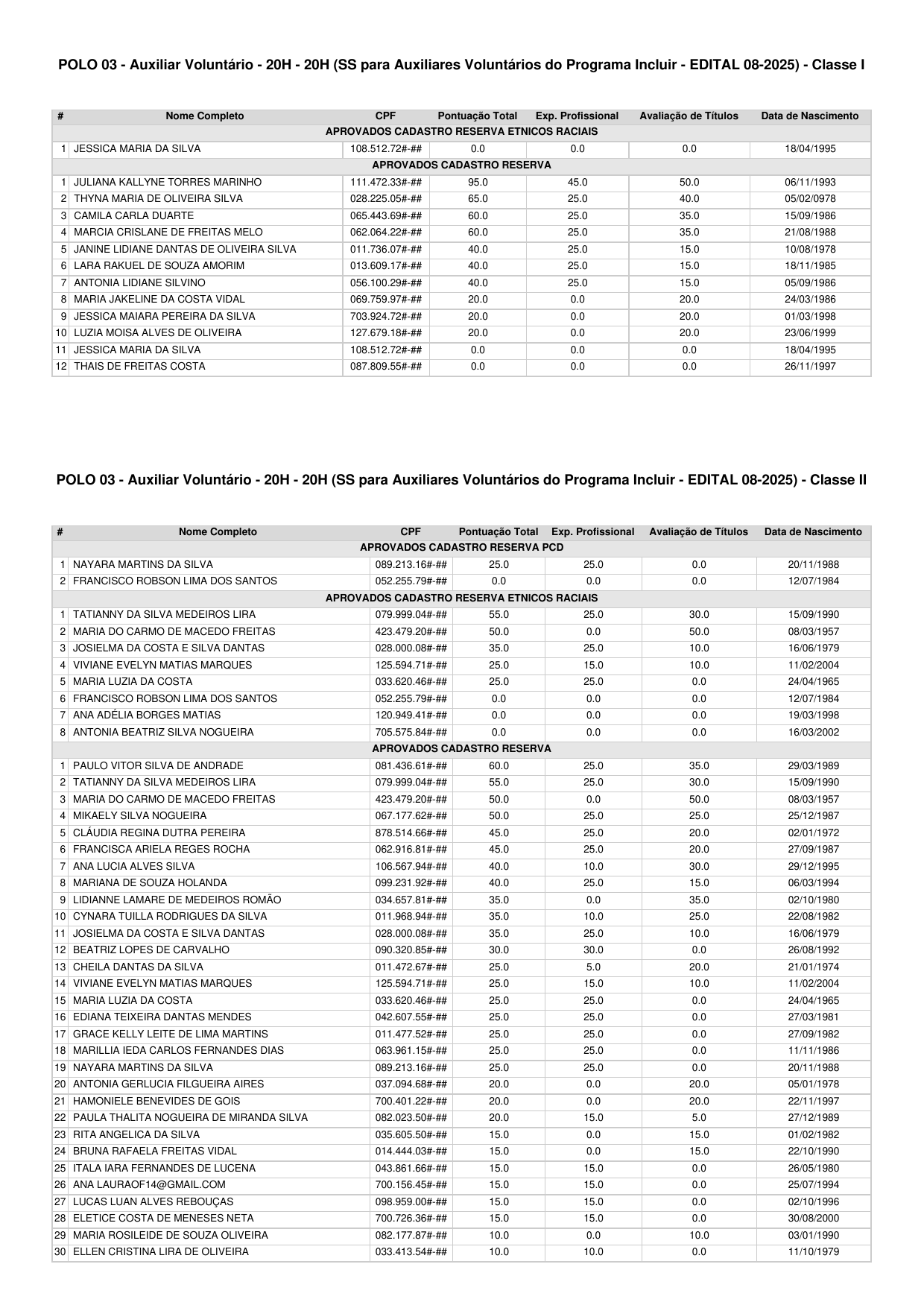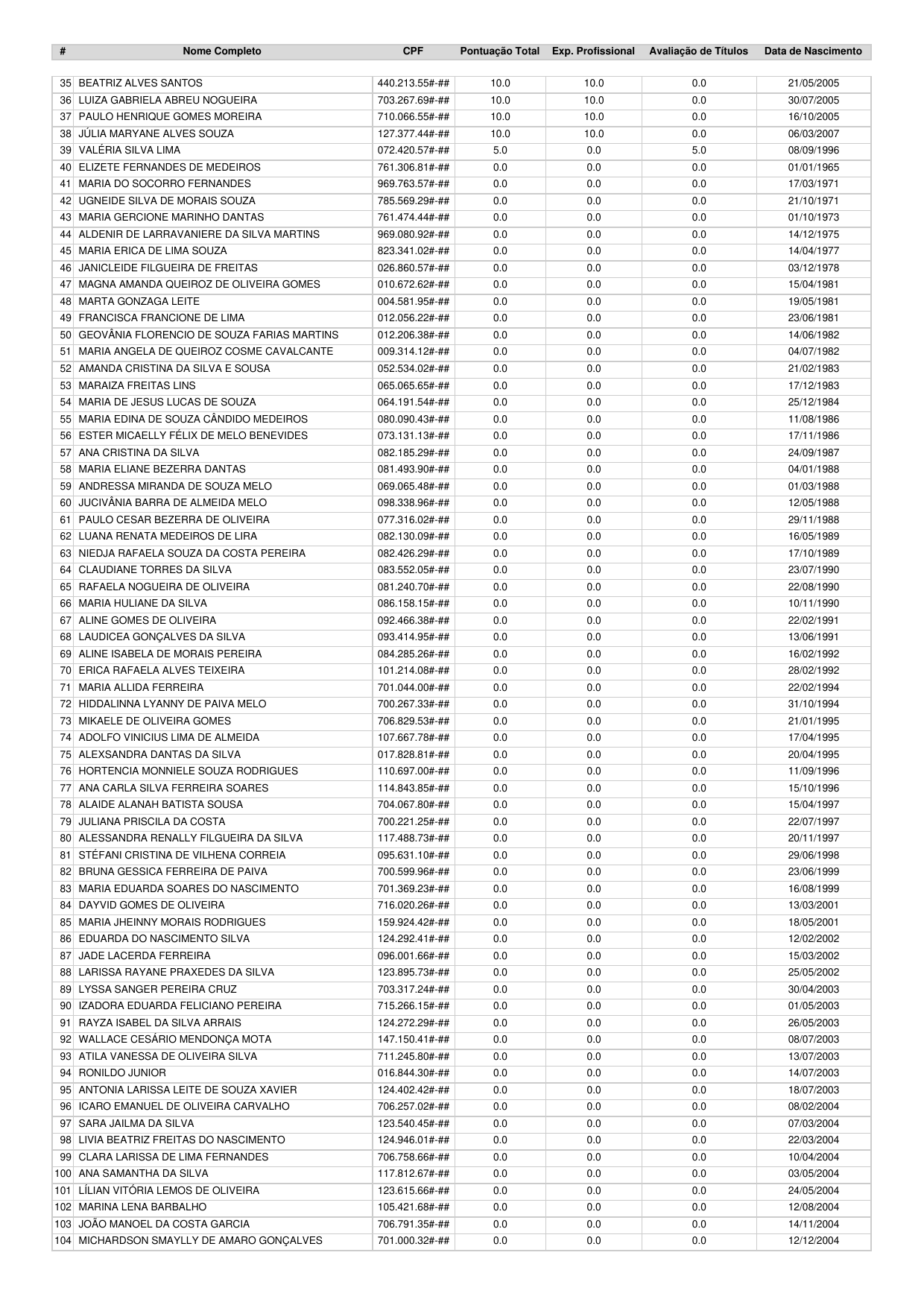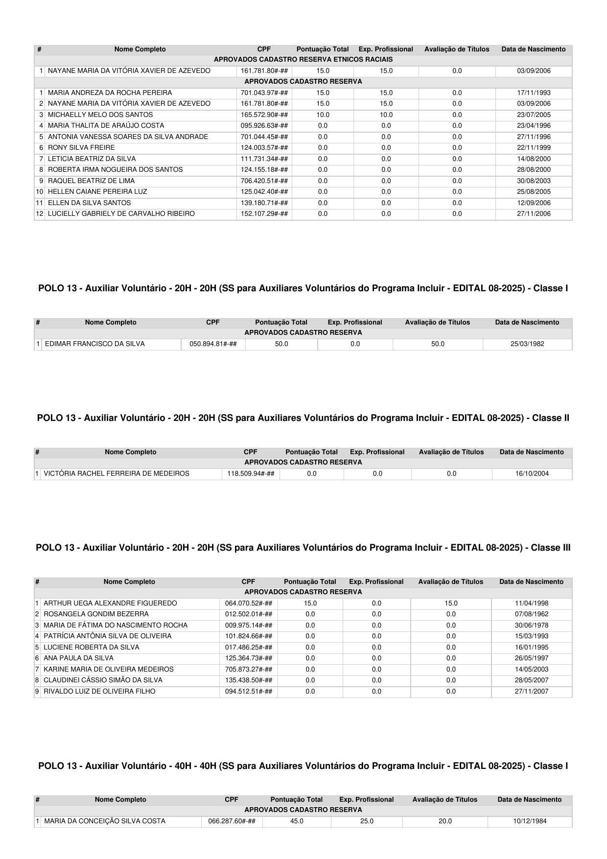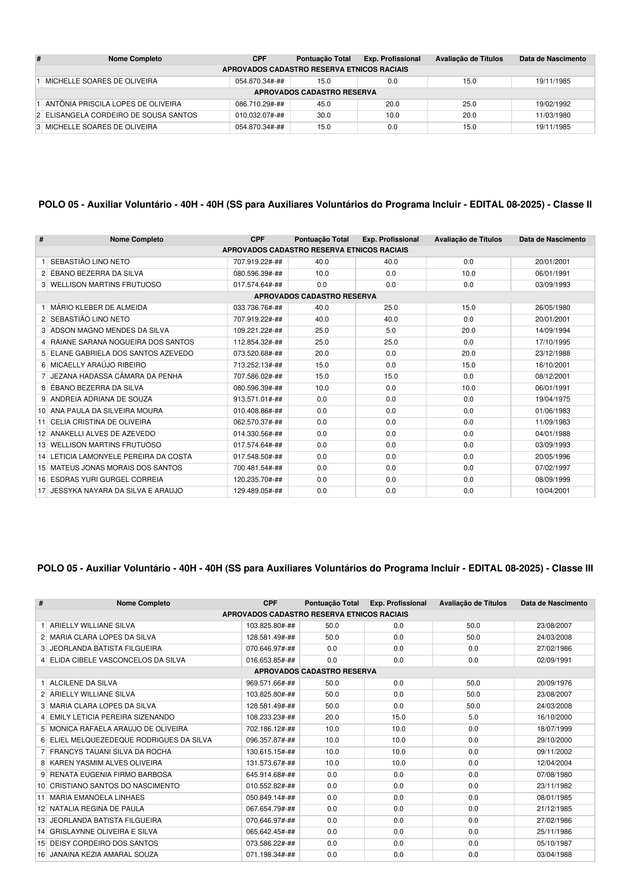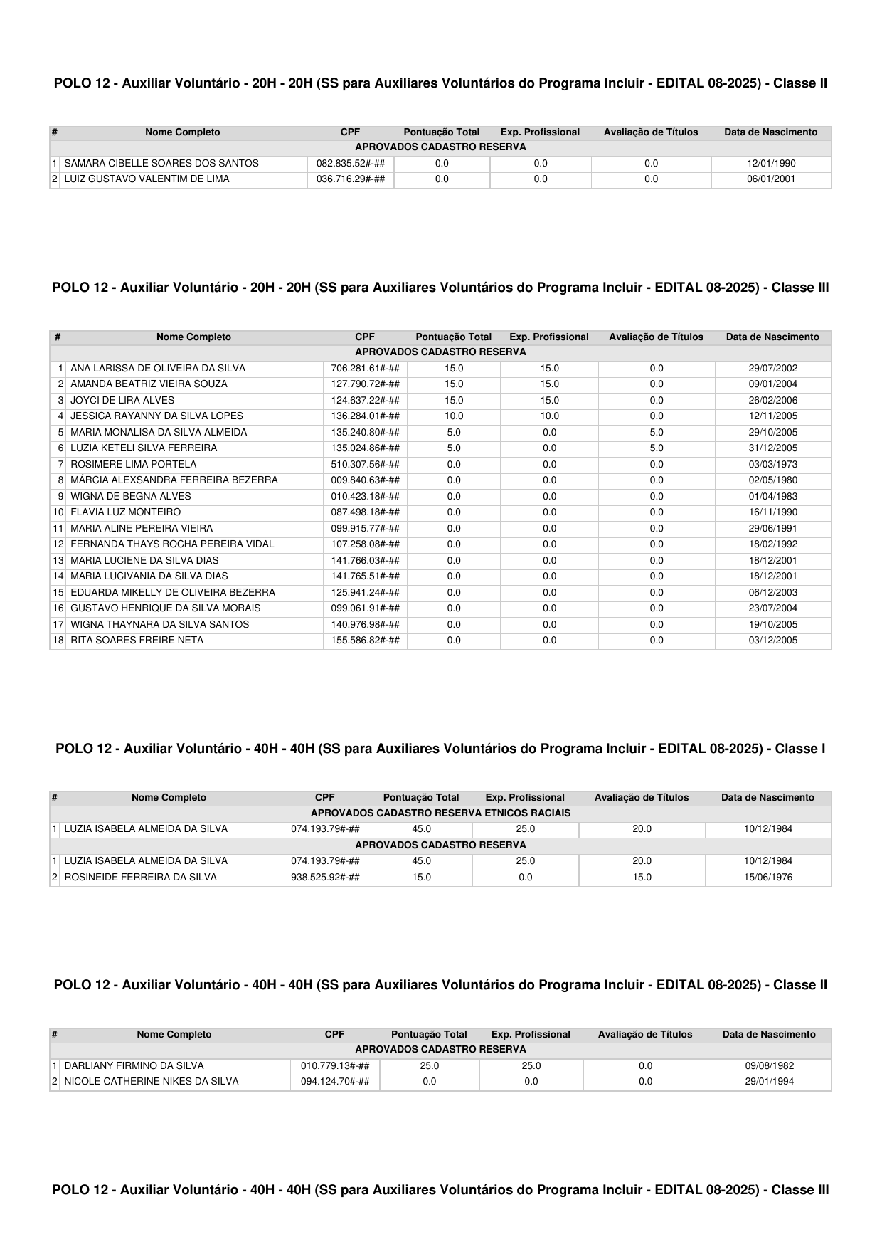 A Comissão da Seleção Simplificada – CSS, instituída pela Portaria nº 234-SME, publicada no Diário Oficial de Mossoró – DOM, edição de nº 731 do dia 29 de dezembro de 2025, torna público o resultado final homologado das inscrições para a Seleção Simplificada – SS, destinada à formação de cadastro de reserva para contratação de Auxiliares Voluntários, no âmbito do PROGRAMA INCLUIR da Secretaria Municipal de Educação.