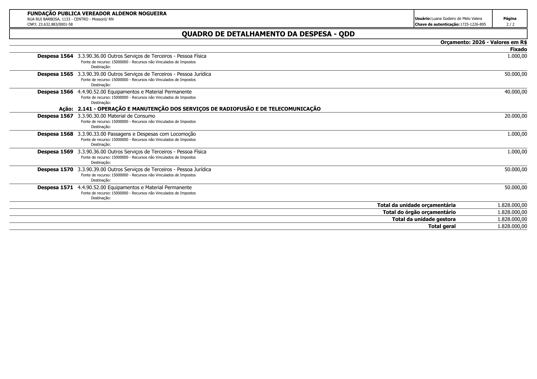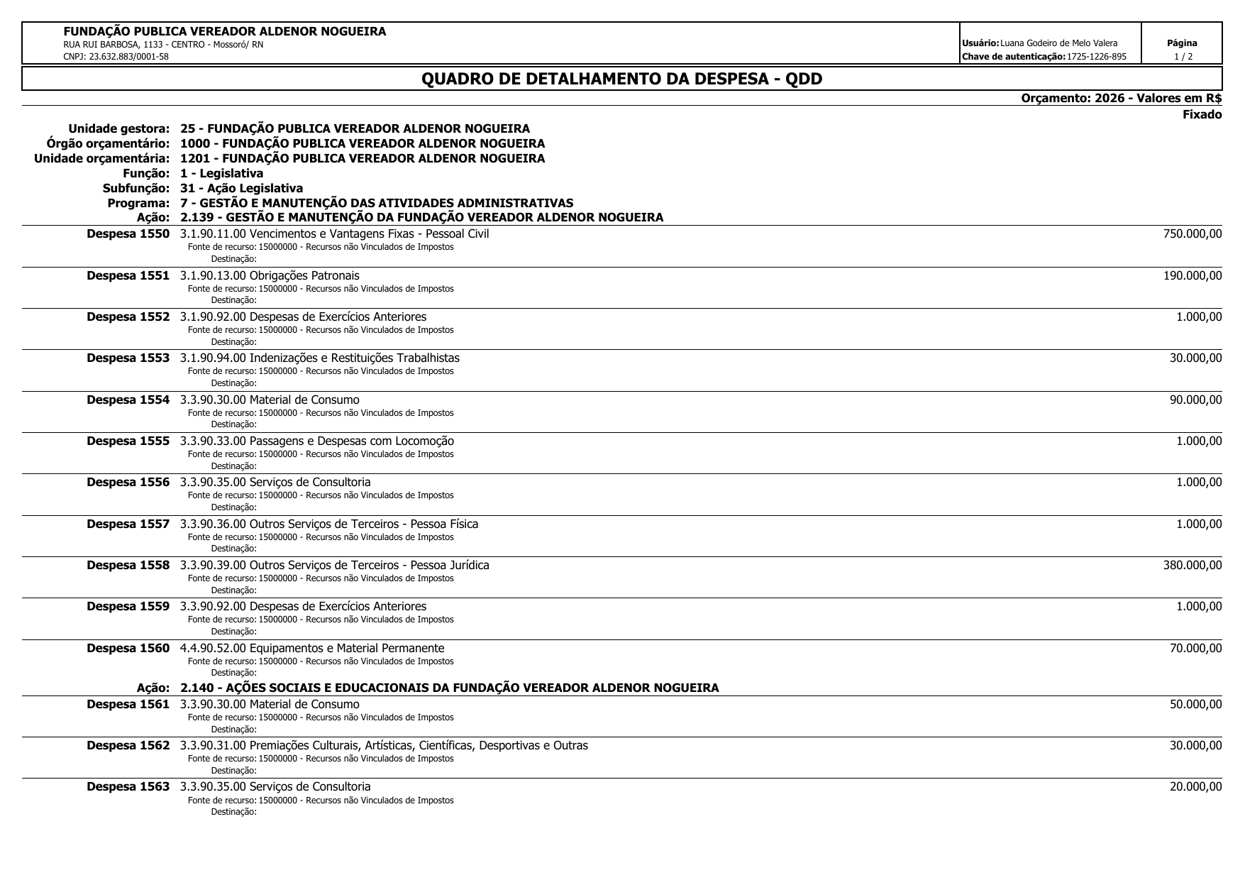 Art. 2º Fica criado o Quadro de Detalhamento de Despesas da Fundação Pública Vereador Aldenor Nogueira, com valor fixado em R$ 1.828.000,00 (Hum milhão, oitocentos e vinte e oito mil reais), para realização da programação financeira do exercício 2026, conforme anexo.