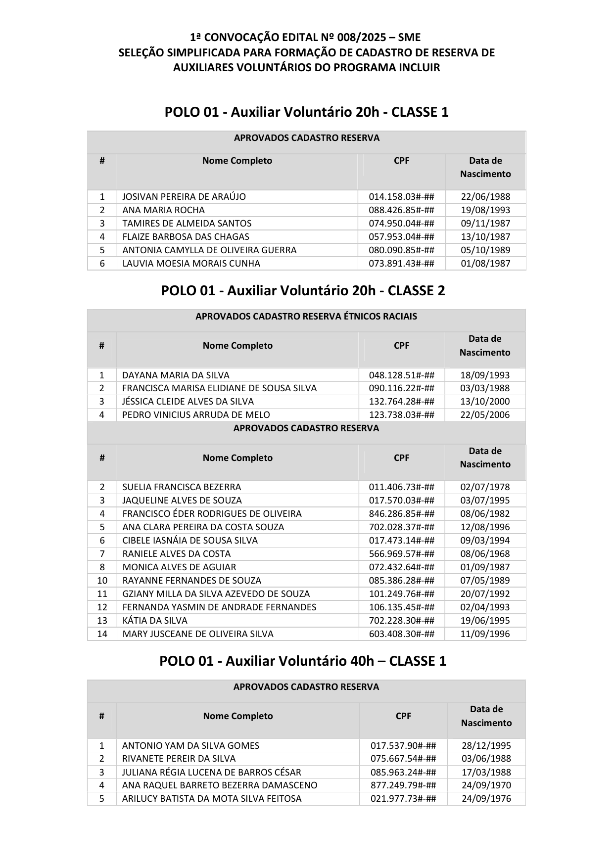 Art. 1º Ficam convocados, observada a ordem de classificação, os candidatos relacionados no Anexo Único desta Portaria, aprovados na Seleção Simplificada realizada com fundamento no Edital nº 08/2025 da Secretaria Municipal de Educação (SME), para realização do Curso de Formação Continuada em Prestação de Assistência a Pessoas com Deficiência e Transtorno do Espectro Autista, e entrega da documentação necessária à celebração do Termo de Adesão ao Projeto Incluir.