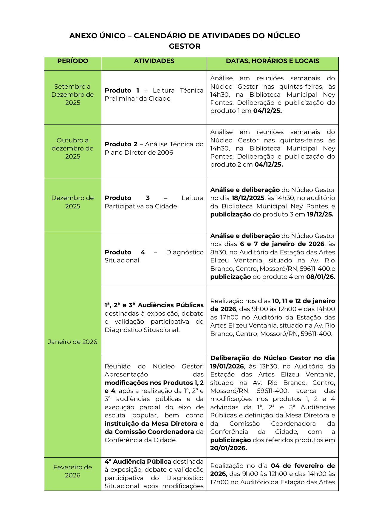 CONSIDERANDO a deliberação do Núcleo Gestor, em sua 25ª reunião, realizada em 19 de janeiro de 2026, pela redefinição das datas, horários e locais das atividades;
