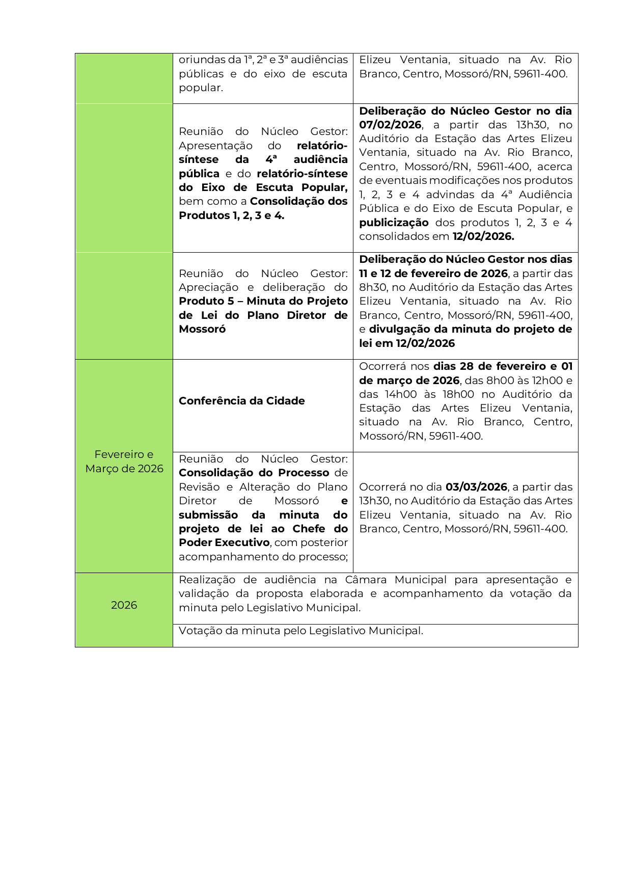 CONSIDERANDO a deliberação do Núcleo Gestor, em sua 25ª reunião, realizada em 19 de janeiro de 2026, acerca da realização da Conferência da Cidade de Mossoró;