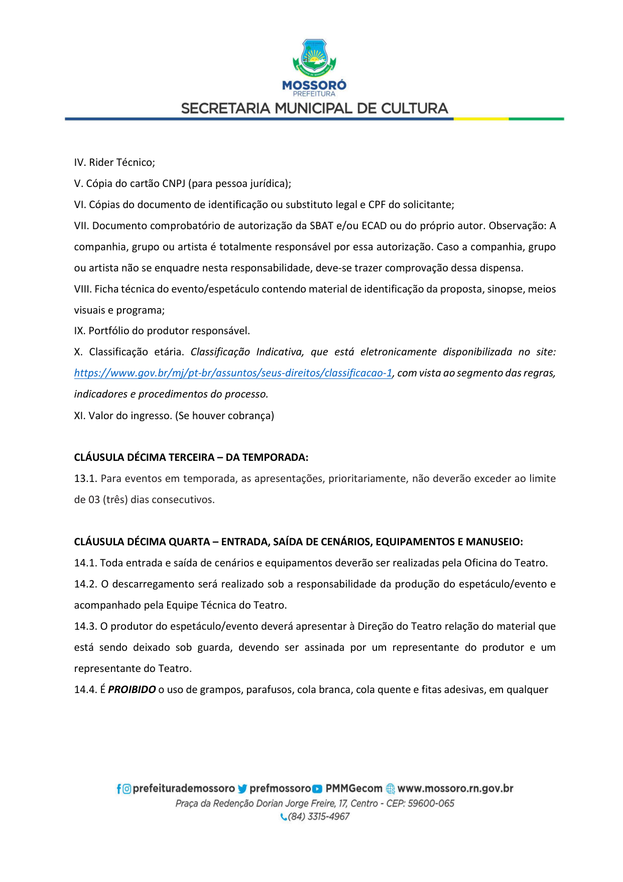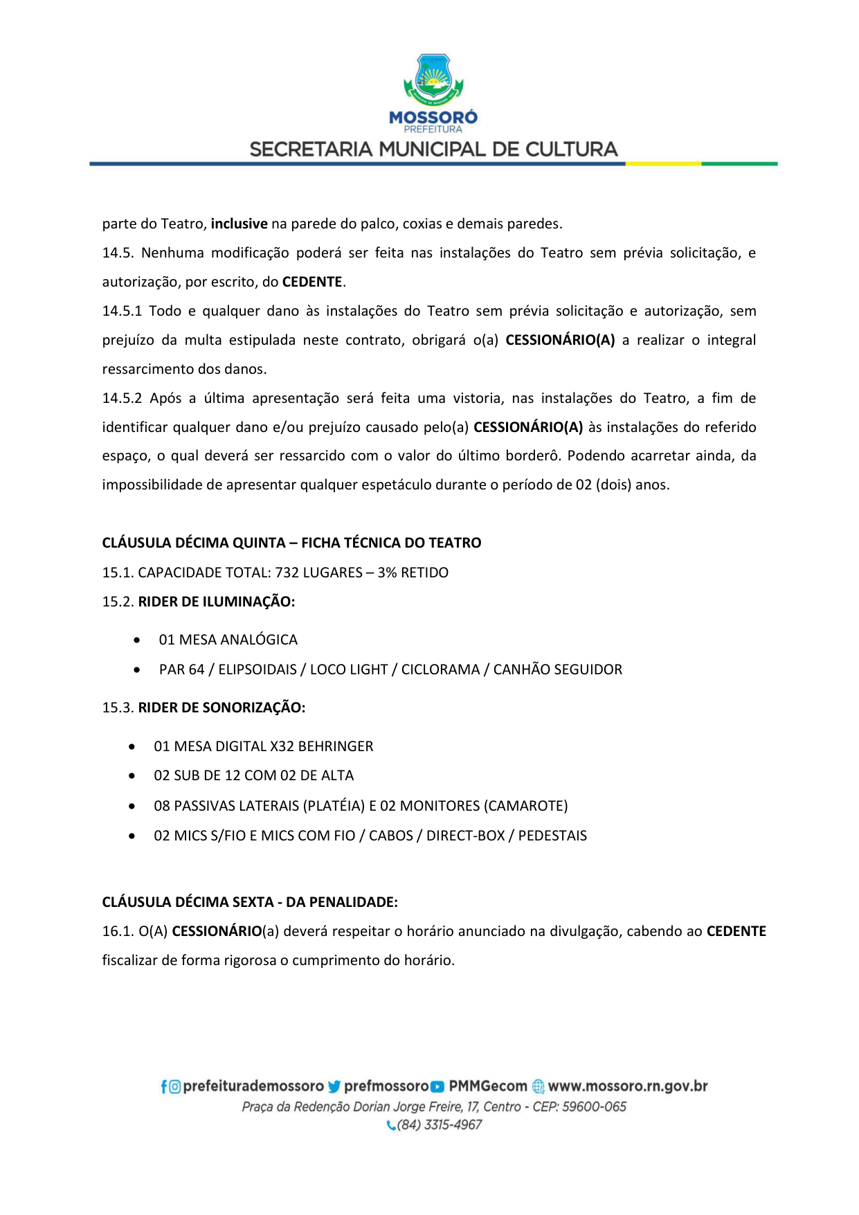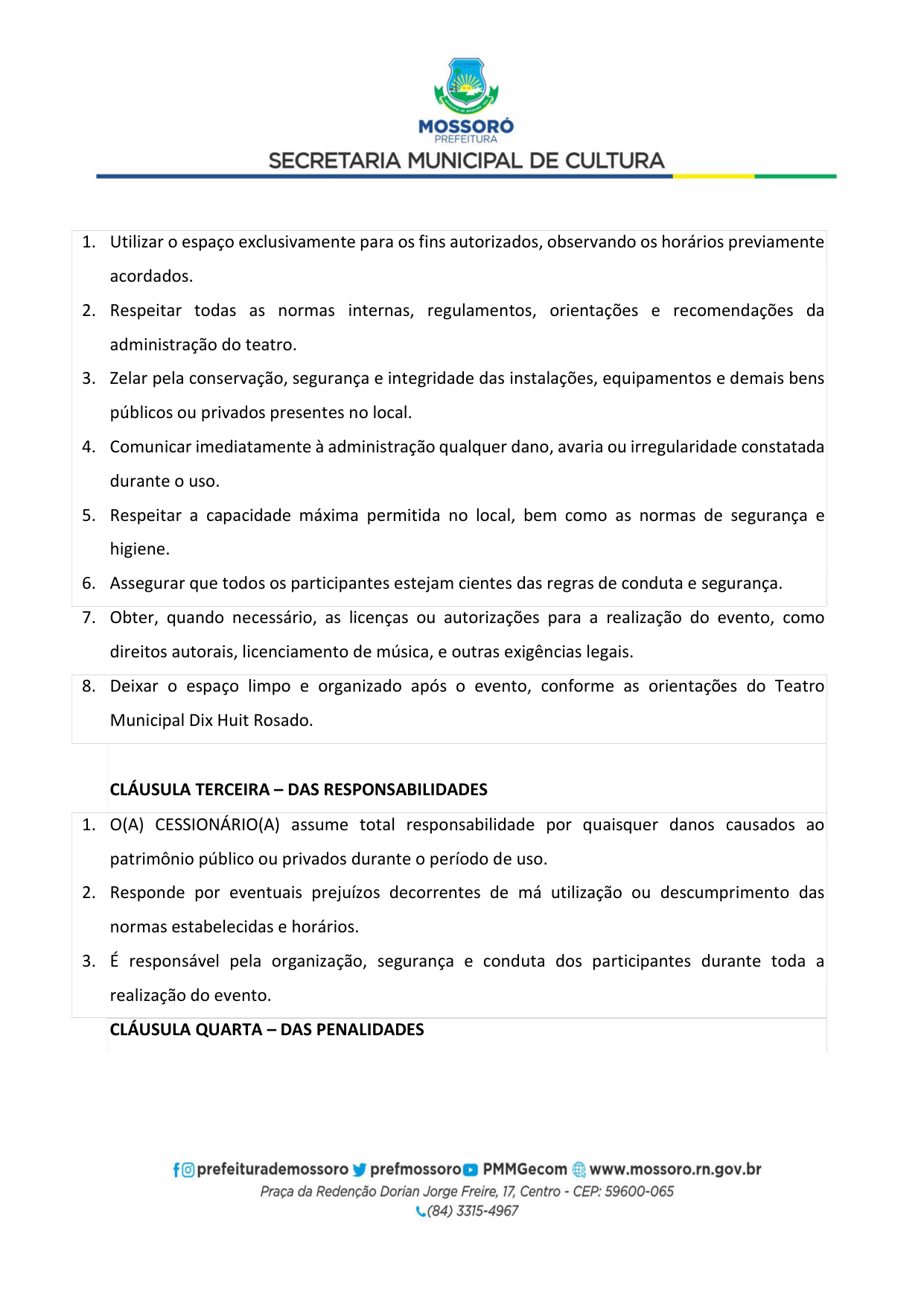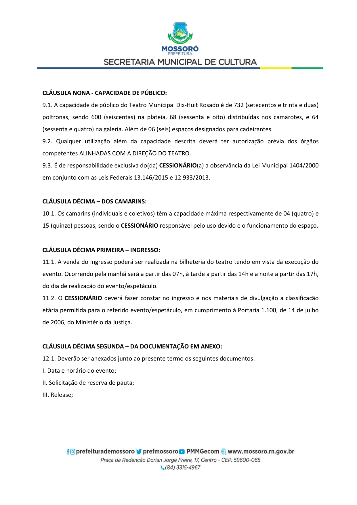 Art. 5º - A utilização do Teatro Municipal Dix-Huit Rosado dar-se-á mediante requerimento formal (Pedido de Pauta por ofício) da parte interessada, por e-mail (teatrodixhuit@prefeiturademossoro.com.br), dirigido à Direção Geral, e que será avaliado e deliberado de forma conjunta com a Secretaria Municipal de Cultura.