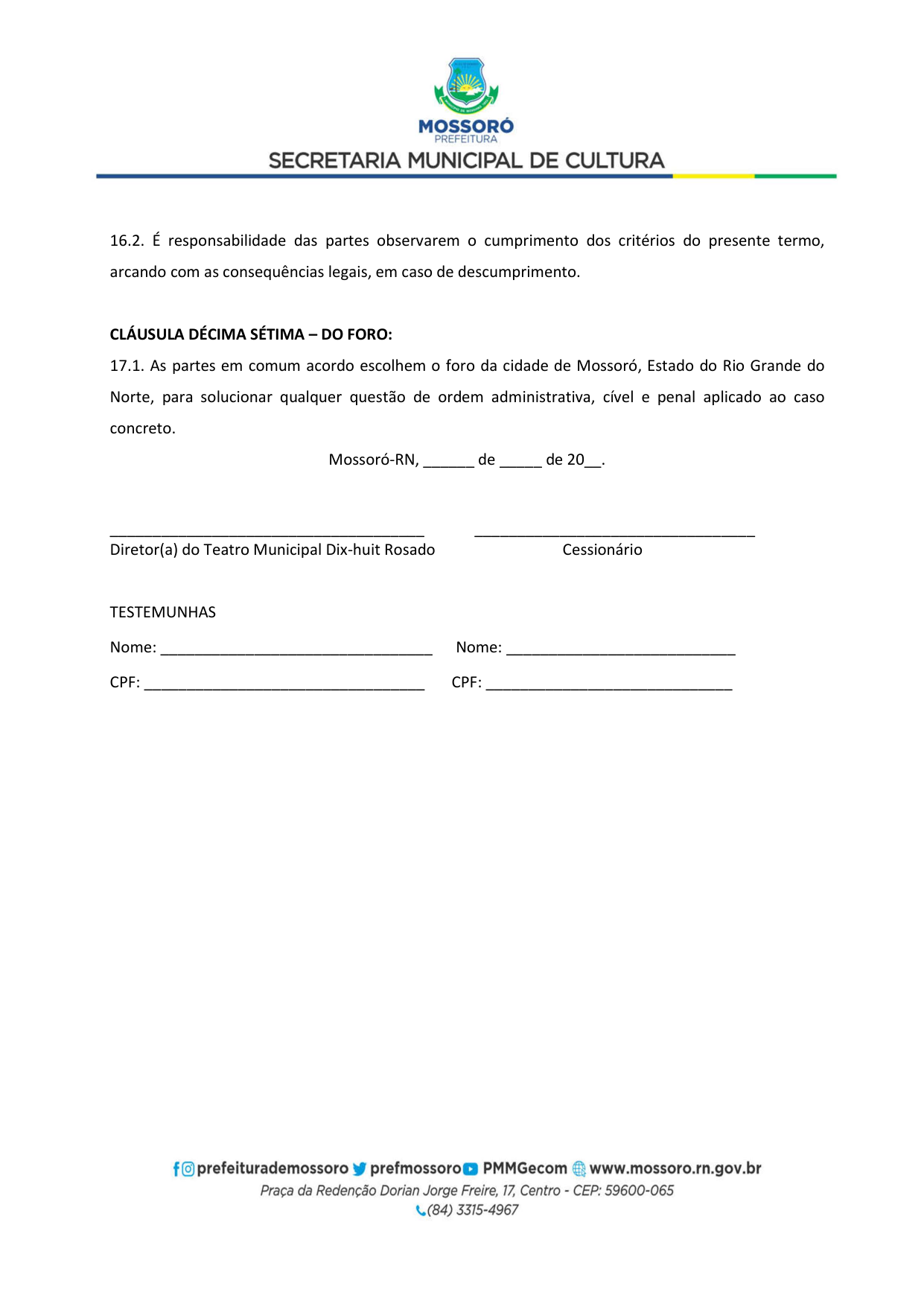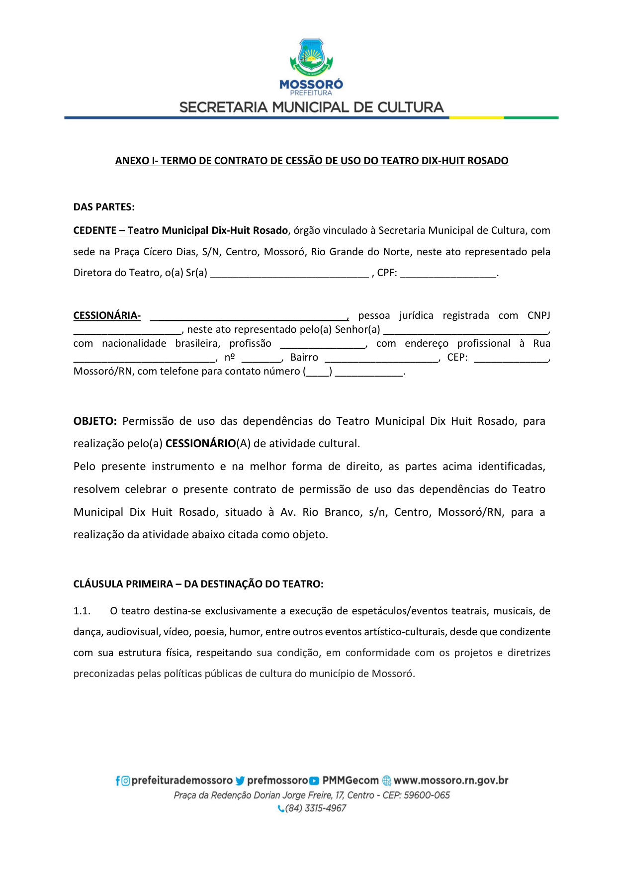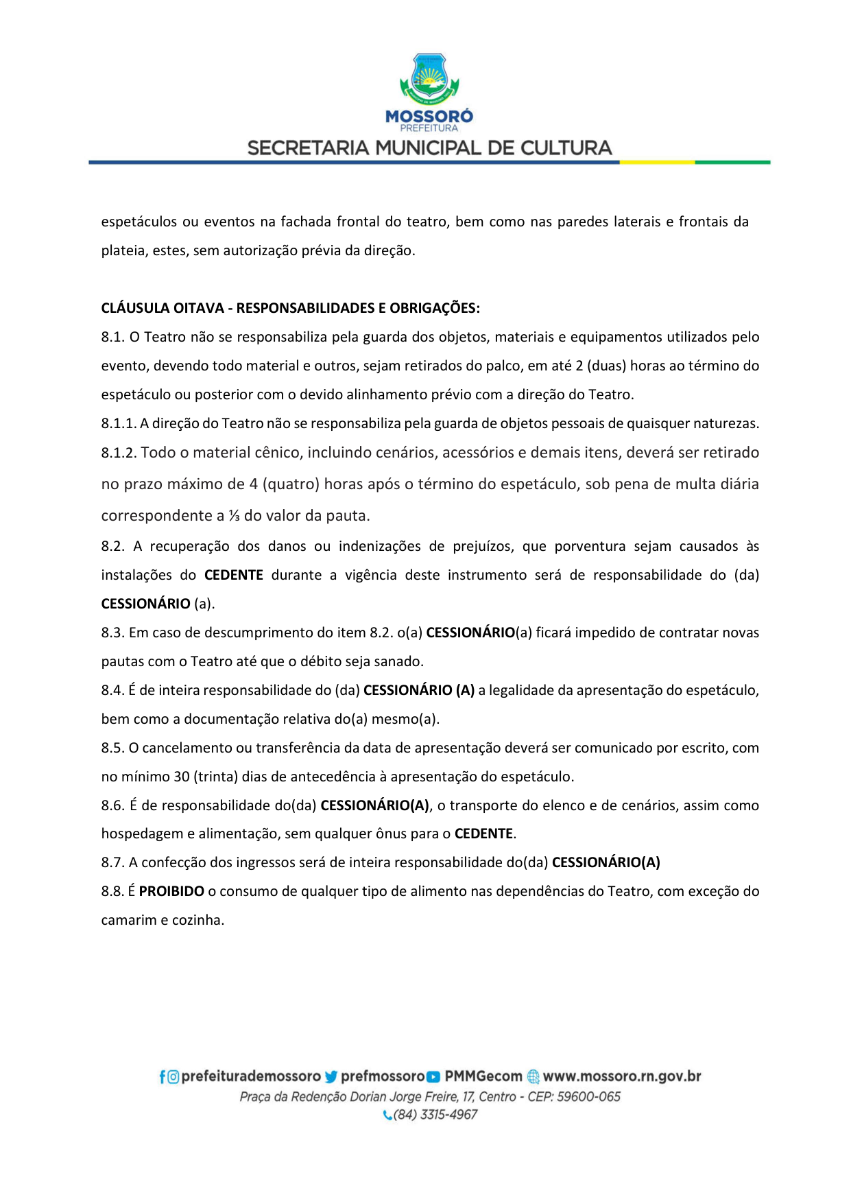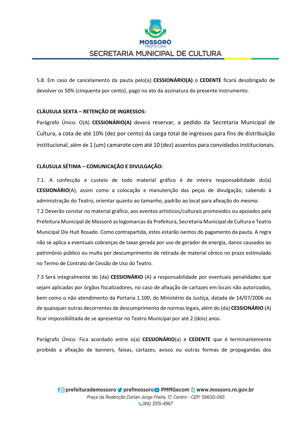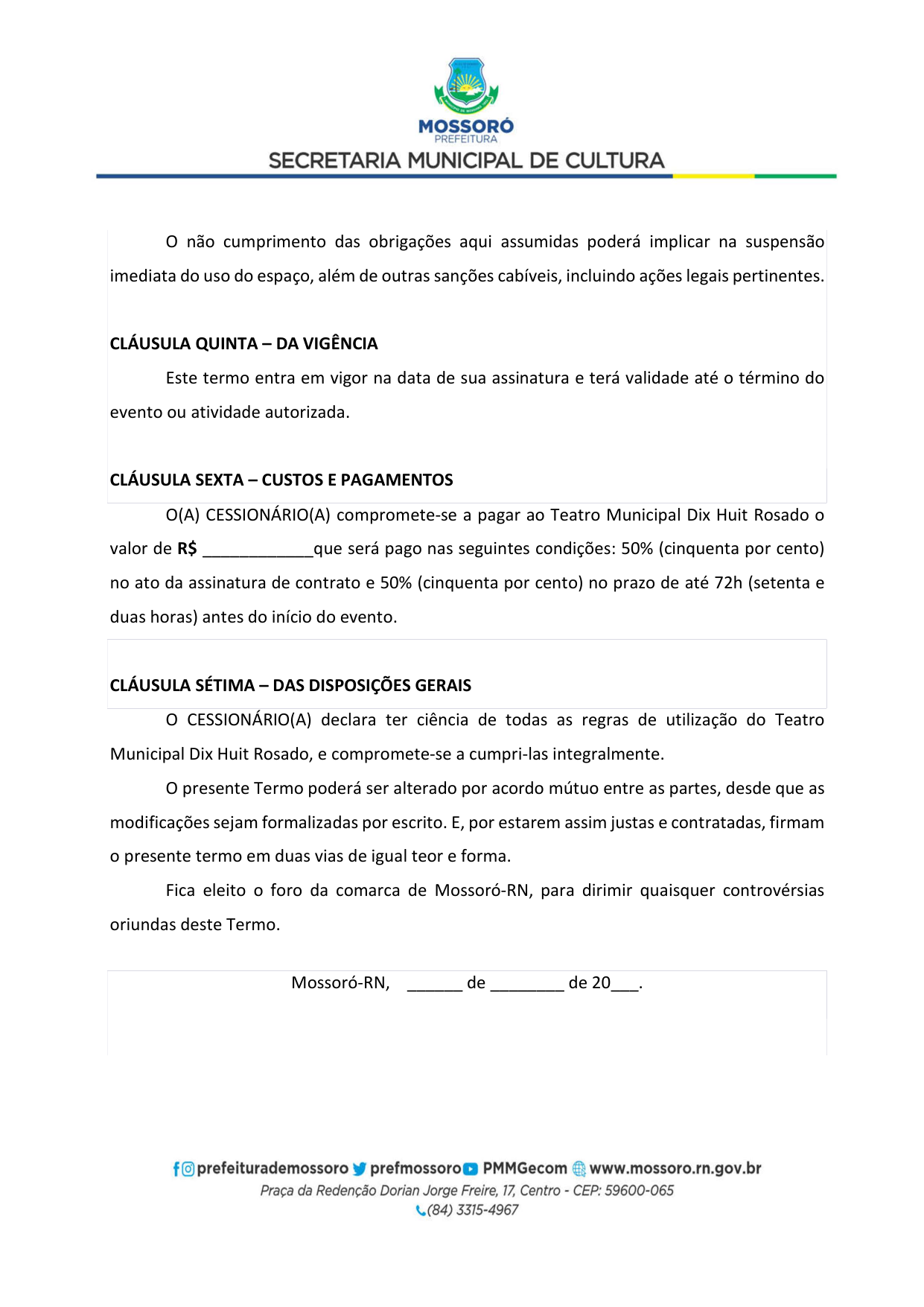 Art. 5º - A utilização do Teatro Municipal Dix-Huit Rosado dar-se-á mediante requerimento formal (Pedido de Pauta por ofício) da parte interessada, por e-mail (teatrodixhuit@prefeiturademossoro.com.br), dirigido à Direção Geral, e que será avaliado e deliberado de forma conjunta com a Secretaria Municipal de Cultura.