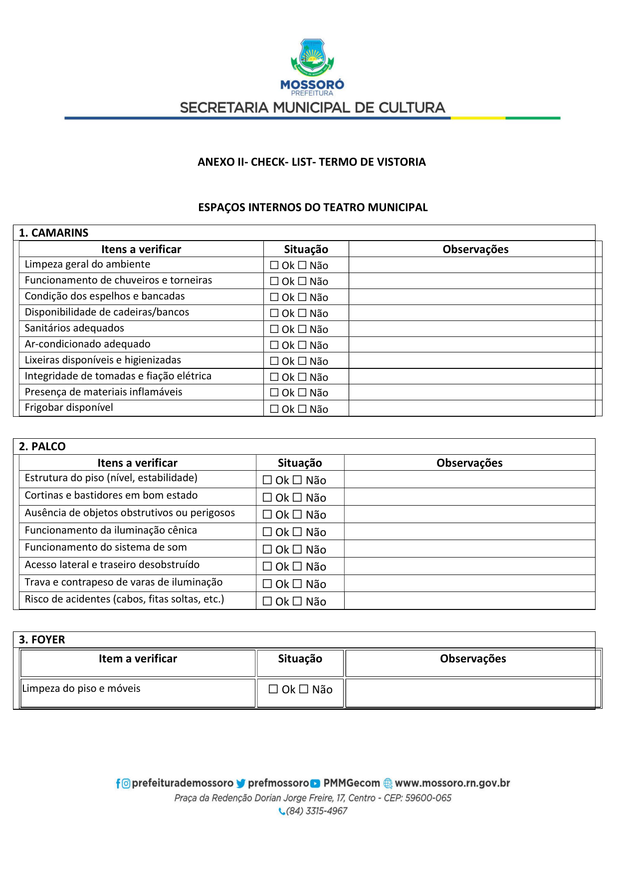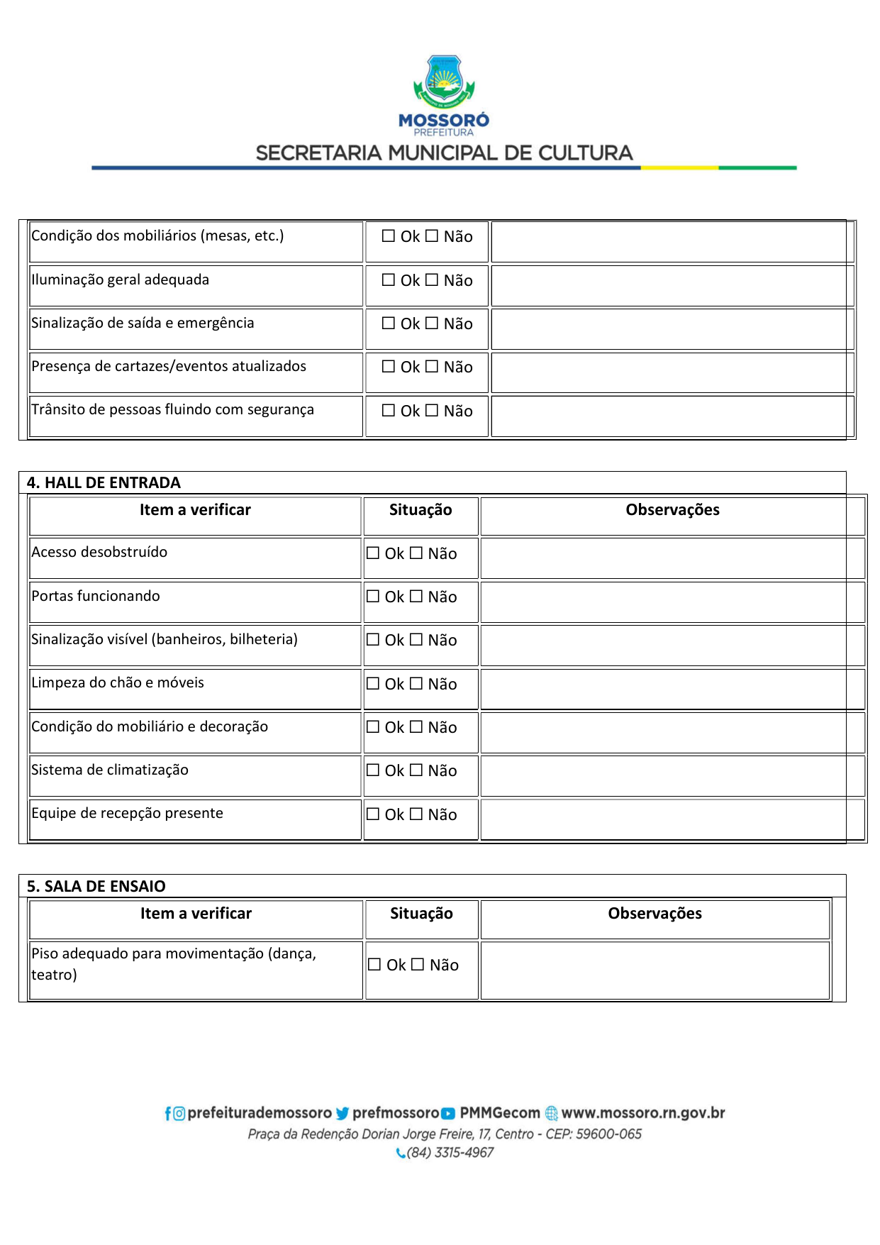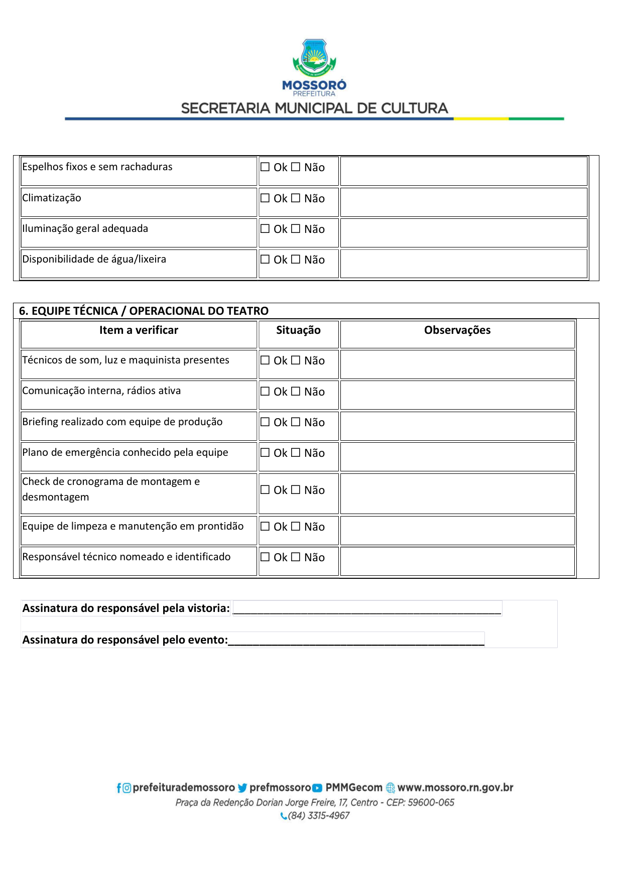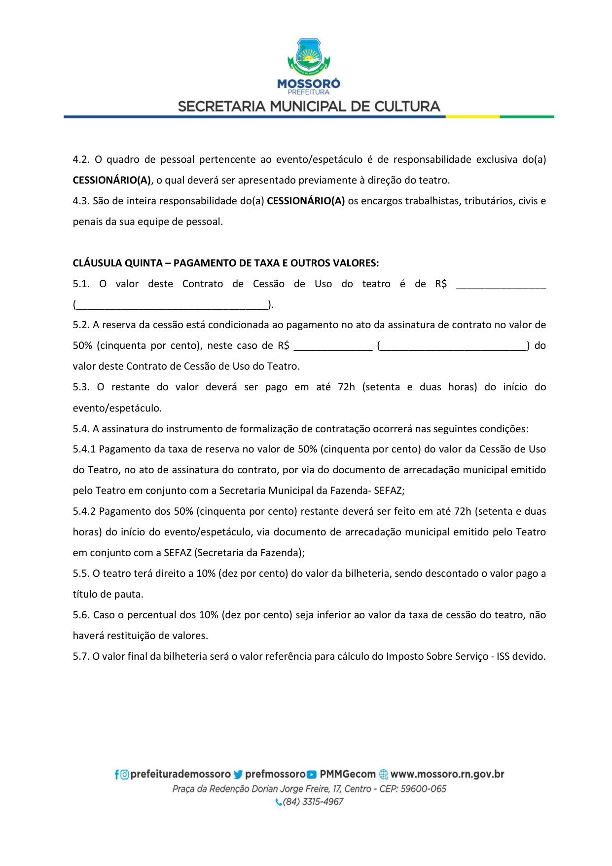 Art. 5º - A utilização do Teatro Municipal Dix-Huit Rosado dar-se-á mediante requerimento formal (Pedido de Pauta por ofício) da parte interessada, por e-mail (teatrodixhuit@prefeiturademossoro.com.br), dirigido à Direção Geral, e que será avaliado e deliberado de forma conjunta com a Secretaria Municipal de Cultura.