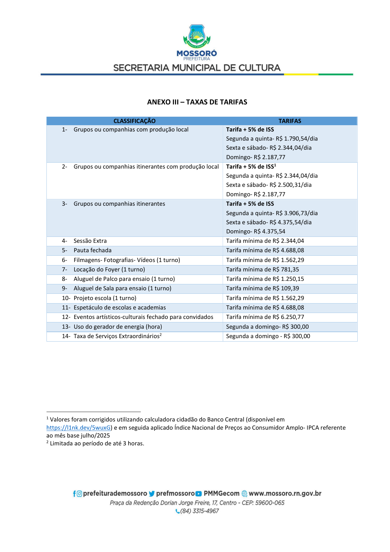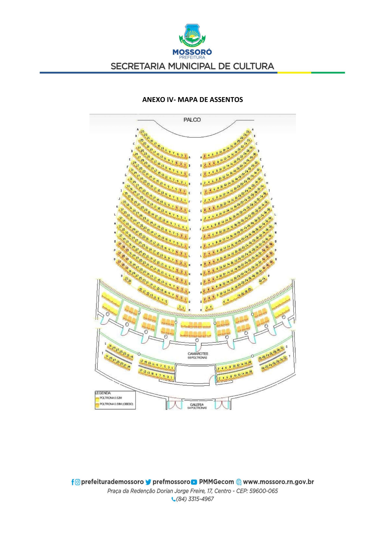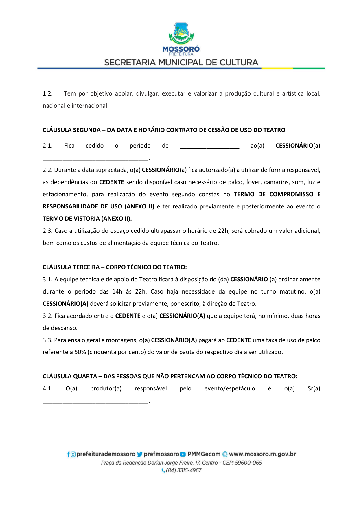 Processo Administrativo nº 08.000033/2026-04. A Secretaria Municipal de Cultura de Mossoró/RN, torna público aos interessados, pessoas físicas e jurídicas, a abertura do CREDENCIAMENTO Nº 01/2026-SMC, cujo objeto é o “Credenciamento de artistas, músicos e profissionais de arte e cultura para compor a programação dos eventos Mossoró Cidade Junina 2026 e Mossoró Sal e Luz 2026”. Inscrições gratuitas e de forma eletrônica através do https://smic.mossoro.rn.gov.br, das 09h00min do dia 05/02/2026 às 23h59min do dia 19/02/2026.Edital através: https://smic.mossoro.rn.gov.br, https://prefeiturademossoro.com.br e https://www.gov.br/pncp/pt-br.
