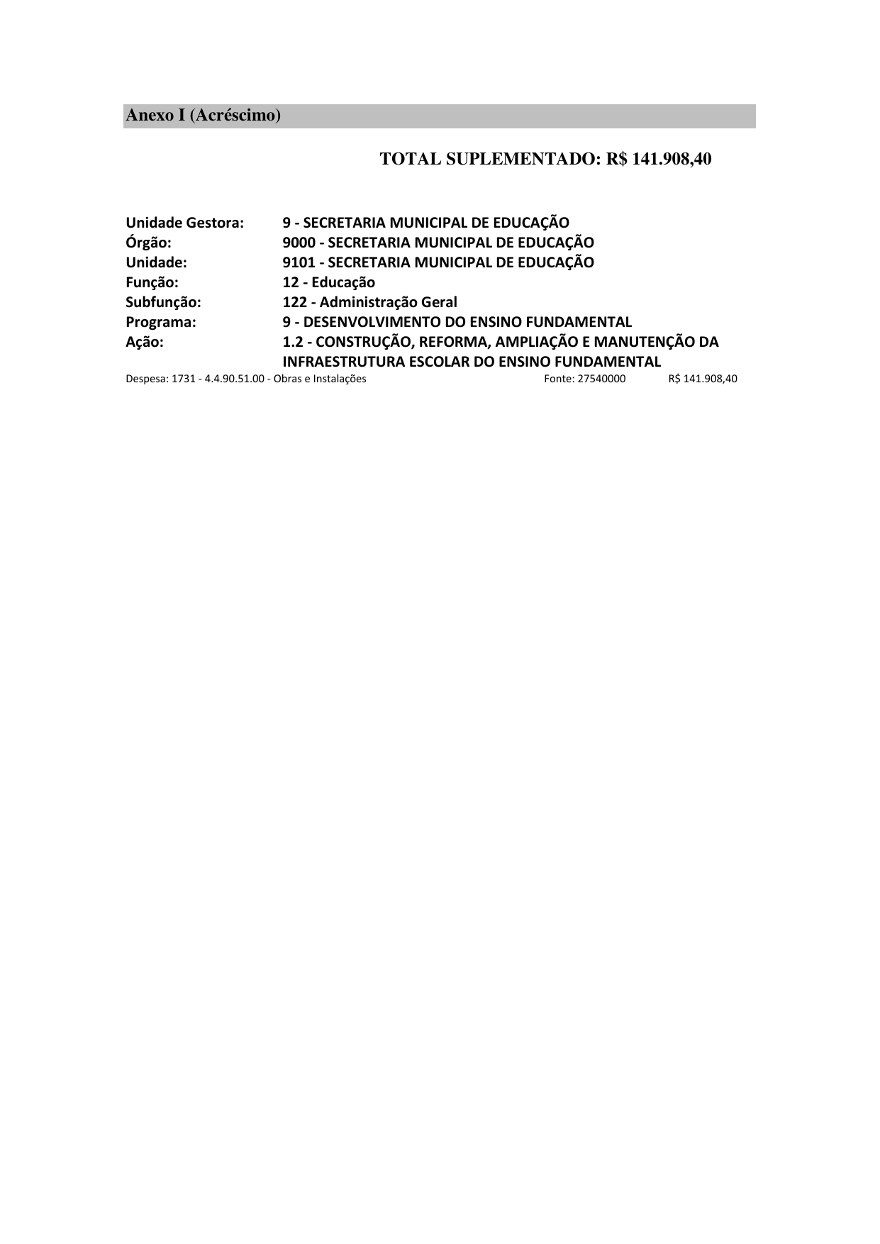 Art. 1º Fica aberto, no corrente exercício, Crédito Suplementar por Superávit Financeiro no valor de R$ 141.908,40 (cento e quarenta e um mil e novecentos e oito reais e quarenta centavos) às dotações especificadas no Anexo I deste Decreto.