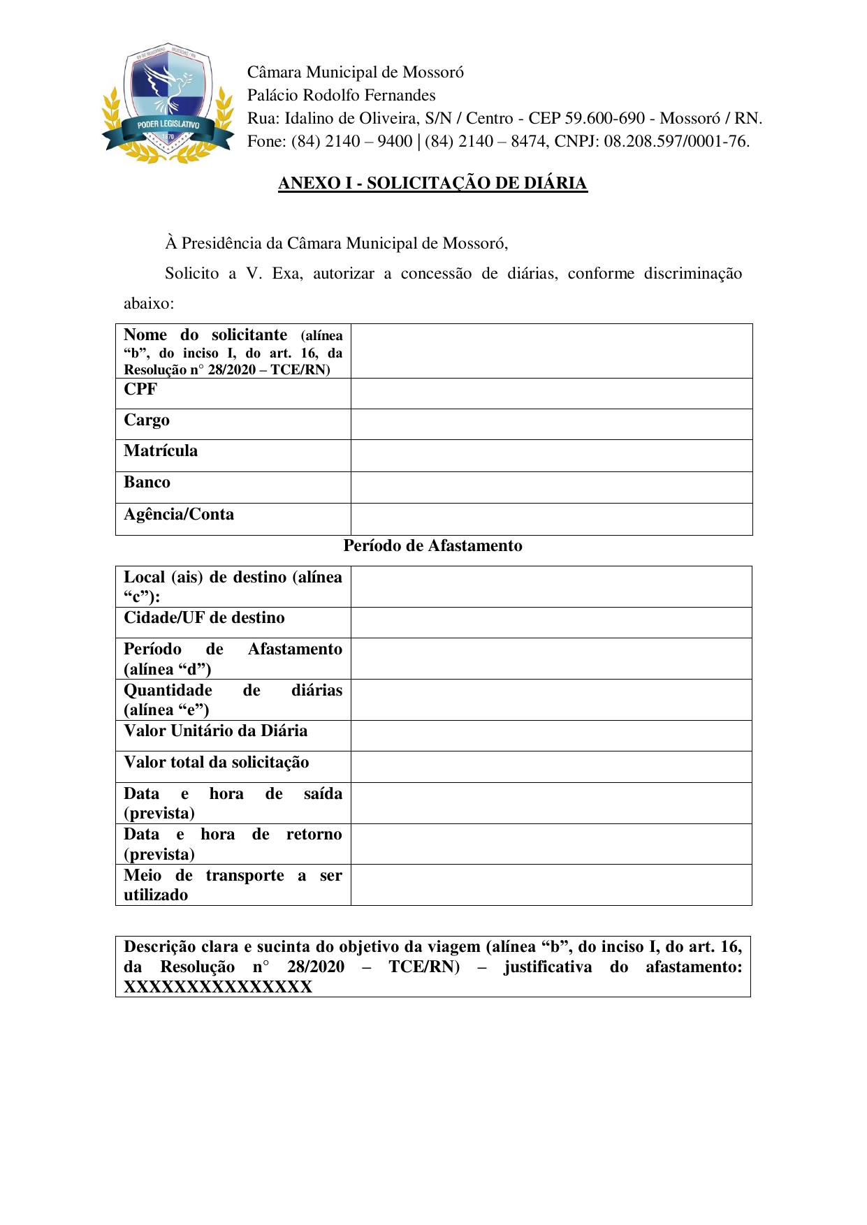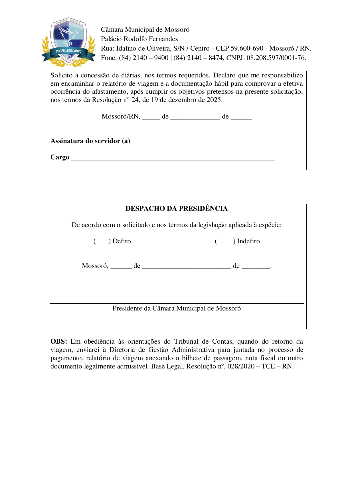 Art. 2º O Anexo I – Solicitação de Diárias deverá ser utilizado para todos os pedidos de deslocamento, devendo ser devidamente preenchido pelo interessado e encaminhado à Presidência da Câmara, observado o prazo e os requisitos estabelecidos na Resolução nº 24/2025.