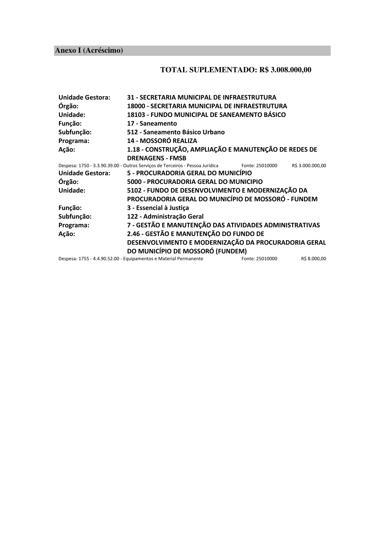 Art. 1º Fica aberto, no corrente exercício, Crédito Suplementar por Superávit Financeiro no valor de R$ 3.008.000,00 (três milhões e oito mil reais) às dotações especificadas no Anexo I deste Decreto.
