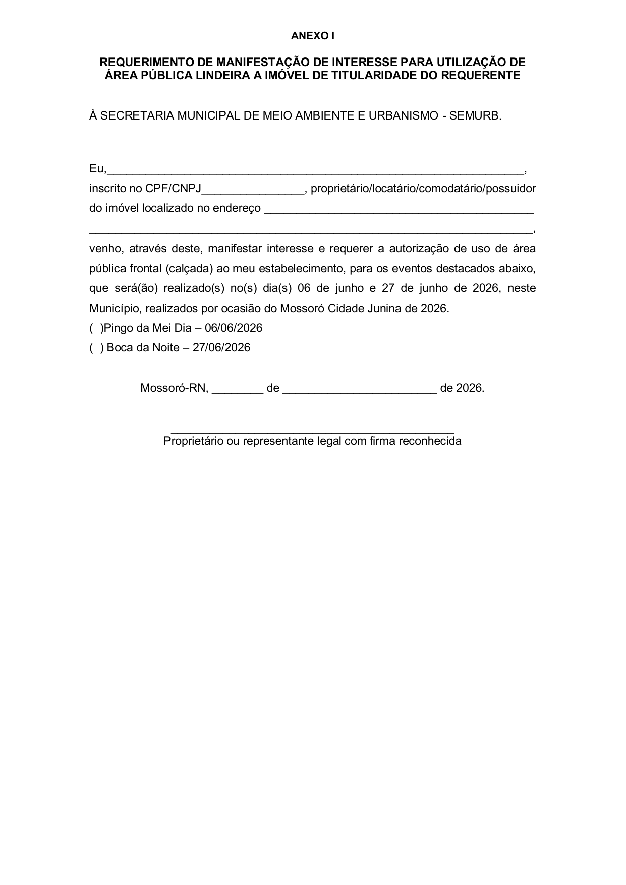Art. 8º O procedimento de cadastramento para os pretensos autorizatários que manifestarem interesse na utilização dos passeios públicos lindeiros ao respectivo imóvel, desde que situados em áreas passíveis de credenciamento e não compreendidas nas hipóteses de exclusão previstas no art. 7º deste Decreto, será realizado nos dias 06, 07 e 08 de abril de 2026, das 8h às 12h e de 14h às 17h, no Auditório da Estação das Artes Eliseu Ventania, situado na Av. Rio Branco, sn, Centro, Mossoró/RN, ou por meio do link <https://forms.gle/nvhq7m6MkJFUtXqj7>, mediante comprovação da propriedade ou da posse do imóvel localizado no trecho do perímetro oficial dos polos “Pingo da Mei Dia” e “Boca da Noite”.