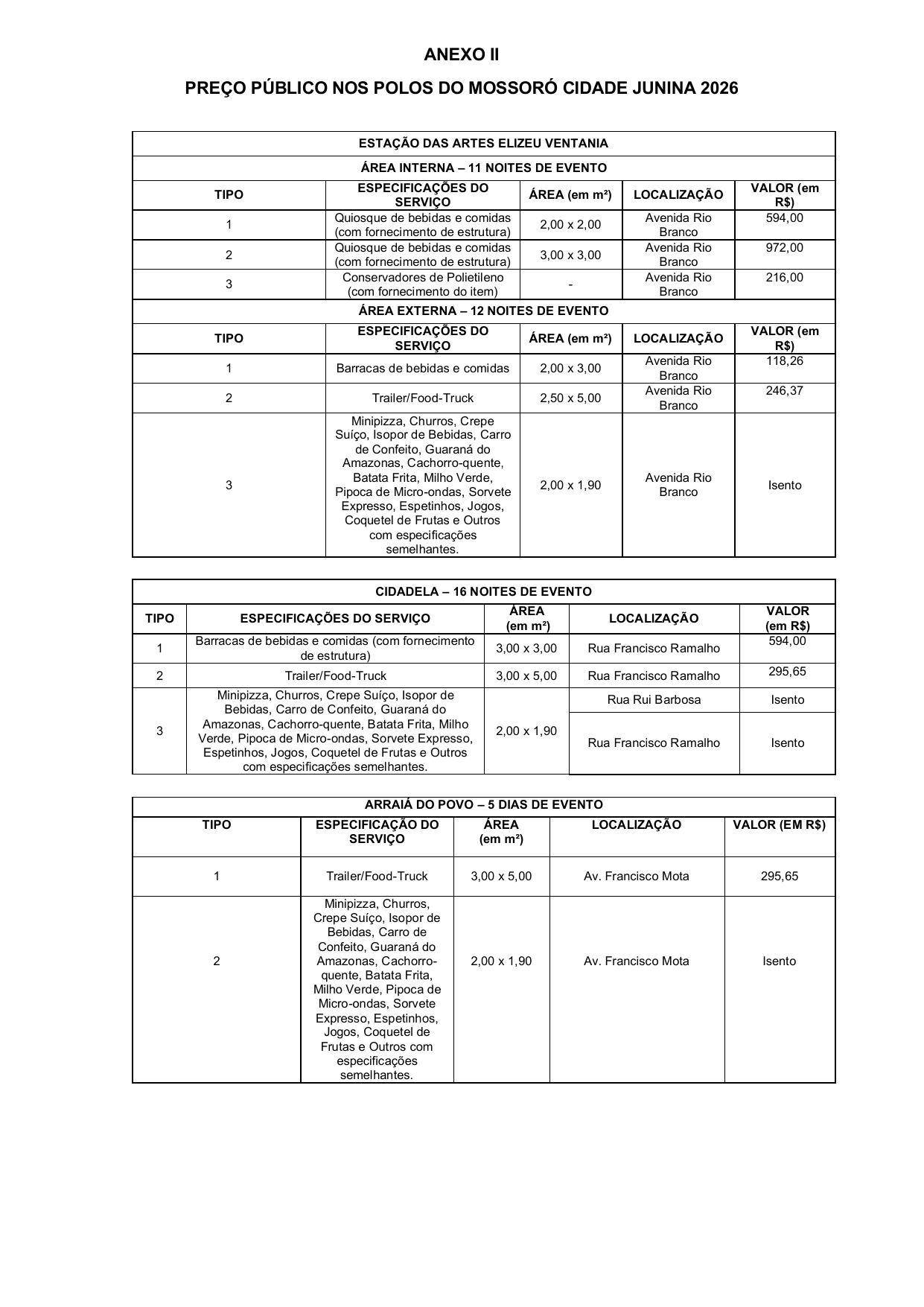 Art. 7º. Não serão disponibilizados para fins de credenciamento e autorização de uso por particulares os espaços públicos abaixo relacionados, em razão de sua relevância estratégica para a organização, operacionalização, logística, segurança, circulação e apoio institucional ao Mossoró Cidade Junina 2026:
