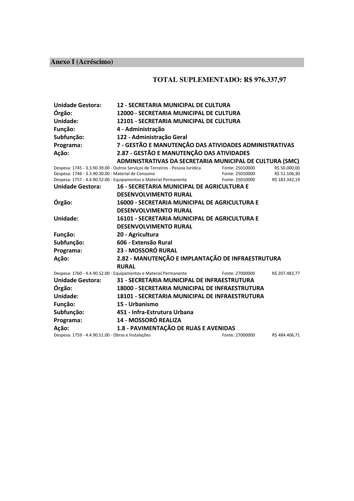 Art. 1º Fica aberto, no corrente exercício, Crédito Suplementar por Superávit Financeiro no valor de R$ 976.337,97 (novecentos e setenta e seis mil e trezentos e trinta e sete reais e noventa e sete centavos) às dotações especificadas no Anexo I deste Decreto.
