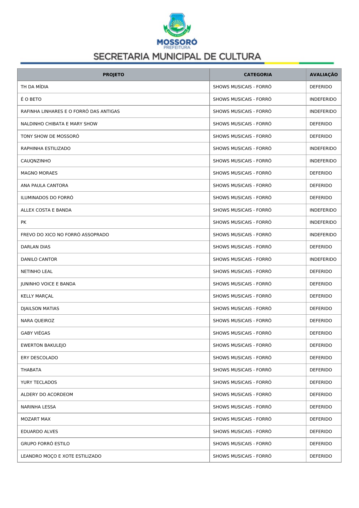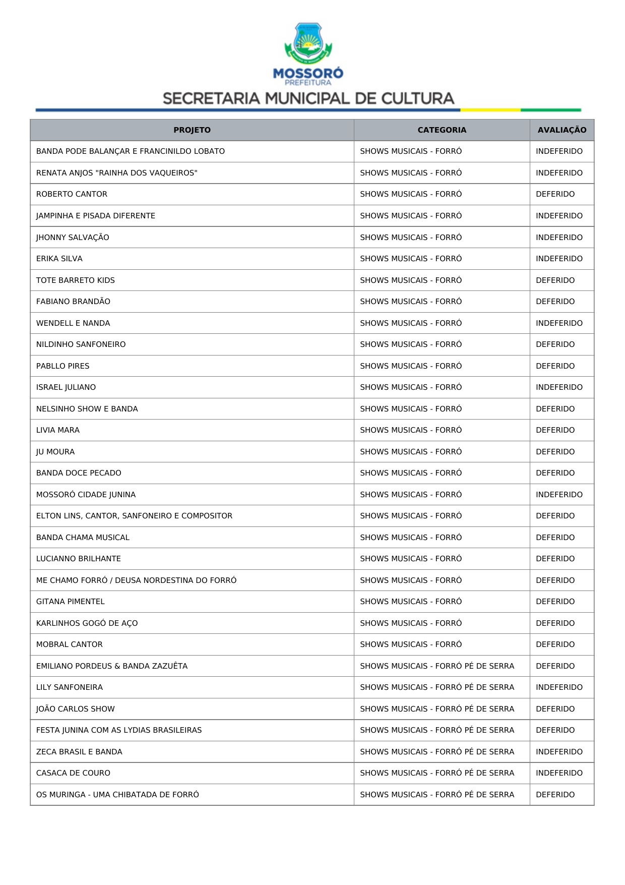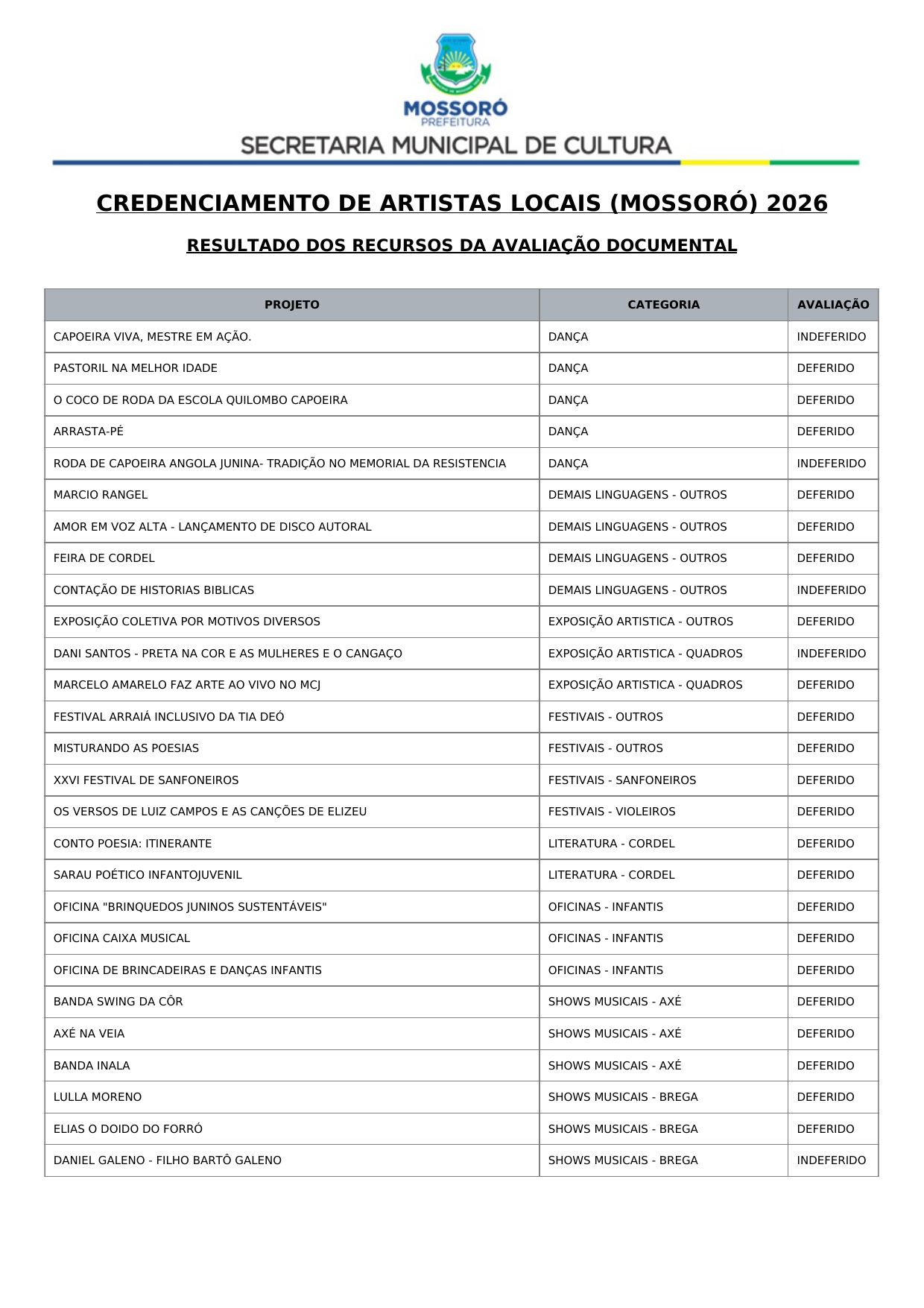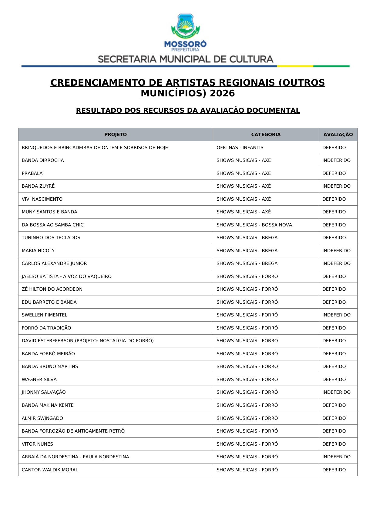 Art. 1º Tornar público o Resultado Recursal Definitivo oriundo da Análise Documental do Credenciamento de propostas de artistas, músicos e profissionais de arte e cultura para compor a programação dos eventos Mossoró Cidade Junina 2026 e Mossoró Sal e Luz 2026, conforme lista abaixo: