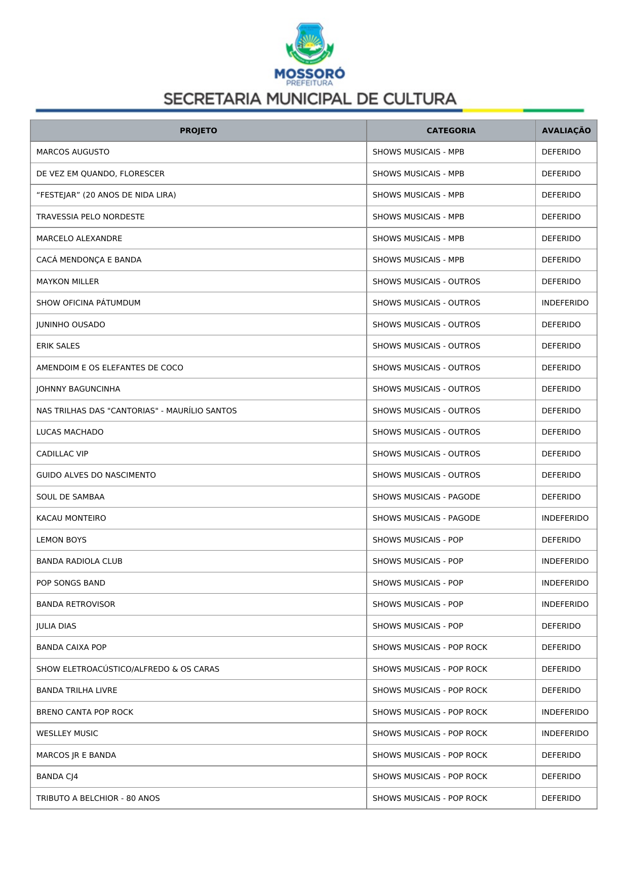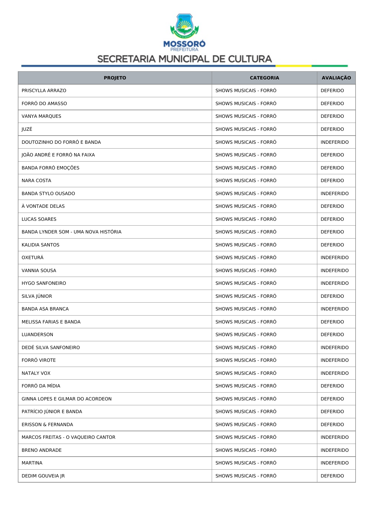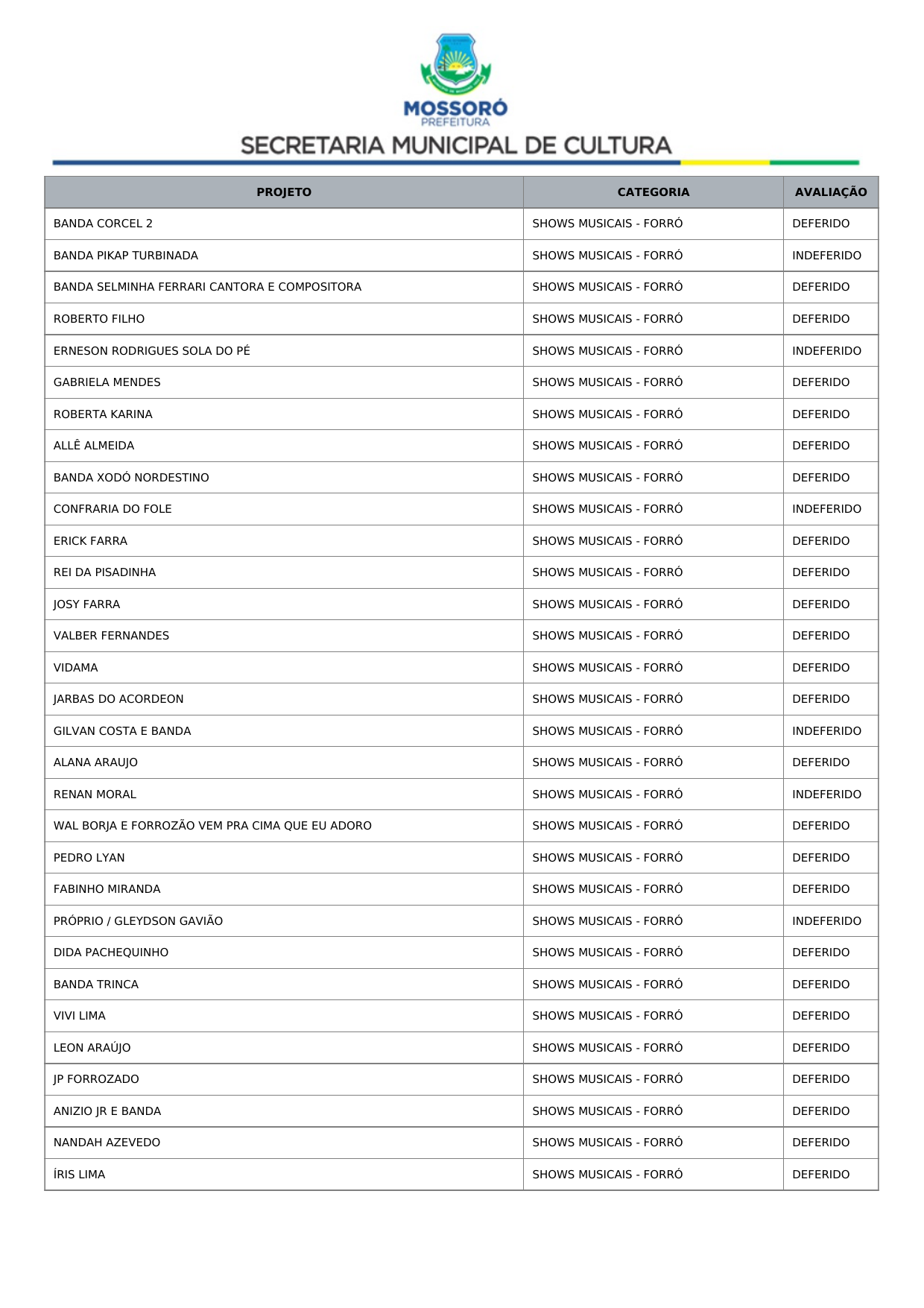 Art. 1º Tornar público o Resultado Recursal Definitivo oriundo da Análise Documental do Credenciamento de propostas de artistas, músicos e profissionais de arte e cultura para compor a programação dos eventos Mossoró Cidade Junina 2026 e Mossoró Sal e Luz 2026, conforme lista abaixo: