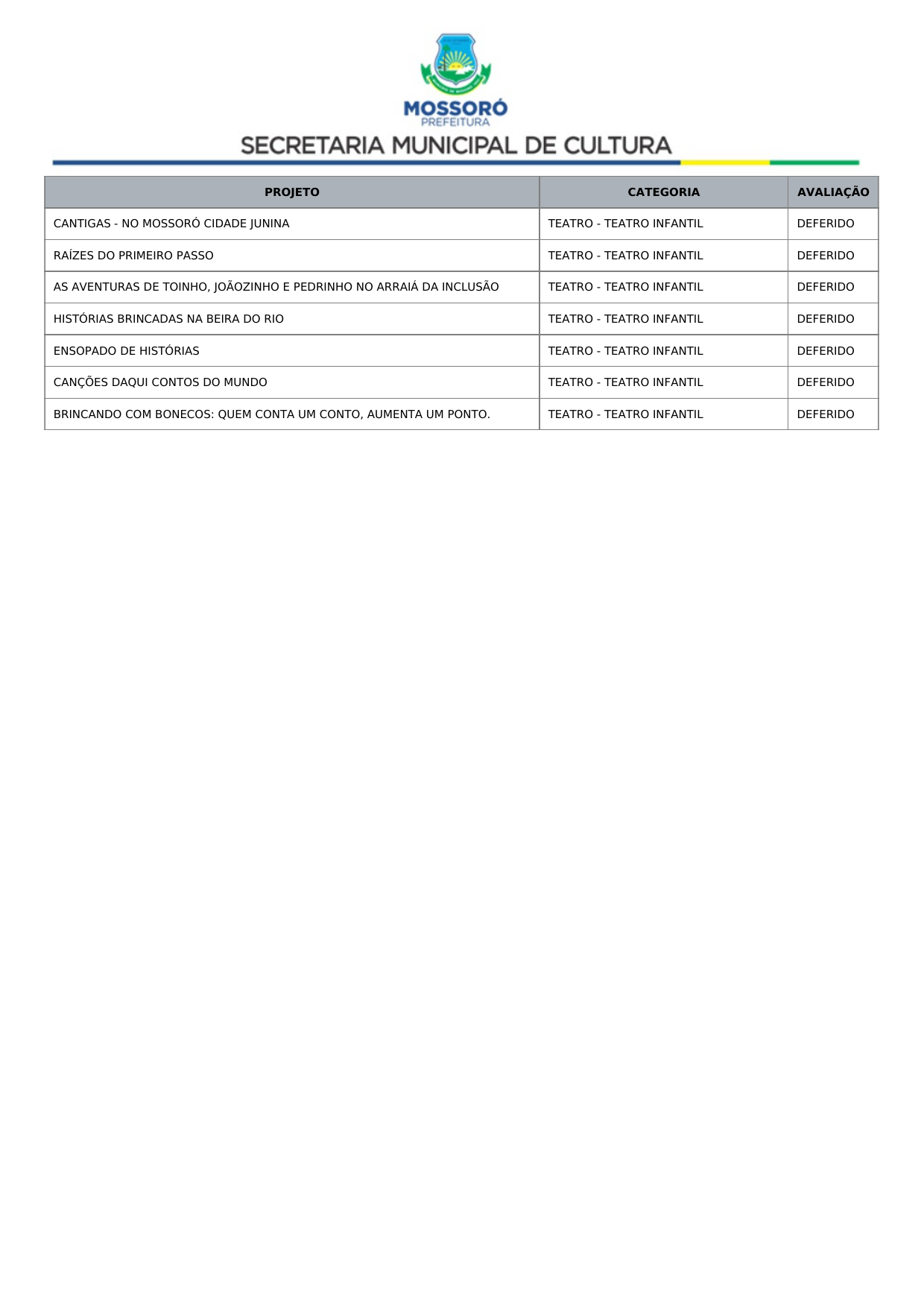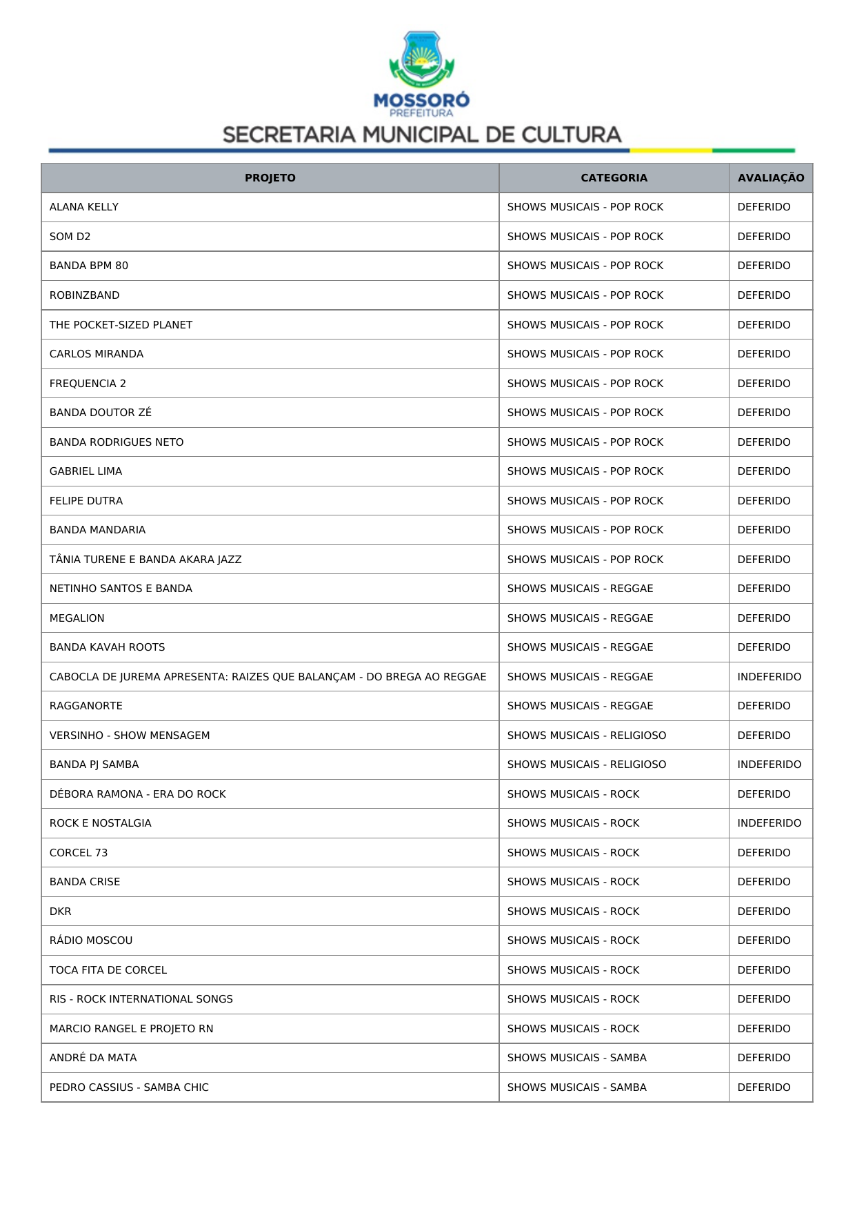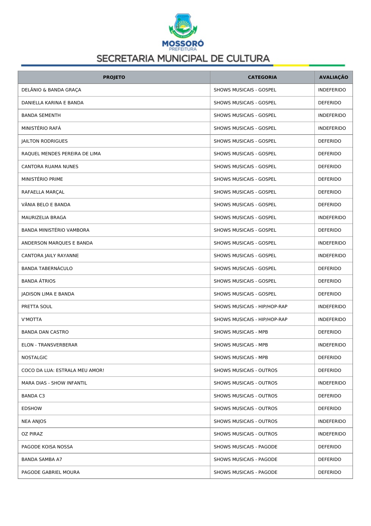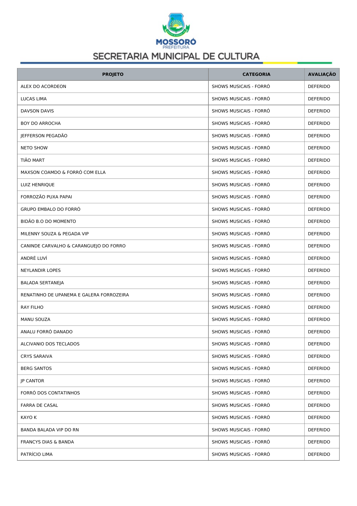 Art. 1º Tornar público o Resultado Recursal Definitivo oriundo da Análise Documental do Credenciamento de propostas de artistas, músicos e profissionais de arte e cultura para compor a programação dos eventos Mossoró Cidade Junina 2026 e Mossoró Sal e Luz 2026, conforme lista abaixo: