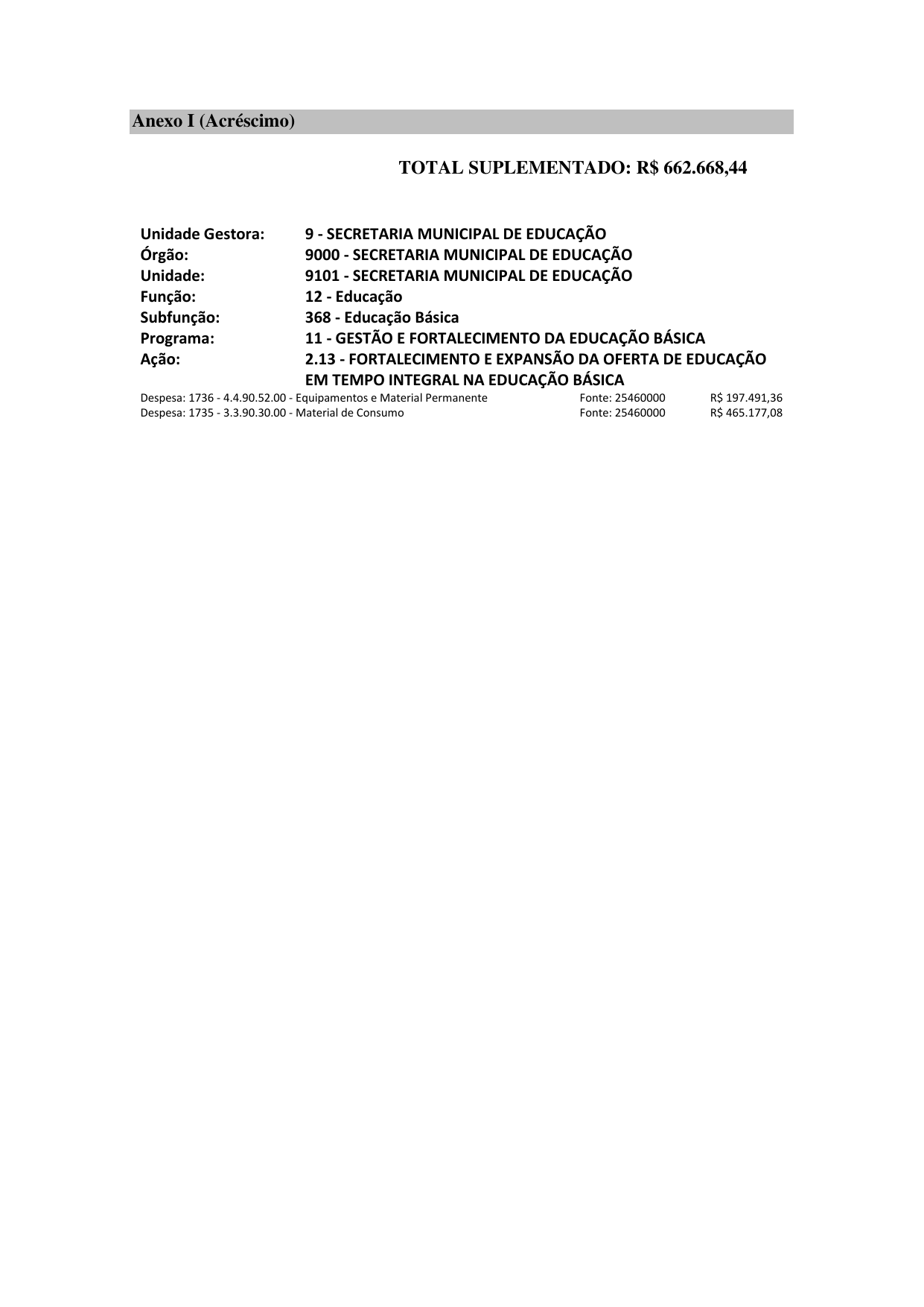 Art. 1º Fica aberto, no corrente exercício, Crédito Suplementar por Superávit Financeiro no valor de R$ 662.668,44 (seiscentos e sessenta e dois mil e seiscentos e sessenta e oito reais e quarenta e quatro centavos) às dotações especificadas no Anexo I deste Decreto.